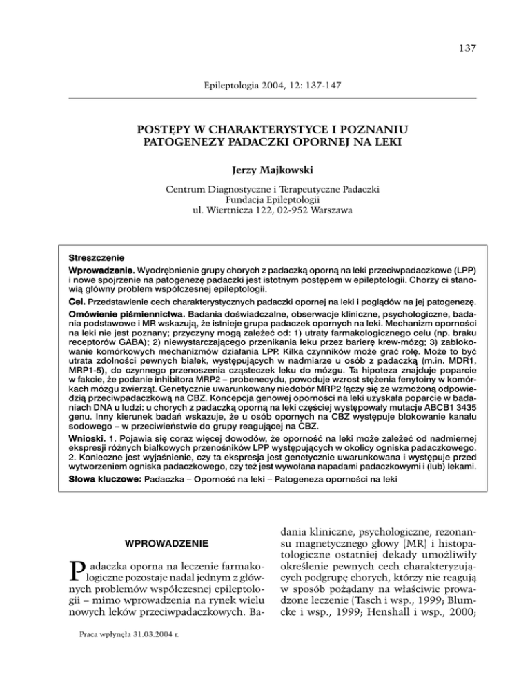 137 Epileptologia 2004, 12: 137-147 POSTĘPY W CHARAKTERYSTYCE I POZNANIU PATOGENEZY PADACZKI OPORNEJ NA LEKI Jerzy Majkowski Centrum Diagnostyczne i Terapeutyczne Padaczki Fundacja Epileptologii ul. Wiertnicza 122, 02-952 Warszawa Streszczenie Wprowadzenie. Wyodrębnienie grupy chorych z padaczką oporną na leki przeciwpadaczkowe (LPP) i nowe spojrzenie na patogenezę padaczki jest istotnym postępem w epileptologii. Chorzy ci stanowią główny problem współczesnej epileptologii. Cel. Przedstawienie cech charakterystycznych padaczki opornej na leki i poglądów na jej patogenezę. Omówienie piśmiennictwa. Badania doświadczalne, obserwacje kliniczne, psychologiczne, badania podstawowe i MR wskazują, że istnieje grupa padaczek opornych na leki. Mechanizm oporności na leki nie jest poznany; przyczyny mogą zależeć od: 1) utraty farmakologicznego celu (np. braku receptorów GABA); 2) niewystarczającego przenikania leku przez barierę krew-mózg; 3) zablokowanie komórkowych mechanizmów działania LPP. Kilka czynników może grać rolę. Może to być utrata zdolności pewnych białek, występujących w nadmiarze u osób z padaczką (m.in. MDR1, MRP1-5), do czynnego przenoszenia cząsteczek leku do mózgu. Ta hipoteza znajduje poparcie w fakcie, że podanie inhibitora MRP2 – probenecydu, powoduje wzrost stężenia fenytoiny w komórkach mózgu zwierząt. Genetycznie uwarunkowany niedobór MRP2 łączy się ze wzmożoną odpowiedzią przeciwpadaczkową na CBZ. Koncepcja genowej oporności na leki uzyskała poparcie w badaniach DNA u ludzi: u chorych z padaczką oporną na leki częściej występowały mutacje ABCB1 3435 genu. Inny kierunek badań wskazuje, że u osób opornych na CBZ występuje blokowanie kanału sodowego – w przeciwieństwie do grupy reagującej na CBZ. Wnioski. 1. Pojawia się coraz więcej dowodów, że oporność na leki może zależeć od nadmiernej ekspresji różnych białkowych przenośników LPP występujących w okolicy ogniska padaczkowego. 2. Konieczne jest wyjaśnienie, czy ta ekspresja jest genetycznie uwarunkowana i występuje przed wytworzeniem ogniska padaczkowego, czy też jest wywołana napadami padaczkowymi i (lub) lekami. Słowa kluczowe: Padaczka – Oporność na leki – Patogeneza oporności na leki WPROWADZENIE P adaczka oporna na leczenie farmakologiczne pozostaje nadal jednym z głównych problemów współczesnej epileptologii – mimo wprowadzenia na rynek wielu nowych leków przeciwpadaczkowych. BaPraca wpłynęła 31.03.2004 r. dania kliniczne, psychologiczne, rezonansu magnetycznego głowy (MR) i histopatologiczne ostatniej dekady umożliwiły określenie pewnych cech charakteryzujących podgrupę chorych, którzy nie reagują w sposób pożądany na właściwie prowadzone leczenie (Tasch i wsp., 1999; Blumcke i wsp., 1999; Henshall i wsp., 2000;