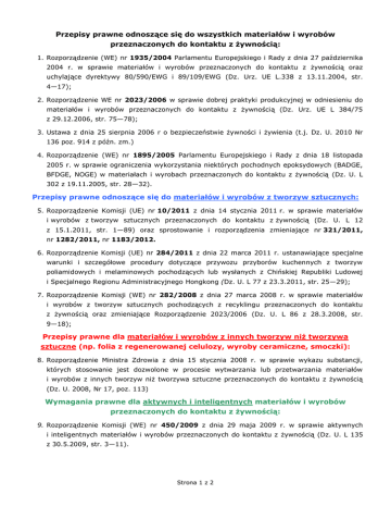 Przepisy prawne odnoszące się do wszystkich materiałów i wyrobów przeznaczonych do kontaktu z żywnością: 1. Rozporządzenie (WE) nr 1935/2004 Parlamentu Europejskiego i Rady z dnia 27 października 2004 r. w sprawie materiałów i wyrobów przeznaczonych do kontaktu z żywnością oraz uchylające dyrektywy 80/590/EWG i 89/109/EWG (Dz. Urz. UE L.338 z 13.11.2004, str. 4—17); 2. Rozporządzenie WE nr 2023/2006 w sprawie dobrej praktyki produkcyjnej w odniesieniu do materiałów i wyrobów przeznaczonych do kontaktu z żywnością (Dz. Urz. UE L 384/75 z 29.12.2006, str. 75—78); 3. Ustawa z dnia 25 sierpnia 2006 r o bezpieczeństwie żywności i żywienia (t.j. Dz. U. 2010 Nr 136 poz. 914 z późn. zm.) 4. Rozporządzenie (WE) nr 1895/2005 Parlamentu Europejskiego i Rady z dnia 18 listopada 2005 r. w sprawie ograniczenia wykorzystania niektórych pochodnych epoksydowych (BADGE, BFDGE, NOGE) w materiałach i wyrobach przeznaczonych do kontaktu z żywnością (Dz. U. L 302 z 19.11.2005, str. 28—32). Przepisy prawne odnoszące się do materiałów i wyrobów z tworzyw sztucznych: 5. Rozporządzenie Komisji (UE) nr 10/2011 z dnia 14 stycznia 2011 r. w sprawie materiałów i wyrobów z tworzyw sztucznych przeznaczonych do kontaktu z żywnością (Dz. U. L 12 z 15.1.2011, str. 1—89) oraz sprostowanie i rozporządzenia zmieniające nr 321/2011, nr 1282/2011, nr 1183/2012. 6. Rozporządzenie Komisji (UE) nr 284/2011 z dnia 22 marca 2011 r. ustanawiające specjalne warunki i szczegółowe procedury dotyczące przywozu przyborów kuchennych z tworzyw poliamidowych i melaminowych pochodzących lub wysłanych z Chińskiej Republiki Ludowej i Specjalnego Regionu Administracyjnego Hongkong (Dz. U. L 77 z 23.3.2011, str. 25—29); 7. Rozporządzenie Komisji (WE) nr 282/2008 z dnia 27 marca 2008 r. w sprawie materiałów i wyrobów z tworzyw sztucznych pochodzących z recyklingu przeznaczonych do kontaktu z żywnością oraz zmieniające Rozporządzenie 2023/2006 (Dz. U. L 86 z 28.3.2008, str. 9—18); Przepisy prawne dla materiałów i wyrobów z innych tworzyw niż tworzywa sztuczne (np. folia z regenerowanej celulozy, wyroby ceramiczne, smoczki): 8. Rozporządzenie Ministra Zdrowia z dnia 15 stycznia 2008 r. w sprawie wykazu substancji, których stosowanie jest dozwolone w procesie wytwarzania lub przetwarzania materiałów i wyrobów z innych tworzyw niż tworzywa sztuczne przeznaczonych do kontaktu z żywnością (Dz. U. 2008, Nr 17, poz. 113) Wymagania prawne dla aktywnych i inteligentnych materiałów i wyrobów przeznaczonych do kontaktu z żywnością: 9. Rozporządzenie Komisji (WE) nr 450/2009 z dnia 29 maja 2009 r. w sprawie aktywnych i inteligentnych materiałów i wyrobów przeznaczonych do kontaktu z żywnością (Dz. U. L 135 z 30.5.2009, str. 3—11). Strona 1 z 2 Do materiałów i wyrobów przeznaczonych do kontaktu z żywnością stosuje się również przepisy prawa żywnościowego: 1. Rozporządzenie (WE) nr 178/2002 Parlamentu Europejskiego i Rady z dnia 28 stycznia 2002r. ustanawiające ogólne zasady i wymagania prawa żywnościowego, powołujące Europejski Urząd ds. Bezpieczeństwa Żywności oraz ustanawiające procedury w zakresie bezpieczeństwa żywności (Dz. Urz. L 31/1 z 01.02.2002). 2. Rozporządzenie (WE) nr 852/2004 Parlamentu Europejskiego i Rady z dnia 29 kwietnia 2004 r. w sprawie higieny środków spożywczych (Dz. Urz. L 139/1 z 29.04.2004). 3. Rozporządzenie (WE) nr 882/2004 Parlamentu Europejskiego i Rady z dnia 29 kwietnia 2004 r. w sprawie kontroli urzędowych przeprowadzanych w celu sprawdzenia zgodności z prawem paszowym i żywnościowym oraz regułami dotyczącymi zdrowia zwierząt i dobrostanu zwierząt (Dz. Urz. L 191/1 z 30.04.2004). Przygotowała: Anna Dąbrowa Strona 2 z 2