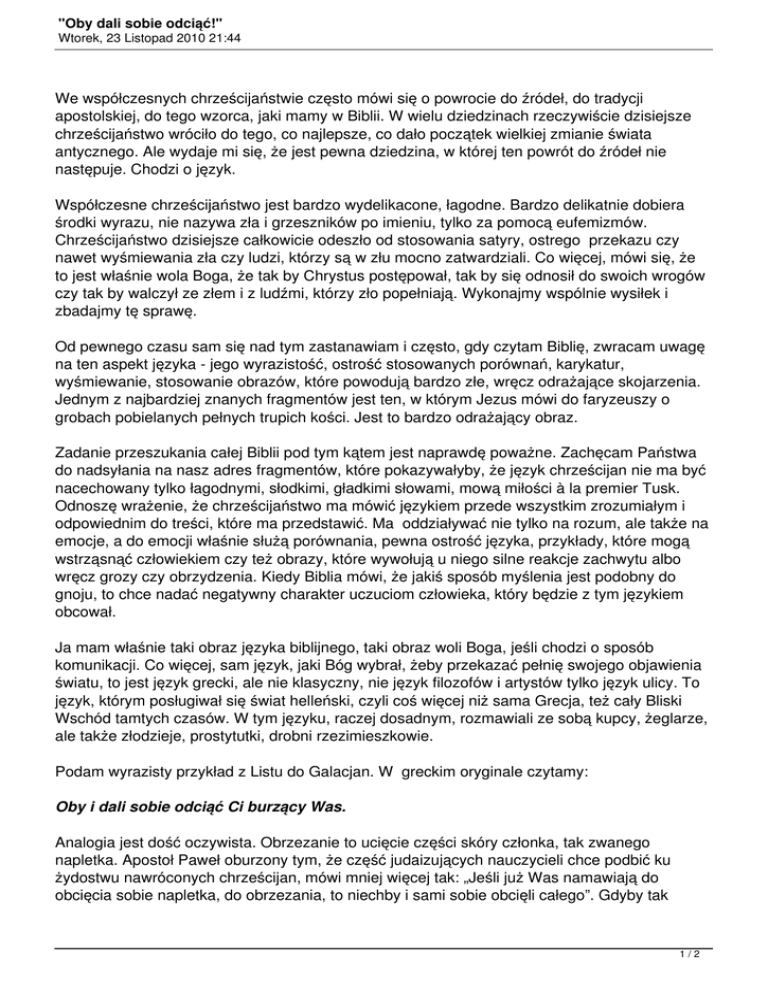 "Oby dali sobie odciąć!" Wtorek, 23 Listopad 2010 21:44 We współczesnych chrześcijaństwie często mówi się o powrocie do źródeł, do tradycji apostolskiej, do tego wzorca, jaki mamy w Biblii. W wielu dziedzinach rzeczywiście dzisiejsze chrześcijaństwo wróciło do tego, co najlepsze, co dało początek wielkiej zmianie świata antycznego. Ale wydaje mi się, że jest pewna dziedzina, w której ten powrót do źródeł nie następuje. Chodzi o język. Współczesne chrześcijaństwo jest bardzo wydelikacone, łagodne. Bardzo delikatnie dobiera środki wyrazu, nie nazywa zła i grzeszników po imieniu, tylko za pomocą eufemizmów. Chrześcijaństwo dzisiejsze całkowicie odeszło od stosowania satyry, ostrego przekazu czy nawet wyśmiewania zła czy ludzi, którzy są w złu mocno zatwardziali. Co więcej, mówi się, że to jest właśnie wola Boga, że tak by Chrystus postępował, tak by się odnosił do swoich wrogów czy tak by walczył ze złem i z ludźmi, którzy zło popełniają. Wykonajmy wspólnie wysiłek i zbadajmy tę sprawę. Od pewnego czasu sam się nad tym zastanawiam i często, gdy czytam Biblię, zwracam uwagę na ten aspekt języka - jego wyrazistość, ostrość stosowanych porównań, karykatur, wyśmiewanie, stosowanie obrazów, które powodują bardzo złe, wręcz odrażające skojarzenia. Jednym z najbardziej znanych fragmentów jest ten, w którym Jezus mówi do faryzeuszy o grobach pobielanych pełnych trupich kości. Jest to bardzo odrażający obraz. Zadanie przeszukania całej Biblii pod tym kątem jest naprawdę poważne. Zachęcam Państwa do nadsyłania na nasz adres fragmentów, które pokazywałyby, że język chrześcijan nie ma być nacechowany tylko łagodnymi, słodkimi, gładkimi słowami, mową miłości à la premier Tusk. Odnoszę wrażenie, że chrześcijaństwo ma mówić językiem przede wszystkim zrozumiałym i odpowiednim do treści, które ma przedstawić. Ma oddziaływać nie tylko na rozum, ale także na emocje, a do emocji właśnie służą porównania, pewna ostrość języka, przykłady, które mogą wstrząsnąć człowiekiem czy też obrazy, które wywołują u niego silne reakcje zachwytu albo wręcz grozy czy obrzydzenia. Kiedy Biblia mówi, że jakiś sposób myślenia jest podobny do gnoju, to chce nadać negatywny charakter uczuciom człowieka, który będzie z tym językiem obcował. Ja mam właśnie taki obraz języka biblijnego, taki obraz woli Boga, jeśli chodzi o sposób komunikacji. Co więcej, sam język, jaki Bóg wybrał, żeby przekazać pełnię swojego objawienia światu, to jest język grecki, ale nie klasyczny, nie język filozofów i artystów tylko język ulicy. To język, którym posługiwał się świat helleński, czyli coś więcej niż sama Grecja, też cały Bliski Wschód tamtych czasów. W tym języku, raczej dosadnym, rozmawiali ze sobą kupcy, żeglarze, ale także złodzieje, prostytutki, drobni rzezimieszkowie. Podam wyrazisty przykład z Listu do Galacjan. W greckim oryginale czytamy: Oby i dali sobie odciąć Ci burzący Was. Analogia jest dość oczywista. Obrzezanie to ucięcie części skóry członka, tak zwanego napletka. Apostoł Paweł oburzony tym, że część judaizujących nauczycieli chce podbić ku żydostwu nawróconych chrześcijan, mówi mniej więcej tak: „Jeśli już Was namawiają do obcięcia sobie napletka, do obrzezania, to niechby i sami sobie obcięli całego”. Gdyby tak 1/2 "Oby dali sobie odciąć!" Wtorek, 23 Listopad 2010 21:44 dzisiaj na kazaniu powiedział pastor, oczywiście wywołałoby to wzburzenie, ale proszę zajrzeć do Biblii, to jest język Biblii. A z dzisiejszej lektury polecam Psalm 68:22 : Zaiste, roztrzaska Bóg głowę wrogów swoich, włochaty łeb tego, który trwa w winach swoich. Bardzo spodobało mi się to określenie: włochaty łeb. Czyż nie jest to plastyczny obraz? Czyż nie jest to karykatura, którą można zobaczyć również na stronach naszego miesięcznika w postaci genialnych rysunków naszego grafika? Spróbujcie Państwo sobie wyobrazić włochaty łeb i pomyśleć, jakie wywołuje emocje i skojarzenia. To oczywiście jest język pisany, ale my możemy korzystać z różnych innych środków wyrazu, np. plastycznych. Te dwa przykłady podaję jako zachętę do przeszukiwania Biblii pod tym kątem. Zapraszam Państwa do pomocy w realizacji projektu, który ma służyć temu, by skierować wydelikaconych chrześcijan ku źródłu w sferze językowej. Proszę o nadsyłanie pod adresem: [email protected]. pl fragmentów Biblii, które łamałyby stereotyp języka chrześcijańskiego jako bardzo delikatnego karykaturalnych obrazów i ostrych słów. W naszej gazecie często stosujemy karykatury rysunkowe, za co jesteśmy krytykowani czy też napominani, że grzeszymy, robiąc to. Za jakiś czas, kiedy dużo takich przykładów będę miał na podorędziu, stworzymy z tego jakiś wspólny przekonujący tekst, artykuł, a może coś więcej, nawołujący chrześcijan do odejścia od landrynkowatego wyrażania treści, które są niekiedy bardzo poważnie i powinny być w silny, przekonujący i wzbudzający emocje sposób przekazywane. Inaczej tracą swój sens. 2/2