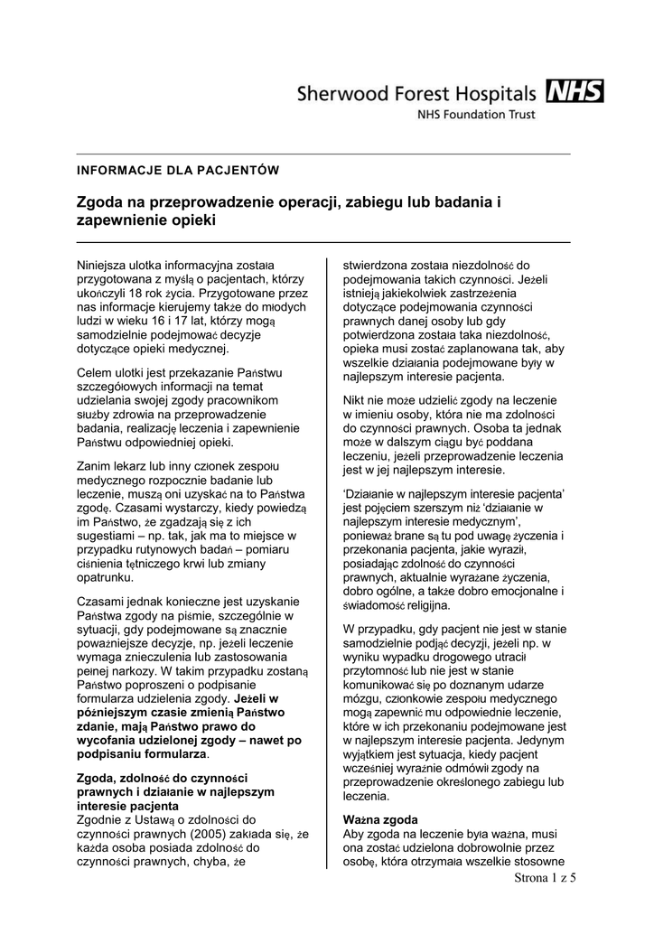 INFORMACJE DLA PACJENTÓW Zgoda na przeprowadzenie operacji, zabiegu lub badania i zapewnienie opieki Niniejsza ulotka informacyjna została przygotowana z myślą o pacjentach, którzy ukończyli 18 rok życia. Przygotowane przez nas informacje kierujemy także do młodych ludzi w wieku 16 i 17 lat, którzy mogą samodzielnie podejmować decyzje dotyczące opieki medycznej. Celem ulotki jest przekazanie Państwu szczegółowych informacji na temat udzielania swojej zgody pracownikom służby zdrowia na przeprowadzenie badania, realizację leczenia i zapewnienie Państwu odpowiedniej opieki. Zanim lekarz lub inny członek zespołu medycznego rozpocznie badanie lub leczenie, muszą oni uzyskać na to Państwa zgodę. Czasami wystarczy, kiedy powiedzą im Państwo, że zgadzają się z ich sugestiami – np. tak, jak ma to miejsce w przypadku rutynowych badań – pomiaru ciśnienia tętniczego krwi lub zmiany opatrunku. Czasami jednak konieczne jest uzyskanie Państwa zgody na piśmie, szczególnie w sytuacji, gdy podejmowane są znacznie poważniejsze decyzje, np. jeżeli leczenie wymaga znieczulenia lub zastosowania pełnej narkozy. W takim przypadku zostaną Państwo poproszeni o podpisanie formularza udzielenia zgody. Jeżeli w późniejszym czasie zmienią Państwo zdanie, mają Państwo prawo do wycofania udzielonej zgody – nawet po podpisaniu formularza. Zgoda, zdolność do czynności prawnych i działanie w najlepszym interesie pacjenta Zgodnie z Ustawą o zdolności do czynności prawnych (2005) zak łada się, że każda osoba posiada zdolno ść do czynności prawnych, chyba, że stwierdzona została niezdolność do podejmowania takich czynności. Jeżeli istnieją jakiekolwiek zastrzeżenia dotyczące podejmowania czynności prawnych danej osoby lub gdy potwierdzona została taka niezdolność, opieka musi zostać zaplanowana tak, aby wszelkie działania podejmowane były w najlepszym interesie pacjenta. Nikt nie może udzielić zgody na leczenie w imieniu osoby, która nie ma zdolności do czynności prawnych. Osoba ta jednak może w dalszym ciągu być poddana leczeniu, jeżeli przeprowadzenie leczenia jest w jej najlepszym interesie. ‘Działanie w najlepszym interesie pacjenta’ jest pojęciem szerszym niż ‘działanie w najlepszym interesie medycznym’, ponieważ brane są tu pod uwagę życzenia i przekonania pacjenta, jakie wyraził, posiadając zdolność do czynności prawnych, aktualnie wyrażane życzenia, dobro ogólne, a także dobro emocjonalne i świadomość religijna. W przypadku, gdy pacjent nie jest w stanie samodzielnie podjąć decyzji, jeżeli np. w wyniku wypadku drogowego utracił przytomność lub nie jest w stanie komunikować się po doznanym udarze mózgu, członkowie zespołu medycznego mogą zapewnić mu odpowiednie leczenie, które w ich przekonaniu podejmowane jest w najlepszym interesie pacjenta. Jedynym wyjątkiem jest sytuacja, kiedy pacjent wcześniej wyraźnie odmówił zgody na przeprowadzenie określonego zabiegu lub leczenia. Ważna zgoda Aby zgoda na leczenie była ważna, musi ona zostać udzielona dobrowolnie przez osobę, która otrzymała wszelkie stosowne Strona 1 z 5 informacje i posiada zdolność do podejmowania świadomych decyzji dotyczących proponowanego zabiegu operacyjnego, badania, leczenia lub opieki. Może to być pacjent lub osoba posiadające stosowne upoważnienie wydane na mocy pełnomocnictwa lub wyroku sądu. Jeżeli ktoś zdaje się podejmować całkowicie nieprzemyślane decyzje, nie oznacza to, że nie posiada zdolności do czynności prawnych, ale wskazuje, że konieczne może okazać się udzielenie dalszych informacji lub wyjaśnień. Co muszę wiedzieć zanim podejmę decyzję? Członkowie zespołu medycznego muszą zapewnić, że przed podjęciem decyzji otrzymali Państwo wszelkie stosowne informacje na temat leczenia. W sytuacji, kiedy wymagana jest pisemna zgoda, takie informacje zostaną umieszczone w formularzu zgody, którego kopię Państwo otrzymają, a także przedyskutują z Państwem dostępne formy leczenia. Prosimy mieć na uwadze, że mogą oni rekomendować jedną z metod leczenia, jednak zawsze mają Państwo prawo wybrać inną. Każdy z nas ma inne podejście do poszczególnych aspektów leczenia, jak np. poziomu ryzyka lub bólu, jakie jest gotowy zaakceptować. Podobnie ma to miejsce w przypadku informacji. Jeżeli woleliby państwo nie wiedzieć o pewnych aspektach leczenia, prosimy śmiało porozmawiać na temat Państwa obaw z osobą odpowiedzialną za leczenie. Czy warto zadawać pytania? Prosimy zadać pytania, szczególnie w sytuacji, gdy konieczne jest podjęcie poważniejszych decyzji. Jeżeli okaże się to pomocne, mogą Państwo zapisywać pytania w przygotowanym do tego miejscu na końcu ulotki. Osoba, której zadają Państwo pytania, powinna postarać się na nie odpowiedzieć lub, jeżeli nie posiada informacji umożliwiających udzielenie odpowiedzi, poszukać kogoś, kto będzie w stanie porozmawiać z Państwem na temat ich obaw. Mogą Państwo poprosić przyjaciela lub członka rodziny, aby przyszedł z Państwem na spotkanie. Prosimy zapytać, jeżeli chcieliby Państwo prosić osobę niezależną o zadawanie pytań w Państwa imieniu. Współpraca Członkowie zespołu medycznego są zobowiązani do wysłuchania Państwa obaw i udzielenia możliwie jak najbardziej szczegółowych odpowiedzi na Państwa pytania, a nie wyłącznie przekazania Państwu stosownych informacji. Przed kolejną wizytą lub zabiegiem operacyjnym, leczeniem czy badaniem mogą Państwo zapisać nurtujące ich pytania w przygotowanym do tego miejscu na końcu ulotki. Opiekujący się Państwem zespół medyczny powinien przyjąć wszelkie wyrażane przez Państwa obawy i spostrzeżenia oraz szczegółowo omówić poszczególne aspekty leczenia, aby w ten sposób mogli oni nawiązać z Państwem współpracę, dzięki której możliwe będzie osiągnięcie najlepszych wyników. Pytania d