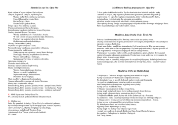 Litania ku czci św. Ojca Pio Kyrie elejson. Chryste elejson. Kyrie elejson. Chryste, usłysz nas. Chryste, wysłuchaj nas. Ojcze z nieba Boże, zmiłuj się nad nami. Synu, Odkupicielu świata, Boże, Duchu Święty, Boże, Święta Trójco, jedyny Boże, Święty Ojcze Pio, módl się za nami. Wierny natchnieniom Ducha Świętego, Rozmiłowany w pokorze i ubóstwie Jezusa Chrystusa, Gorliwy kapłanie Jezusa Chrystusa, Wierny naśladowco św. Franciszka z Asyżu, W ciele swoim noszący znamiona męki Zbawiciela, Cieszący się nadprzyrodzonymi darami, Ozdobo zakonu franciszkańskiego, Niosący światu dobro i pokój, Wybrane naczynie świętości i łaski, Niezmordowany w jednaniu grzeszników z Bogiem, Postrachu duchów piekielnych, Zdobywający serca prostotą i mocą Słowa Bożego, Nauczający bardziej przykładem niż słowem, Wzorze miłości Boga i bliźniego, Spotykający Chrystusa w każdym człowieku, Opiekunie cierpiących, Pociecho nieszczęśliwych, Znoszący upokorzenia z cierpliwością, Mężny wśród przeciwności, Wzorze franciszkańskiego ubóstwa, Wzorze czystości kapłańskiej, Mężu doskonałego posłuszeństwa, Miłośniku życia ukrytego, Mężu modlitwy, skupienia i kontemplacji, Nauczycielu modlitwy garnących się do Chrystusa, Możny nasz orędowniku u Boga, Baranku Boży, który gładzisz grzechy świata - przepuść nam, Panie! Baranku Boży, który gładzisz grzechy świata - wysłuchaj nas, Panie! Baranku Boży, który gładzisz grzechy świata - zmiłuj się nad nami! K.: Módl się za nami święty Ojcze Pio. W.: Abyśmy się stali godnymi obietnic Chrystusowych. K.: Módlmy się: Boże, Ty sprawiłeś, że święty Ojciec Pio żył w ubóstwie i pokorze, by w ten sposób upodobnić się do Twojego Syna, Jezusa Chrystusa; spraw, prosimy Cię, abyśmy postępując tą samą drogą, z jego pomocą naśladowali Twojego Syna i zjednoczyli się z Tobą w pełni wesela i miłości. W.: Amen. Modlitwa o łaski za przyczyną św. Ojca Pio O Jezu, pełen łaski i miłosierdzia, Ty dla zbawienia dusz ludzkich podjąłeś mękę i umarłeś na krzyżu, aby wyjednać przebaczenie grzechów; pokornie błagam Cię: za przyczyną św. Ojca Pio, kapłana i stygmatyka, który wielkodusznie Ci służył, poświęcał swe życie i cierpiał dla ratowania grzeszników, udziel mi przebaczenia moich win i łaski, o którą pokornie proszę... Dla większej chwały Twojej racz przyciągnąć wszystkich ludzi do swego miłującego Serca. Który żyjesz i królujesz na wieki wieków. Amen. Modlitwa Jana Pawła II do Św.O.Pio Pokorny i umiłowany Ojcze Pio: Prosimy, naucz także nas pokory serca, abyśmy zostali zaliczeni do grona prostaczków z Ewangelii, którym Ojciec obiecał objawić tajemnice swojego Królestwa. Pomóż nam, byśmy modlili się niestrudzenie i byli pewni tego, że Bóg wie, czego nam potrzeba, zanim jeszcze Go o to poprosimy. Daj nam spojrzenie wiary, abyśmy potrafili od razu rozpoznawać w ubogich i cierpiących oblicze samego Jezusa. Wspieraj nas w godzinie walki i próby, a jeśli upadniemy, spraw, abyśmy doświadczyli radości płynącej z sakramentu pojednania. Przekaż nam twoje serdeczne przywiązanie do Maryi, Matki Jezusa i naszej Matki. Towarzysz nam w ziemskiej pielgrzymce do szczęśliwej Ojczyzny, do której również my mamy nadzieję dojść, aby na wieki kontemplować chwałę Ojca, Syna i Ducha Świętego. Amen Modlitwa O.Pio do Matki Bożej O Najświętsza Dziewico Maryjo, wyjednaj nam miłość do krzyża, byśmy uczestniczyli w katuszach i cierpieniach Jezusa. Ty, któraś pierwsza w sposób doskonały zachowywała całą Ewangelię i to z całym radykalizmem, któraś uczyniła to wcześniej, nim Ewangelia została napisana, wyjednaj nam tę łaskę, byśmy zawsze byli blisko Pana. O Maryjo, wyjednaj nam tę łaskę u swego Syna, byśmy mogli ułożyć całe nasze życie według pragnień Serca Bożego, byśmy mogli całe nasze życie wewnętrzne ukryć w Nim. O Najdroższa Matko spraw, byśmy tak ściśle zjednoczyli się z Jezusem, by żadna moc, żadna rzecz tego nędznego świata nie mogła nas od Niego odłączyć. O Maryjo spraw, byśmy zawsze byli blisko tej nieskończonej miłości – Jezusa, byśmy zawsze byli synami Bożymi wśród tego świata. Ty, któraś przyszła na ten świat bez żadnej zmazy, wyjednaj nam u Syna swego tę łaskę, byśmy mogli bez żadnej winy odejść z tego świata i zostali wprowadzeni do chwały Królestwa Ojca, Syna i Ducha Świętego, do wspólnoty Odkupionych, Aniołów i Świętych. Pod Twoją obronę… Nowenna do Św. O.Pio DZIEŃ PIERWSZY Święty Ojcze Pio, z przekonaniem uczyłeś, że Opatrzność Boża «mieszając radość ze łzami w życiu ludzi i całych narodów prowadzi do osiągnięcia ostatecznego celu; że za widoczną ręką człowieka jest zawsze ukryta ręka Boga», wstawiaj się za mną, bym w mojej trudnej sprawie..., którą przedstawiam Bogu, przyjął z wiarą Jego wolę. Ojcze nasz... Zdrowaś... Chwała Ojcu... DZIEŃ DRUGI Święty Ojcze Pio, ty zachęcałeś małodusznych do porzucenia lęku i uznania się za najszczęśliwszych, gdy «staną się godni tego, by uczestniczyć w bólach Boga-Człowieka«, by «wierzyli, że to nie opuszczenie, ale wielka miłość Boga», ośmielony przykładem twojej ufności wobec Boga, proszę o wstawiennictwo w mojej intencji..., którą ci przedkładam. Ojcze nasz... Zdrowaś... Chwała Ojcu... DZIEŃ TRZECI Święty Ojcze Pio, ty przez codzienne dźwiganie krzyża zasłużyłeś na miano Cyrenejczyka, wierzyłeś, że «Pan w swoim miłosierdziu poda rękę i obdarzy mocą», módl się za mną w moich trudnościach... i uproś mi u Jezusa łaskę wytrwania w dobrym. Ojcze nasz... Zdrowaś... Chwała Ojcu... DZIEŃ CZWARTY Święty Ojcze Pio, doświadczany z woli Bożej wielkim cierpieniem, przyjmowałeś je «jako los wybranych dusz» i «dar prowadzący do zbawienia», wstawiaj się za mną u Boga, abym mógł z godno