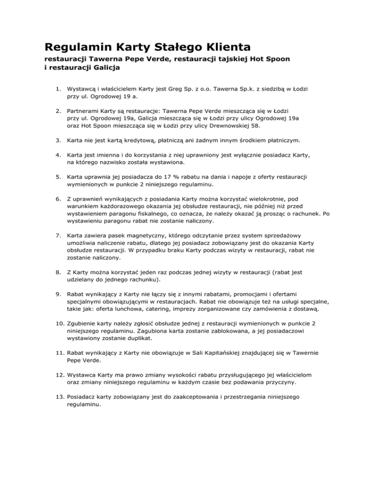 Regulamin Karty Stałego Klienta restauracji Tawerna Pepe Verde, restauracji tajskiej Hot Spoon i restauracji Galicja 1. Wystawcą i właścicielem Karty jest Greg Sp. z o.o. Tawerna Sp.k. z siedzibą w Łodzi przy ul. Ogrodowej 19 a. 2. Partnerami Karty są restauracje: Tawerna Pepe Verde mieszcząca się w Łodzi przy ul. Ogrodowej 19a, Galicja mieszcząca się w Łodzi przy ulicy Ogrodowej 19a oraz Hot Spoon mieszcząca się w Łodzi przy ulicy Drewnowskiej 58. 3. Karta nie jest kartą kredytową, płatniczą ani żadnym innym środkiem płatniczym. 4. Karta jest imienna i do korzystania z niej uprawniony jest wyłącznie posiadacz Karty, na którego nazwisko została wystawiona. 5. Karta uprawnia jej posiadacza do 17 % rabatu na dania i napoje z oferty restauracji wymienionych w punkcie 2 niniejszego regulaminu. 6. Z uprawnień wynikających z posiadania Karty można korzystać wielokrotnie, pod warunkiem każdorazowego okazania jej obsłudze restauracji, nie później niż przed wystawieniem paragonu fiskalnego, co oznacza, że należy okazać ją prosząc o rachunek. Po wystawieniu paragonu rabat nie zostanie naliczony. 7. Karta zawiera pasek magnetyczny, którego odczytanie przez system sprzedażowy umożliwia naliczenie rabatu, dlatego jej posiadacz zobowiązany jest do okazania Karty obsłudze restauracji. W przypadku braku Karty podczas wizyty w restauracji, rabat nie zostanie naliczony. 8. Z Karty można korzystać jeden raz podczas jednej wizyty w restauracji (rabat jest udzielany do jednego rachunku). 9. Rabat wynikający z Karty nie łączy się z innymi rabatami, promocjami i ofertami specjalnymi obowiązującymi w restauracjach. Rabat nie obowiązuje też na usługi specjalne, takie jak: oferta lunchowa, catering, imprezy zorganizowane czy zamówienia z dostawą. 10. Zgubienie karty należy zgłosić obsłudze jednej z restauracji wymienionych w punkcie 2 niniejszego regulaminu. Zagubiona karta zostanie zablokowana, a jej posiadaczowi wystawiony zostanie duplikat. 11. Rabat wynikający z Karty nie obowiązuje w Sali Kapitańskiej znajdującej się w Tawernie Pepe Verde. 12. Wystawca Karty ma prawo zmiany wysokości rabatu przysługującego jej właścicielom oraz zmiany niniejszego regulaminu w każdym czasie bez podawania przyczyny. 13. Posiadacz karty zobowiązany jest do zaakceptowania i przestrzegania niniejszego regulaminu.