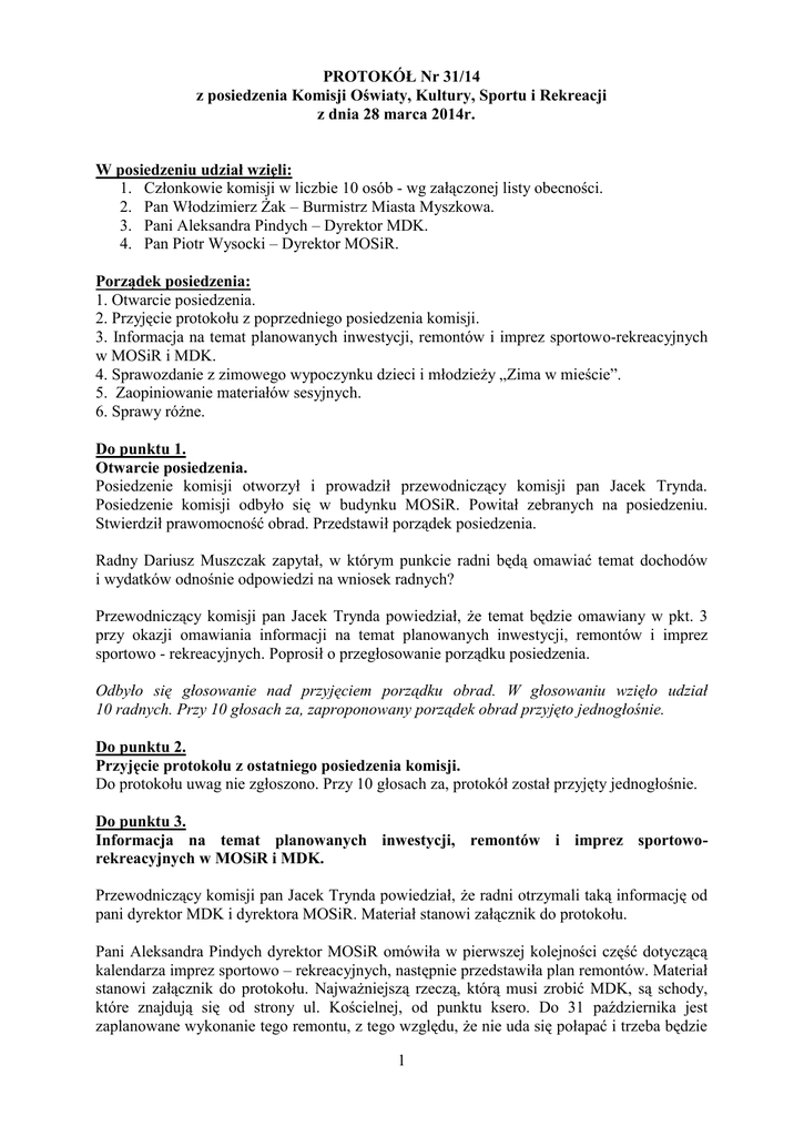 PROTOKÓŁ Nr 31/14 z posiedzenia Komisji Oświaty, Kultury, Sportu i Rekreacji z dnia 28 marca 2014r. W posiedzeniu udział wzięli: 1. Członkowie komisji w liczbie 10 osób - wg załączonej listy obecności. 2. Pan Włodzimierz Żak – Burmistrz Miasta Myszkowa. 3. Pani Aleksandra Pindych – Dyrektor MDK. 4. Pan Piotr Wysocki – Dyrektor MOSiR. Porządek posiedzenia: 1. Otwarcie posiedzenia. 2. Przyjęcie protokołu z poprzedniego posiedzenia komisji. 3. Informacja na temat planowanych inwestycji, remontów i imprez sportowo-rekreacyjnych w MOSiR i MDK. 4. Sprawozdanie z zimowego wypoczynku dzieci i młodzieży „Zima w mieście”. 5. Zaopiniowanie materiałów sesyjnych. 6. Sprawy różne. Do punktu 1. Otwarcie posiedzenia. Posiedzenie komisji otworzył i prowadził przewodniczący komisji pan Jacek Trynda. Posiedzenie komisji odbyło się w budynku MOSiR. Powitał zebranych na posiedzeniu. Stwierdził prawomocność obrad. Przedstawił porządek posiedzenia. Radny Dariusz Muszczak zapytał, w którym punkcie radni będą omawiać temat dochodów i wydatków odnośnie odpowiedzi na wniosek radnych? Przewodniczący komisji pan Jacek Trynda powiedział, że temat będzie omawiany w pkt. 3 przy okazji omawiania informacji na temat planowanych inwestycji, remontów i imprez sportowo - rekreacyjnych. Poprosił o przegłosowanie porządku posiedzenia. Odbyło się głosowanie nad przyjęciem porządku obrad. W głosowaniu wzięło udział 10 radnych. Przy 10 głosach za, zaproponowany porządek obrad przyjęto jednogłośnie. Do punktu 2. Przyjęcie protokołu z ostatniego posiedzenia komisji. Do protokołu uwag nie zgłoszono. Przy 10 głosach za, protokół został przyjęty jednogłośnie. Do punktu 3. Informacja na temat planowanych inwestycji, remontów i imprez sportoworekreacyjnych w MOSiR i MDK. Przewodniczący komisji pan Jacek Trynda powiedział, że radni otrzymali taką informację od pani dyrektor MDK i dyrektora MOSiR. Materiał stanowi załącznik do protokołu. Pani Aleksandra Pindych dyrektor MOSiR omówiła w pierwszej kolejności część dotyczącą kalendarza imprez sportowo – rekreacyjnych, następnie przedstawiła plan remontów. Materiał stanowi załącznik do protokołu. Najważniejszą rzeczą, którą musi zrobić MDK, są schody, które znajdują się od strony ul. Kościelnej, od punktu ksero. Do 31 października jest zaplanowane wykonanie tego remontu, z tego względu, że nie uda się połapać i trzeba będzie 1 je zrobić od nowa. Malowanie sal MDK odbywa się stopniowo według potrzeb w ciągu roku. Została doposażona sala plastyczna przy pomocy firmy Sokpol. MDK czeka na odpowiedź ostateczną z WFOŚiGW odnośnie dofinansowania, radni są informowani na bieżąco. Jeżeli chodzi o inwestycję największą, jest to w przypadku otrzymania dodatkowych środków, zakup projektora. Pan Burmistrz dodał, że dzisiaj odbywa się sesja Rady Powiatu, na której jeden z punktów będzie poświęcony dyskusji na temat zwiększenia pomocy ze strony Starostwa o 100 tys. zł, czyli łącznie o 130 tys. zł. Radna Mariola Tabaka zapytała, co będzie, jeżeli nie będzie tych pieniędzy? Pan Burmistrz odpowiedział, że jego zdaniem powinno być dobrze, jeśli będzie inaczej, wtedy przedstawi wariant awaryjny. Kino musi być. Radna Mariola Tabaka zapytała, kiedy będzie rozstrzygnięcie konkursu odnośnie dofinansowania na dach i okno. Pan Burmistrz powiedział, że rozstrzygnięcie merytoryczne już jest, lista zatwierdzonych projektów to około 130 projektów. Gmina Myszków jest na miejscu 119, pierwsze czternaście projektów dostało już dofinansowanie, kolejne są przygotowywane. Sukcesywnie środki są przesuwane z oszczędności z innych projektów. Wolą NFOŚiGW jest, żeby to miejsce wypełnić maksymalnie. W poprzednich latach odbywało się to tak, że na koniec rozliczeń z innych projektów, udawało się, że cała lista dostawała pieniądze i taka wola jest też. Nikt nie da gwarancji, że wszystkie 130 projektów zostanie ujętych. Wnioski, których planuje się wśród termomodernizacji, nie kombinuje się z mechanicznym nawiewem i rekuperacją, otrzymują wyższą punktację w rankingu. Wnioski, które są na początku są wnioskami, które nie przewidywały takich systemów nawiewu z odzyskiem. We wniosku gminy Myszków system jest bardziej skomplikowany, prze to w punktacji jest niżej. Gmina wiedziała od początku, że nie będzie na początku listy, tylko w systemie oceny będzie dalej na liście. Radna Mariola Tabaka zapytała, czy jest szansa na to w tym roku? Pan Burmistrz powiedział, że ma taką informację, to może trwać nawet do początku III kwartału. Radny Andrzej Giewon podkreślił, że MDK nie stoi w miejscu, bo nie ma już kopii analogowych, filmy są teraz sprowadzane z Warszawy. W najbliższym czasie będzie konkurs z nagrodami o najlepszą komedię wszechczasów, 30 komedii jest już z Gazetą Myszkowską. Radna Mariola Tabaka zapytała o kawałek nawierzchni z parkingu MDK w stronę Pizzerii La Stazione, jest to zasypane żwirem i pozostawione. Przed tym są postawione betonowe pachołki. Czy nie należało to do wykonawcy, który robił teren wokół MDK. Teraz nawet, gdyby chciał to ktoś inny zrobić, pachołki stwarzają kłopot. Jej zdaniem jest to rozgrzebane, niedokończone. To nie wygląda, żeby teren wokół MDK był uporządkowany. Pan Burmistrz powiedział, że to ostatnia komisja przed sesją, w czwartek na sesji rada będzie głosować zmianę do budżetu oraz WPF, w której z wydatków wygasających kwotę gmina będzie przeznaczać na kontynuację tego zadania, którego celem będzie dokończenie placu i dojazdu wokół całego MDK, również od strony Miejskiej i Powiatowej Biblioteki Publicznej. Jest taka koncepcja, żeby dojazd od La Stazione odbywał się od tyłu od strony 2 Biblioteki, a potem wzdłuż tarasu. Pachołki nie są przypadkowe, tylko przemyślane. Dodał, że z tyłu będ