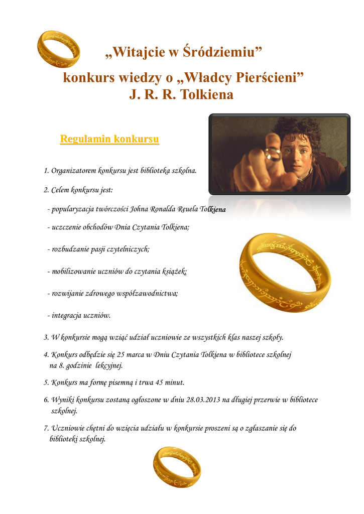 „Witajcie w ródziemiu” konkurs wiedzy o „W adcy Pier cieni” J. R. R. Tolkiena Regulamin konkursu 1. Organizatorem konkursu jest biblioteka szkolna. 2. Celem konkursu jest: - popularyzacja twórczo ci Johna Ronalda Reuela Tolkiena - uczczenie obchodów Dnia Czytania Tolkiena; - rozbudzanie pasji czytelniczych; - mobilizowanie uczniów do czytania ksi ek; - rozwijanie zdrowego wspó zawodnictwa; - integracja uczniów. 3. W konkursie mog wzi udzia uczniowie ze wszystkich klas naszej szko y. 4. Konkurs odb dzie si 25 marca w Dniu Czytania Tolkiena w bibliotece szkolnej na 8. godzinie lekcyjnej. 5. Konkurs ma form pisemn i trwa 45 minut. 6. Wyniki konkursu zostan og oszone w dniu 28.03.2013 na d ugiej przerwie w bibliotece szkolnej. 7. Uczniowie ch tni do wzi cia udzia u w konkursie proszeni s o zg aszanie si do biblioteki szkolnej.