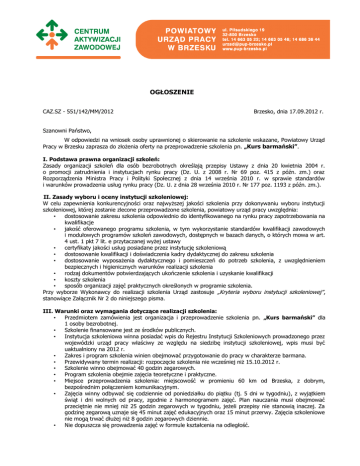 OGŁOSZENIE CAZ.SZ - 551/142/MM/2012 Brzesko, dnia 17.09.2012 r. Szanowni Państwo, W odpowiedzi na wniosek osoby uprawnionej o skierowanie na szkolenie wskazane, Powiatowy Urząd Pracy w Brzesku zaprasza do złożenia oferty na przeprowadzenie szkolenia pn. „Kurs barmański”. I. Podstawa prawna organizacji szkoleń: Zasady organizacji szkoleń dla osób bezrobotnych określają przepisy Ustawy z dnia 20 kwietnia 2004 r. o promocji zatrudnienia i instytucjach rynku pracy (Dz. U. z 2008 r. Nr 69 poz. 415 z późn. zm.) oraz Rozporządzenia Ministra Pracy i Polityki Społecznej z dnia 14 września 2010 r. w sprawie standardów i warunków prowadzenia usług rynku pracy (Dz. U. z dnia 28 września 2010 r. Nr 177 poz. 1193 z późn. zm.). II. Zasady wyboru i oceny instytucji szkoleniowej: W celu zapewnienia konkurencyjności oraz najwyższej jakości szkolenia przy dokonywaniu wyboru instytucji szkoleniowej, której zostanie zlecone przeprowadzone szkolenia, powiatowy urząd pracy uwzględnia: • dostosowanie zakresu szkolenia odpowiednio do identyfikowanego na rynku pracy zapotrzebowania na kwalifikacje • jakość oferowanego programu szkolenia, w tym wykorzystanie standardów kwalifikacji zawodowych i modułowych programów szkoleń zawodowych, dostępnych w bazach danych, o których mowa w art. 4 ust. 1 pkt 7 lit. e przytaczanej wyżej ustawy • certyfikaty jakości usług posiadane przez instytucję szkoleniową • dostosowanie kwalifikacji i doświadczenia kadry dydaktycznej do zakresu szkolenia • dostosowanie wyposażenia dydaktycznego i pomieszczeń do potrzeb szkolenia, z uwzględnieniem bezpiecznych i higienicznych warunków realizacji szkolenia • rodzaj dokumentów potwierdzających ukończenie szkolenia i uzyskanie kwalifikacji • koszty szkolenia • sposób organizacji zajęć praktycznych określonych w programie szkolenia. Przy wyborze Wykonawcy do realizacji szkolenia Urząd zastosuje „Kryteria wyboru instytucji szkoleniowej” , stanowiące Załącznik Nr 2 do niniejszego pisma. III. Warunki oraz wymagania dotyczące realizacji szkolenia: • Przedmiotem zamówienia jest organizacja i przeprowadzenie szkolenia pn. „Kurs barmański” dla 1 osoby bezrobotnej. • Szkolenie finansowane jest ze środków publicznych. • Instytucja szkoleniowa winna posiadać wpis do Rejestru Instytucji Szkoleniowych prowadzonego przez wojewódzki urząd pracy właściwy ze względu na siedzibę instytucji szkoleniowej, wpis musi być uaktualniony na 2012 r. • Zakres i program szkolenia winien obejmować przygotowanie do pracy w charakterze barmana. • Przewidywany termin realizacji: rozpoczęcie szkolenia nie wcześniej niż 15.10.2012 r. • Szkolenie winno obejmować 40 godzin zegarowych. • Program szkolenia obejmie zajęcia teoretyczne i praktyczne. • Miejsce przeprowadzenia szkolenia: miejscowość w promieniu 60 km od Brzeska, z dobrym, bezpośrednim połączeniem komunikacyjnym. • Zajęcia winny odbywać się codziennie od poniedziałku do piątku (tj. 5 dni w tygodniu), z wyjątkiem świąt i dni wolnych od pracy, zgodnie z harmonogramem zajęć. Plan nauczania musi obejmować przeciętnie nie mniej niż 25 godzin zegarowych w tygodniu, jeżeli przepisy nie stanowią inaczej. Za godzinę zegarową uznaje się 45 minut zajęć edukacyjnych oraz 15 minut przerwy. Zajęcia szkoleniowe nie mogą trwać dłużej niż 8 godzin zegarowych dziennie. • Nie dopuszcza się prowadzenia zajęć w formule kształcenia na odległość. • • • • Szkolenie zakończy się wydaniem zaświadczenia o ukończeniu kursu i uzyskaniu kwalifikacji zgodnie z Rozporządzeniem MEN z dnia 03.02.2006 r. w sprawie uzyskiwania i uzupełniania przez osoby dorosłe wiedzy ogólnej, umiejętności i kwalifikacji zawodowych w formach pozaszkolnych (Dz. U. z 2006 r. Nr 31 poz. 216) oraz z Rozporządzeniem Ministra Pracy i Polityki Społecznej z dnia 14 września 2010 r. w sprawie standardów i warunków prowadzenia usług rynku pracy (Dz. U. z 2010 r. Nr 177 poz. 1193 z późn. zm.) lub innym odpowiednim dokumentem potwierdzającym ukończenie szkolenia i uzyskanie kwalifikacji. Dokument potwierdzający ukończenie szkolenia musi zawierać: numer z rejestru, imię i nazwisko oraz numer PESEL uczestnika szkolenia, a w przypadku cudzoziemca numer dokumentu stwierdzającego tożsamość, nazwę instytucji szkoleniowej przeprowadzającej szkolenie, formę i nazwę szkolenia, okres trwania szkolenia, miejsce i datę wydania zaświadczenia lub innego dokumentu potwierdzającego ukończenie szkolenia i uzyskanie kwalifikacji, tematy i wymiar godzin zajęć edukacyjnych, podpis osoby upoważnionej przez instytucję szkoleniową przeprowadzającą szkolenie. Wykonawca ma obowiązek ubezpieczyć od następstw nieszczęśliwych wypadków powstałych w związku ze szkoleniem oraz w drodze do miejsca szkolenia i z powrotem : - osobę skierowaną na szkolenie, która nie posiada prawa do stypendium - osobę, która w trakcie szkolenia podejmie zatrudnienie, inną pracę zarobkową lub działalność gospodarczą, od dnia podjęcia zatrudnienia, innej pracy zarobkowej lub działalności gospodarczej do dnia zakończenia szkolenia. Koszty ww. ubezpieczenia zostaną zwrócone Wykonawcy na podstawie polisy potwierdzającej dokonanie opłaty tytułem tego ubezpieczenia - w wysokości nie wyższej niż ubezpieczenie liczone od najniższej sumy ubezpieczenia. Nadzór merytoryczny i pedagogiczny zapewnia Wykonawca. Brak możliwości realizacji zamówienia przez podwykonawców. Jeżeli jesteście Państwo zainteresowani przeprowadzeniem szkolenia, prosimy o przedłożenie w Powiatowym Urzędzie Pracy w Brzesku na druku opracowanym przez tut. Urząd wypełnionego Formularza oferty wraz z wymaganymi załącznikami (Załącznik Nr 1 do niniejszego pisma) . Wzór ww. formularza na prośbę zainteresowanych może zostać przesłany w formie elektronicznej. Dokumenty winny być opieczętowane i podpisane przez osobę