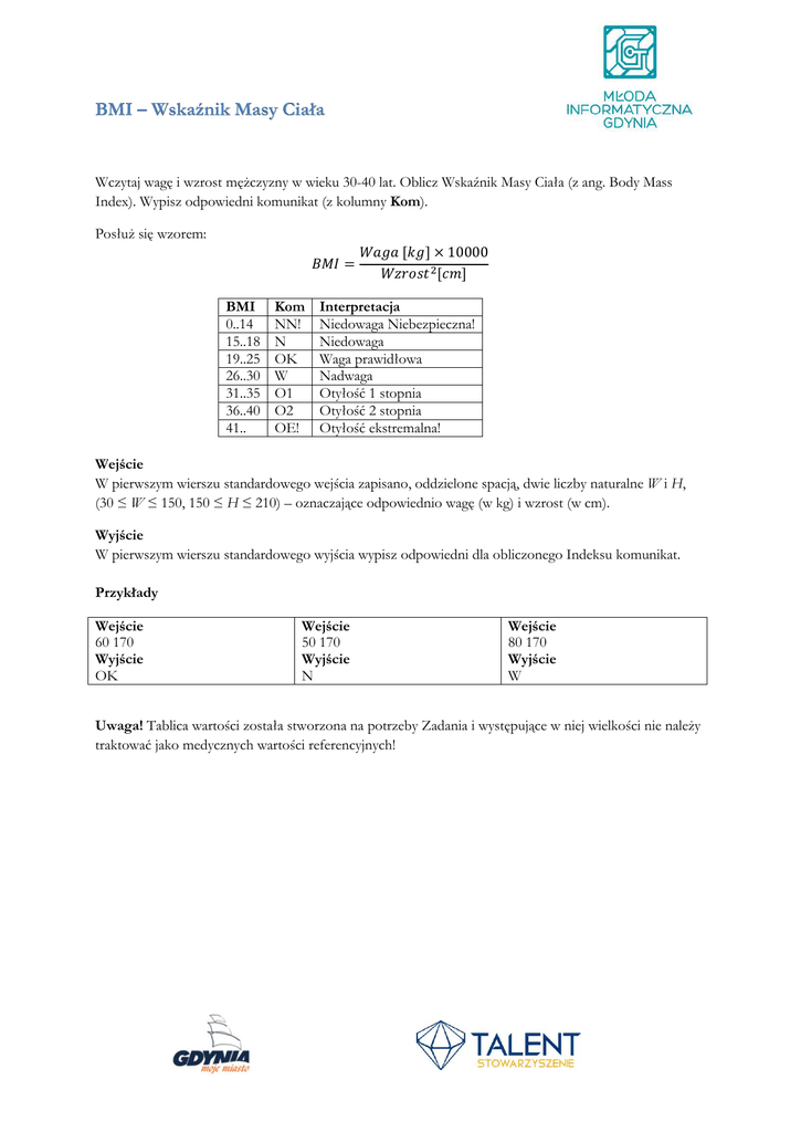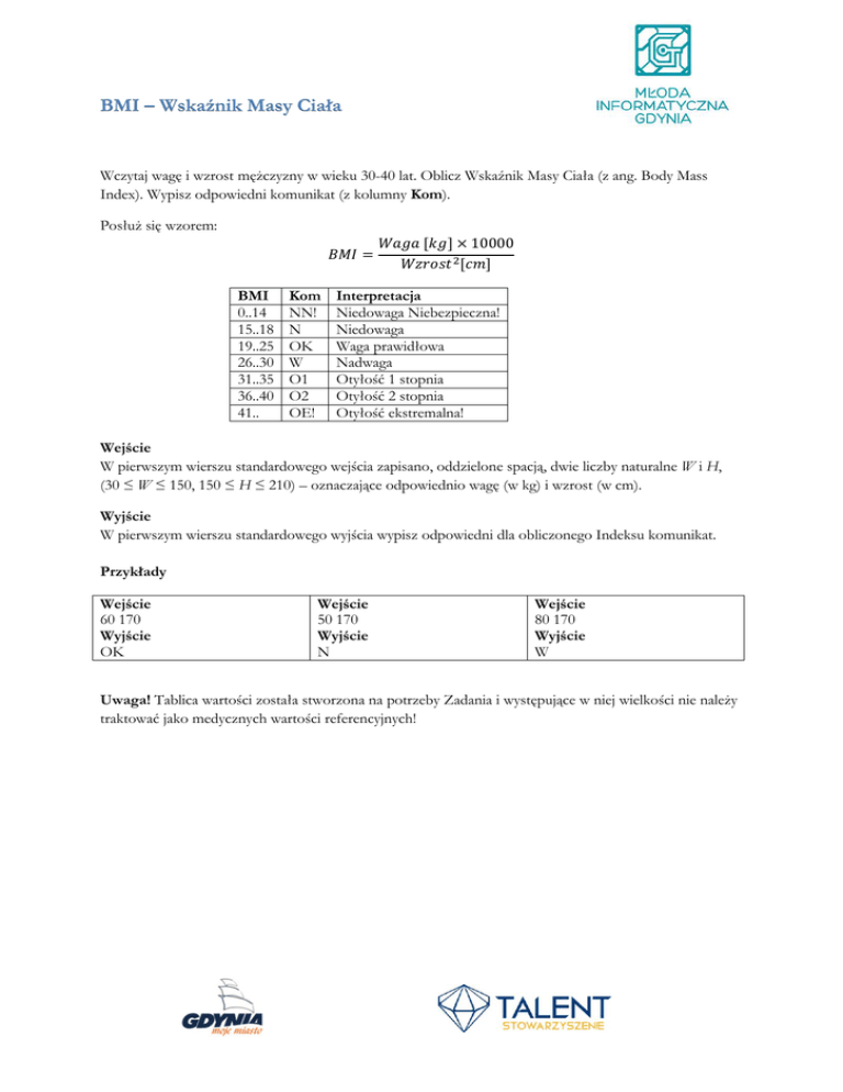 BMI – Wskaźnik Masy Ciała Wczytaj wagę i wzrost mężczyzny w wieku 30-40 lat. Oblicz Wskaźnik Masy Ciała (z ang. Body Mass Index). Wypisz odpowiedni komunikat (z kolumny Kom). Posłuż się wzorem: 𝐵𝑀𝐼 = BMI 0..14 15..18 19..25 26..30 31..35 36..40 41.. Kom NN! N OK W O1 O2 OE! 𝑊𝑎𝑔𝑎 [𝑘𝑔] × 10000 𝑊𝑧𝑟𝑜𝑠𝑡 2 [𝑐𝑚] Interpretacja Niedowaga Niebezpieczna! Niedowaga Waga prawidłowa Nadwaga Otyłość 1 stopnia Otyłość 2 stopnia Otyłość ekstremalna! Wejście W pierwszym wierszu standardowego wejścia zapisano, oddzielone spacją, dwie liczby naturalne W i H, (30 ≤ W ≤ 150, 150 ≤ H ≤ 210) – oznaczające odpowiednio wagę (w kg) i wzrost (w cm). Wyjście W pierwszym wierszu standardowego wyjścia wypisz odpowiedni dla obliczonego Indeksu komunikat. Przykłady Wejście 60 170 Wyjście OK Wejście 50 170 Wyjście N Wejście 80 170 Wyjście W Uwaga! Tablica wartości została stworzona na potrzeby Zadania i występujące w niej wielkości nie należy traktować jako medycznych wartości referencyjnych!