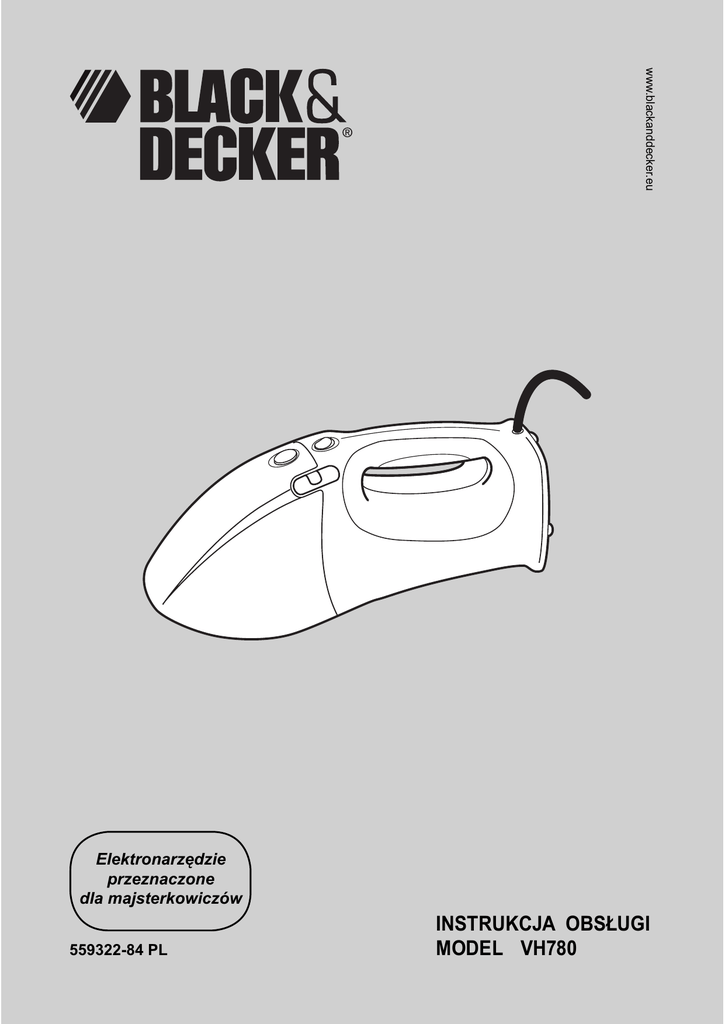 www.blackanddecker.eu Elektronarzędzie przeznaczone dla majsterkowiczów 559322-84 PL INSTRUKCJA OBSŁUGI MODEL VH780 4 3 2 1 A 14 15 16 5 13 6 12 7 11 8 B 10 9 2 6 5 C D 10 17 E F 3 18 G 19 20 21 H I 2 4 J K 4 22 23 24 L M N O P 5 POLSKI Kontrola i naprawy • Przed użyciem odkurzacza zawsze sprawdzaj, czy nie ma on jakichś uszkodzonych lub pękniętych części, niesprawnych wyłączników bądź innych usterek, które mogą ujemnie wpłynąć na działanie urządzenia. • Nie używaj odkurzacza, gdy jakiś jego element jest uszkodzony. • Naprawy uszkodzonego odkurzacza zlecaj wyłącznie autoryzowanemu warsztatowi serwisowi. • Regularnie sprawdzaj przewód sieciowy, czy nie jest uszkodzony. W razie stwierdzenia defektu zleć wymianę producentowi lub autoryzowanemu warsztatowi serwisowemu Black & Decker, by nie narażać się na niebezpieczeństwo wypadku. • Nigdy nie demontuj ani nie wymieniaj żadnych części nieprzewidzianych przez tę instrukcję obsługi. Zastosowanie zgodne z przeznaczeniem Odkurzacz Dustbuster® Mini Vac Black & Decker jest przeznaczony do odkurzania na sucho, a także do przedmuchiwania i pompowania. Urządzenie to nadaje się wyłącznie do użytku domowego. Wskazówki dotyczące bezpieczeństwa • • • • Uwaga! Przy korzystaniu z urządzeń sieciowych dokładnie przestrzegaj wskazówek zawartych w tej instrukcji, a także przepisów bhp, by nie narazić się na pożar, porażenie prądem elektrycznym oraz na doznanie urazu ciała i szkód rzeczowych. Przed użyciem narzędzia dokładnie przeczytaj niniejszą instrukcję. W niniejszej instrukcji opisano zastosowanie urządzenia zgodne z przeznaczeniem. Używanie przystawek i akcesoriów innych niż zalecane w tej instrukcji obsługi lub wykonywanie prac niezgodnych z przeznaczeniem może doprowadzić do wypadku Przechowuj tę instrukcję na wypadek, gdyby znów była kiedyś potrzebna. Bezpieczeństwo elektryczne • Sprawdź, czy lokalne napięcie sieciowe zgadza się z wartością podaną na tabliczce znamionowej odkurzacza. • Nie używaj odkurzacza do sprzątania innych urządzeń elektrycznych, dopóki są przyłączone do sieci. Zastosowanie odkurzacza • Nie używaj odkurzacza do sprzątania cieczy ani łatwo palnych materiałów. • Nie używaj odkurzacza do sprzątania ostrych przedmiotów, które mogą uszkodzić filtr lub inne jego elementy. • Nie używaj odkurzacza w pobliżu wody. • Nie zanurzaj odkurzacza w wodzie. • Gdy odkurzacz jest włączony, nie zbliżaj go do oczu ani twarzy. • Nie używaj odkurzacza bez prawidłowo zamontowanego zbiornika pyłowego i filtra. • Nie używaj odkurzacza na wolnym powietrzu. • W czasie pracy odkurzacza trzymaj dzieci i zwierzęta domowe w bezpiecznej od niego odległości. • Nie pozostawiaj odkurzacza bez nadzoru, gdy jest przyłączony do sieci. • Nie używaj kabla do wyjmowania wtyczki z gniazda sieciowego. Chroń kabel przed wysoką temperaturą, olejem i ostrymi krawędziami. • Gdy odkurzacz jest używany do przedmuchiwania lub pompowania: zakładaj okulary ochronne; nie zasłaniaj wylotu powietrza, gdyż grozi to przegrzaniem silnika; wylotu powietrza nie kieruj na siebie ani inne osoby; nie przekraczaj dopuszczalnego ciśnienia w pompowanym przedmiocie. Odkurzacz jest podwójnie zaizolowany i dlatego żyła uziemiająca nie jest konieczna. Elementy odkurzacza i akcesoria (rys. rys. A i B) 1. 2. 3. 4. 5. 6. 7. 8. 9. 10. 11. 12. 13. 14. 15. 16. Wyłącznik Guzik zwalniający zbiornika pyłowego Wskaźnik zanieczyszczenia filtra Zbiornik pyłowy Szczotka twarda Dysza szczelinowa Adapter zbiornika Szczotka podłogowa Wąż Adapter wydmuchowy Rury Adapter narzędziowy Dysza rozbieżna Mały adapter do nadmuchiwania Średni adapter do nadmuchiwania Duży adapter do nadmuchiwania Montaż Uwaga! Sprawdź, czy odkurzacz jest wyłączony, a wtyczka kabla wyjęta z gniazda sieciowego. Montaż wyposażenia do odkurzania Dostarczone wyposażenie można stosować w różnych kombinacjach zależnie od zamierzonego zadania (rys. rys. B i D) a. Ogólne odkurzanie/odpylanieb. b. Odkurzanie w niedostępnych miejscach c. Sprzątanie schodów d. Odkurzanie tapicerki e. Sprzątanie narożników f. Odkurzanie dywanów g. Sprzątanie twardych podłóg Po użyciu • Przed rozpoczęciem czyszczenia odkurzacza wyjmij wtyczkę kabla z gniazda sieciowego. • Nieużywany odkurzacz składuj w suchym miejscu niedostępnym dla dzieci. 6 Zerowanie wyłącznika termicznego silnika Ważna wskazówka! Silnik odkurzacza zawiera termiczny wyłącznik ochronny. Urządzenie to automatycznie wyłącza odkurzacz w razie przegrzania. W przypadku zadziałania wyłącznika wykonaj opisane niżej czynności: • Wyłącz odkurzacz i wyjmij wtyczkę kabla z gniazda sieciowego. • Odczekaj, aż odkurzacz się ochłodzi. Sprawdź i oczyść filtr. • Ponownie włóż wtyczkę kabla do gniazda sieciowego i załącz odkurzacz. Szczotkę twardą (5) i dyszę szczelinową (6) umieszczono na spodzie odkurzacza. By zamontować jakiś element wyposażenia, wykonaj opisane niżej operacje (rys. B): • Odłącz niepotrzebny element wyposażenia od odkurzacza. • Zamocuj odpowiedni element wyposażenia z przodu odkurzacza. Montaż wyposażenia do przedmuchiwania i pompowania Dostarczone wyposażenie można stosować w różnych kombinacjach zależnie od zamierzonego zadania (rys. rys. B i G): a. Przedmuchiwanie b. Pompowanie By zwiększyć uniwersalność zastosowania, przewidziano możliwość zakładania rur także na końcu węża. Czyszczenie i konserwacja Uwaga! Regularnie czyść filtry. Czyszczenie zbiornika pyłowego i filtrów (rys. rys. E, J - O) W razie wypełnienia zbiornika pyłowego lub zatkania filtra we wzierniku (3) pojawia się kolorowy wskaźnik. W takiej sytuacji sprawdź odkurzacz, czy nie jest zatkany, opróżnij zbiornik pyłowy i oczyść filtr. Filtry są filtrami wielokrotnego użytku i należy je regularnie czyścić. • Naciśnij guzik zwal