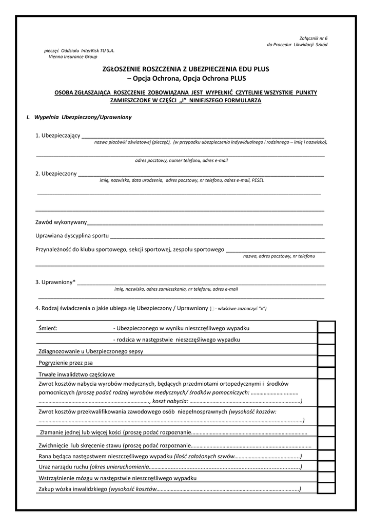 Załącznik nr 6 do Procedur Likwidacji Szkód pieczęć Oddziału InterRisk TU S.A. Vienna Insurance Group ZGŁOSZENIE ROSZCZENIA Z UBEZPIECZENIA EDU PLUS – Opcja Ochrona, Opcja Ochrona PLUS OSOBA ZGŁASZAJĄCA ROSZCZENIE ZOBOWIĄZANA JEST WYPEŁNIĆ CZYTELNIE WSZYSTKIE PUNKTY ZAMIESZCZONE W CZĘŚCI „I” NINIEJSZEGO FORMULARZA I. Wypełnia Ubezpieczony/Uprawniony 1. Ubezpieczający ______________________________________________________________________________ nazwa placówki oświatowej (pieczęć), (w przypadku ubezpieczenia indywidualnego i rodzinnego – imię i nazwisko), ____________________________________________________________________________________________________________________ adres pocztowy, numer telefonu, adres e-mail 2. Ubezpieczony _______________________________________________________________________________ imię, nazwisko, data urodzenia, adres pocztowy, nr telefonu, adres e-mail, PESEL __________________________________________________________________________________________________________________ _____________________________________________________________________________________________ Zawód wykonywany____________________________________________________________________________ Uprawiana dyscyplina sportu _____________________________________________________________________ Przynależność do klubu sportowego, sekcji sportowej, zespołu sportowego ________________________________ nazwa, adres pocztowy, nr telefonu _____________________________________________________________________________________________ 3. Uprawniony* ________________________________________________________________________________ imię, nazwisko, adres zamieszkania, nr telefonu, adres e-mail ____________________________________________________________________________________________ 4. Rodzaj świadczenia o jakie ubiega się Ubezpieczony / Uprawniony ( - właściwe zaznaczyć ”x”) Śmierć: - Ubezpieczonego w wyniku nieszczęśliwego wypadku - rodzica w następstwie nieszczęśliwego wypadku Zdiagnozowanie u Ubezpieczonego sepsy Pogryzienie przez psa Trwałe inwalidztwo częściowe Zwrot kosztów nabycia wyrobów medycznych, będących przedmiotami ortopedycznymi i środków pomocniczych (proszę podać rodzaj wyrobów medycznych/ środków pomocniczych: ……………………..……. …………………………………….……………………………., koszt nabycia: ……………………………………………………………..……) Zwrot kosztów przekwalifikowania zawodowego osób niepełnosprawnych (wysokość koszów: ………….……………………………………………………………………………………………...……………………………………..………...……) Złamanie jednej lub więcej kości (proszę podać rozpoznanie……………………………………………………………………… Zwichnięcie lub skręcenie stawu (proszę podać rozpoznanie………………………………………………………………………… Rana będąca następstwem nieszczęśliwego wypadku (ilość założonych szwów…………………………..………....) Uraz narządu ruchu (okres unieruchomienia………….....................................................................................) Wstrząśnienie mózgu w następstwie nieszczęśliwego wypadku Zakup wózka inwalidzkiego (wysokość kosztów…………………………………………………………………………….……..…) Uszczerbek na zdrowiu w wyniku ataku padaczki Zatrucie gazami, substancjami i produktami chemicznymi, porażenie prądem lub piorunem Inne uszkodzenia ciała, które wymagały interwencji lekarskiej w placówce medycznej oraz leczenia i co najmniej jednej wizyty kontrolnej 5. Data i miejsce wypadku/ data zdiagnozowania choroby ____________________________________________ 6. Data zgonu ______________________________Czy została wykonana sekcja zwłok:______________________ 7. 1) W przypadku nieszczęśliwego wypadku: przyczyna, okoliczności i przebieg wypadku, nazwiska i adresy ewentualnych świadków wypadku, rodzaj doznanych obrażeń (podać dokładnie i wyczerpująco)_________ ______________________________________________________________________________________ ______________________________________________________________________________________ ______________________________________________________________________________________ ______________________________________________________________________________________ 2) W przypadku choroby: rozpoznanie, przebieg leczenia, nazwa i adres placówki medycznej ____________ ______________________________________________________________________________________ ______________________________________________________________________________________ ______________________________________________________________________________________ ______________________________________________________________________________________ 8. Czy narząd (-y) opisane w pkt. 7 był (-y) uszkodzony (-e) przed zajściem zdarzenia w wyniku wypadku lub choroby ____________________________________________________________________________________ 9. Czy Ubezpieczony był w chwili wypadku pod wpływem alkoholu, narkotyków lub innych środków o podobnym działaniu _________________________________________________________________________ 10. Czy do wypadku doszło w chwili prowadzenia przez Ubezpieczonego pojazdu___________________________ samochodu motocyklu roweru inne Proszę podać numer i kategorię uprawnień do ich prowadzenia _______________________________________ 11. Czy w związku z wypadkiem było prowadzone postępowanie organów dochodzeniowych bądź postępowanie karne lub cywilne:_________________________________________________________________________ Jeżeli tak, proszę podać nazwę i adres odpowiedniej jednostki policji, prokuratury lub sądu, nr sprawy_____ 