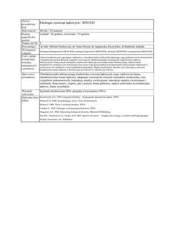 Nazwa przedmiotu/ kod Rok/semestr Rodzaj zajęć/liczba godzin Punkty ECTS Prowadzący Wymagania wstępne Cele i efekty kształcenia (wiedza, umiejętności i postawa) Opis treści przedmiotu Ekologia zwierząt lądowych / B501ED III rok / VI semestr wykład / 20 godzin, ćwiczenia / 55 godzin 5 dr hab. Michał Grabowski, dr Anna Drozd, dr Agnieszka Soszyńska, dr Radomir Jaskuła Zoologia bezkręgowców (B101WD), zoologia kręgowców (B201WD), ekologia (B304WD), ewolucjonizm (B501WD). Celem kształcenia jest zapoznanie studentów z charakterystyką środowiska lądowego, jego podstawowych ekosystemów i charakterystycznych dla nich zespołów zwierzęcych. Student posiądzie umiejętność analizowania wpływu abiotycznych i biotycznych elementów środowiska lądowego na kształtowanie lokalnej fauny, będzie umiał interpretować strukturę sieci troficznych oraz ocenić rolę poszczególnych komponentów ekosystemów lądowych w zachowaniu ich stabilności i przeciwdziałaniu degradacji. Będzie umiał także określić rolę człowieka w procesie kształtowania fauny lądowej i określić jego powinności w zakresie jej ochrony. Charakterystyka abiotycznego środowiska zwierząt lądowych i jego wpływu na faunę, charakterystyka fauny lądowej, adaptacje zwierząt do różnych warunków środowiska, rola czynników pokarmowych, interakcje między zwierzętami, interakcje między zwierzętami i roślinami, fauna lasów, stepów, gór i pustyń, fauna glebowa, wpływ człowieka na środowisko lądowe, fauna synurbijna. Egzamin (kolokwium 50%, projekty ćwiczeniowe 50%) Warunki zaliczenia Zalecana lista Kostrowicki A.S. 1999. Geografia biosfery – biogeografia dynamiczna lądów. PWN lektur Wilson E.O. 2000. Socjobiologia. Zysk i S-ka Wydawnictwo Weiner J. 2008. Życie i ewolucja biosfery. PWN Combes C. 1999. Ekologia i ewolucja pasożytnictwa. PWN Magurran A.E. 2006. Measuring biological diversity. Blackwell Publishing Sax D.F., Stachowicz J.J., Gaines S.D. 2005. Species invasions – insights into ecology, evolution and biogeography. Sinauer Associates, Inc. Publishers