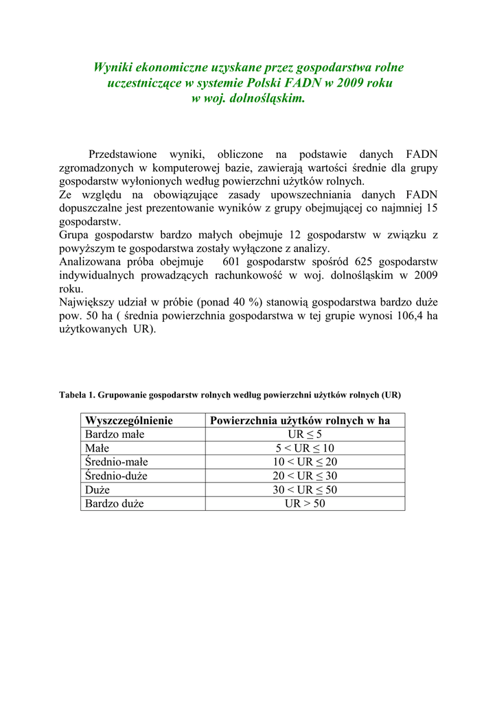 Wyniki ekonomiczne uzyskane przez gospodarstwa rolne uczestniczące w systemie Polski FADN w 2009 roku w woj. dolnośląskim. Przedstawione wyniki, obliczone na podstawie danych FADN zgromadzonych w komputerowej bazie, zawierają wartości średnie dla grupy gospodarstw wyłonionych według powierzchni użytków rolnych. Ze względu na obowiązujące zasady upowszechniania danych FADN dopuszczalne jest prezentowanie wyników z grupy obejmującej co najmniej 15 gospodarstw. Grupa gospodarstw bardzo małych obejmuje 12 gospodarstw w związku z powyższym te gospodarstwa zostały wyłączone z analizy. Analizowana próba obejmuje 601 gospodarstw spośród 625 gospodarstw indywidualnych prowadzących rachunkowość w woj. dolnośląskim w 2009 roku. Największy udział w próbie (ponad 40 %) stanowią gospodarstwa bardzo duże pow. 50 ha ( średnia powierzchnia gospodarstwa w tej grupie wynosi 106,4 ha użytkowanych UR). Tabela 1. Grupowanie gospodarstw rolnych według powierzchni użytków rolnych (UR) Wyszczególnienie Bardzo małe Małe Średnio-małe Średnio-duże Duże Bardzo duże Powierzchnia użytków rolnych w ha UR ≤ 5 5 < UR ≤ 10 10 < UR ≤ 20 20 < UR ≤ 30 30 < UR ≤ 50 UR > 50 Tabela 2. Wybrane informacje o produkcji według powierzchni użytków rolnych Małe Wyszczególnienie j.m. (5<=10 ha) Średnio małe (10<=20 ha) Średnio duże (20<=30 ha) Duże Bardzo duże (30<=50 ha) (>50 ha) Liczba gospodarstw w próbie szt. 30 119 99 110 243 Wielkość ekonomiczna Nakłady pracy ogółem Nakłady pracy własnej Nakłady pracy najemnej Średnia powierzchnia użytkowanych użytków rolnych % udział gruntów dzierżawionych Zboża Pozostałe uprawy polowe Uprawy trwałe Sady Pozostałe uprawy trwałe Uprawy pastewne Odłogi Ugory Lasy Zwierzęta ogółem Krowy mleczne Pozostałe bydło Owce i kozy Trzoda chlewna Drób Plon pszenicy Plon kukurydzy Obsada zwierząt Wydajność mleczna krów ESU AWU FWU AWU 4,0 1,464 1,377 0,086 6,8 1,526 1,496 0,030 9,9 1,807 1,642 0,165 15,1 1,993 1,743 0,249 36,6 2,131 1,677 0,454 7,8 15,1 25,2 39,5 106,4 8,2 4,67 1,13 0,12 0,12 0,00 1,43 0,02 0,17 0,11 3,8 0,62 0,58 0,00 1,20 1,27 44,9 0,0 0,74 3 081 17,7 10,05 2,48 0,07 0,07 0,00 1,95 0,01 0,40 0,33 5,6 1,26 1,26 0,17 2,79 0,10 45,0 84,8 1,13 3 639 22,0 15,67 3,56 0,28 0,28 0,00 4,17 0,01 1,26 0,45 7,8 2,03 2,67 0,00 2,95 0,05 44,2 64,4 0,86 4 217 29,6 25,03 7,54 0,21 0,21 0,00 4,40 0,13 2,01 0,54 8,9 2,75 2,00 0,00 3,82 0,01 48,0 74,9 0,73 4 180 46,7 67,73 23,00 0,15 0,15 0,00 7,20 0,21 7,67 0,96 11,4 2,86 3,65 0,11 4,11 0,52 51,6 78,3 0,44 5 727 ha % ha ha ha ha ha ha ha ha ha LU LU LU LU LU LU dt/ha dt/ha LU/ha kg/krowę Tabela 3. Wartość produkcji według powierzchni użytków rolnych zł zł zł zł zł zł zł zł zł zł zł zł (5<=10 ha) 36 626 23 885 7 761 69 768 3 461 219 2 209 323 7 052 926 249 Średnio małe (10<=20 ha) 49 729 32 417 17 561 25 0 6 121 2 456 3 923 90 1 281 740 196 zł 847 24 261 1 240 2 682 zł 12 693 16 123 20 475 26 373 34 356 zł 1 067 -783 691 376 273 Mleko i przetwory z mleka krowiego zł 2 034 4 325 7 023 9 811 14 939 Wołowina i cielęcina Wieprzowina Owce i kozy Mięso drobiowe Jaja Mleko i przetwory z mleka owczego i koziego zł zł zł zł zł 1 412 3 638 0 723 3 884 2 407 8 317 167 46 279 4 346 8 908 0 15 111 4 963 10 600 0 -1 33 5 355 10 919 51 2 465 165 zł 0 413 0 0 41 Inne zwierzęta i produkty zwierzęce zł 1 003 169 71 967 421 Pozostała produkcja zł 49 1 189 964 768 2 363 Małe Wyszczególnienie Produkcja ogółem Produkcja roślinna Zboża Rośliny białkowe Uprawy energetyczne Ziemniaki Buraki cukrowe Rośliny oleiste Rośliny przemysłowe Warzywa i kwiaty Owoce Uprawy pastewne Inne produkty pochodzenia roślinnego Produkcja zwierzęca Różnica wartości zwierząt stada podstawowego j.m. Średnio Duże duże (20<=30 (30<=50 ha) ha) 71 061 115 673 49 622 88 532 24 979 44 912 62 191 133 870 6 430 10 380 2 359 6 165 6 682 16 271 46 348 3 173 3 024 5 159 4 691 337 438 Bardzo duże (>50 ha) 268 190 231 471 132 059 717 402 14 957 10 695 64 268 156 3 499 1 300 735 zł Wykres 1. Struktura produkcji wg powierzchni użytków rolnych 100% 90% 80% 70% 60% 50% 40% 30% 20% 10% 0% Pozostała produkcja Produkcja zwierzęca Produkcja roślinna (5<=10 ha) (10<=20 ha) (20<=30 ha) (30<=50 ha) Małe Średnio małe Średnio duże Duże (>50 ha) Bardzo duże Tabela 4. Koszty według powierzchni użytków rolnych Średnio duże (20<=30 ha) 71 942 49 887 32 889 4 641 1 649 12 055 5 061 (30<=50 ha) 109 077 77 081 53 185 7 963 2 450 22 418 9 111 Koszty ogółem Zużycie pośrednie Koszty bezpośrednie Nasiona i sadzonki Nasiona i sadzonki własne Nawozy Środki ochrony roślin zł zł zł zł zł zł zł 30 872 21 895 13 009 1 565 781 3 298 1 289 Średnio małe (10<=20 ha) 49 282 35 258 22 886 3 250 1 337 7 607 3 063 Pozostałe koszty bezpośrednie produkcji roślinnej zł 525 139 419 983 950 Pasze dla zwierząt żywionych w systemie wypasowym zł 2 094 3 553 5 152 5 201 8 190 Pasze dla zwierząt żywionych w systemie wypasowym, wytworzone w gosp. rol. zł 1 907 3 082 4 281 3 959 5 166 Małe Wyszczególnienie j.m. (5<=10 ha) Duże Bardzo duże (>50 ha) 267 552 192 979 137 072 21 574 4 454 69 161 27 586 Pasze dla zwierząt ziarnożernych zł 3 795 4 760 4 861 6 460 7 884 Pasze dla zwierząt ziarnożernych, wytworzone w gosp. rol. zł 1 578 3 359 3 355 3 911 4 500 Pozostałe koszty bezpośrednie produkcji zwierzęcej zł 443 495 699 1 049 1 726 Koszty ogólnogospodarcze zł 8 886 12 372 16 999 23 895 55 907 zł 2 377 3 284 4 135 6 561 13 549 zł zł 3 353 1 705 5 171 1 945 8 020 2 036 11 460 2 725 30 215 5 592 zł 1 452 1 971 2 808 3 150 6 550 zł 7 295 12 510 17 389 23 706 48 444 zł 1 682 1 513 4 666 8 290 26 129 zł zł zł 1 512 146 24 488 649 376 2 681 974 1 011 3 700 2 720 1 870 8 754 10 552 6 823 Koszty utrzymania maszyn i budynków Energia Usługi Pozostałe koszty ogólnogospodarcze Amortyzacja Koszty czynników zewnętrznych Wynagrodzenia Czynsze Odsetki Wyk