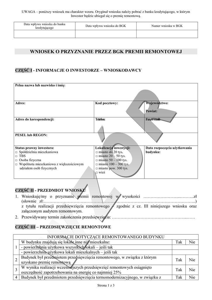 UWAGA – poniższy wniosek ma charakter wzoru. Oryginał wniosku należy pobrać z banku kredytującego, w którym Inwestor będzie ubiegał się o premię remontową. Data wpływu wniosku do banku kredytującego Data wpływu wniosku do BGK Numer wniosku w BGK WNIOSEK O PRZYZNANIE PRZEZ BGK PREMII REMONTOWEJ CZĘŚĆ I - INFORMACJE O INWESTORZE – WNIOSKODAWCY Pełna nazwa lub nazwisko i imię: Adres: Kod pocztowy: Województwo: Powiat: Adres do korespondencji: Telefon: Fax / e-mail: Lokalizacja inwestycji: □ miasto do 20 tys. □ miasto 20 – 50 tys. □ miasto 50 – 100 tys. □ miasto 100 – 300 tys. □ miasto pow. 300 tys. □ wieś Data rozpoczęcia użytkowania budynku: PESEL lub REGON: Status prawny inwestora: □ Spółdzielnia mieszkaniowa □ TBS □ Osoba fizyczna □ Wspólnota mieszkaniowa z większościowym udziałem osób fizycznych CZĘŚĆ II - PRZEDMIOT WNIOSKU 1. Wnioskuję/my o przyznanie premii remontowej w wysokości ……………………..……….zł (słownie zł:……………………………………………………………………………………………..) z tytułu realizacji przedsięwzięcia remontowego – zgodnie z cz. III niniejszego wniosku oraz załączonym audytem remontowym. 2. Przewidywany termin zakończenia przedsięwzięcia: ……………………………………………..…… CZĘŚĆ III – PRZEDSIĘWZIĘCIE REMONTOWE 1 2 3 4 INFORMACJE DOTYCZĄCE REMONTOWANEGO BUDYNKU W budynku znajdują się lokale inne niż mieszkalne: - powierzchnia użytkowa wszystkich lokali – jeśli tak - powierzchnia użytkowa lokali mieszkalnych – jeśli tak Budynek był przedmiotem przedsięwzięcia remontowego, w związku z którym uzyskano premię remontową W wyniku realizacji wcześniejszych przedsięwzięć remontowych osiągnięto oszczędność zapotrzebowania na energię co najmniej 25% Budynek był przedmiotem przedsięwzięcia termomodernizacyjnego, w związku z Strona 1 z 3 Tak Nie Tak Nie Tak Nie Tak Nie którym uzyskano premię termomodernizacyjną Oświadczenie Wnioskodawcy: 1. Oświadczam/y, że znam/y zasady przyznawania przez Bank Gospodarstwa Krajowego premii remontowych w związku z realizacją przedsięwzięć remontowych, o których mowa w ustawie z dnia 21 listopada 2008 r. o wspieraniu termomodernizacji i remontów (Dz. U. z 2008 r. Nr 223, poz.1459 z późn.zm.). 2. Oświadczam/y, że kredyt na sfinansowanie przedsięwzięcia remontowego nie jest przeznaczony na sfinansowanie prac, na które uzyskano środki pochodzące z budżetu Unii Europejskiej lub zaciągnięto inny kredyt, do którego przyznana została premia termomodernizacyjna lub remontowa. 3. Oświadczam/y, że reprezentuję/my wspólnotę mieszkaniową, w której większościowy udział posiadają osoby fizyczne.1 4. Oświadczam/y, że nie ubiegam/y się jednocześnie o przyznanie innej premii na ten sam zakres prac. 5. Oświadczam/y, że w ciągu bieżącego roku podatkowego i dwóch poprzednich lat podatkowych nie uzyskałem/liśmy/ uzyskałem/liśmy pomoc publiczną (de minimis) – dotyczy beneficjentów pomocy publicznej. 6. Oświadczam/y, że udostępnię/my Bankowi Gospodarstwa Krajowego dodatkowe wyjaśnienia, informacje, dokumenty dotyczące przedmiotowego wniosku. 7. Oświadczam/y, że wyrażam/y zgodę na przetwarzanie przez BGK oraz podmioty, którym BGK zleca dokonanie weryfikacji załączonego audytu - informacji zamieszczonych w niniejszym wniosku stanowiących dane osobowe, zgodnie z art. 23 ust.1 pkt 1 Ustawy o ochronie danych osobowych.2 8. Oświadczam/y, że dane zawarte w niniejszym wniosku zgodne są ze stanem faktycznym. ………………….., …………………… …………………….. (miejscowość) (pieczęć firmowa) (data) …….………………………………………………..……… (podpis/y osoby/osób upoważnionych w imieniu wnioskodawcy) CZĘŚĆ IV - ( WYPEŁNIA BANK KREDYTUJĄCY ) 1. Dane Banku (Oddziału Banku) Nazwa: ……………………………………………………………………………… Adres: ……………………………………………………………………………… Numer rozliczeniowy: ……………………………………………………………………………… 2. Dane osoby prowadzącej sprawę w banku kredytującym Imię i Nazwisko: ……………………………………………………………………………… e-mail: ……………………………………………………………………………… nr telefonu: ……………………………………………………………………………… nr fax: ……………………………………………………………………………… 3. Na podstawie dokumentów udostępnionych przez wnioskodawcę/oświadczenia wnioskodawcy bank kredytujący informuje, że rozpoczęcie użytkowania budynku wielorodzinnego, przedmiotem przedsięwzięcia remontowego nastąpiło przed dniem 14 sierpnia 1961 r. 1 2 będącego dotyczy wyłącznie wspólnot mieszkaniowych dotyczy wnioskodawcy, występującego w związku z niniejszym wnioskiem jako osoba fizyczna dokonująca czynności prawnej niezwiązanej bezpośrednio z jej działalnością gospodarczą Strona 2 z 3 4. Bank kredytujący informuje, że na dzień składania wniosku wnioskodawca nie znajduje się w trudnej sytuacji ekonomicznej – dotyczy beneficjentów pomocy publicznej udzielanej zgodnie z przepisami prawa Unii Europejskiej. 5. Przewidywane dane przedsięwzięcia niezbędne do wyliczenia premii remontowej: CHARAKTERYSTYKA PRZEDSIĘWZIĘCIA 1 Całkowity koszt przedsięwzięcia 2 Kwota udzielonego kredytu 3 Zmniejszenie zapotrzebowania na energię dostarczaną na potrzeby ogrzewania i podgrzewania wody użytkowej w budynku – wg audytu 4 Wskaźnik kosztu przedsięwzięcia na dzień złożenia wniosku Wskaźnik udziału powierzchni użytkowej lokali mieszkalnych w całkowitej 5 powierzchni użytkowej budynku 