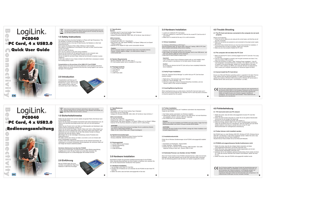 Best Connectivity PC0040 PC Card, 4 x USB2.0 Quick User Guide 2.1 Specification Do not throw the appliance away with the normal household waste at the end of its life, but hand it in at an official collection point for recycling. By doing this you will help to preserve the environment. General • Compliant with PC Card 32-bit CardBus Type II Standard • Fully Plug & Play and Hot Swappable • Supports Windows 98SE/ME, 2000, 2003, XP 32-/64-bit, Vista 32-/64-bit, 7 1.0 Safety Instructions USB 2.0 Interface • 4 USB Type-A ports • Compliant with USB 2.0/1.1 Specification • Data transfer rate: High Speed 480Mbps, Full Speed 12Mbps and Low Speed 1.5Mbps supported • Optional 5V DC adapter for high current consumption devices Don’t place the Device into direct Sunlight or in Places with high Temperature. This can damage it or shorten his average useful Life. Don’t place the Device in the near of Heat Sources, like Radiators or other heat producing Devices. Don’t expose the Device to Rain, Water, Wetness or high Humidity. Don’t place it in the Bathroom or the Kitchen in the near of a Sink. Avoid the direct Contact with Water. Don’t try to open the Device. Don’t use any violence on the parts during installation. Secure the slot bracket with the appropriate screw on your computer case. Prior to the first use of our product make a backup of your data. We are not liable for any loss of data, unless you can accuse us intention or gross negligence. In any case, liability for loss of data is limited to the effort that is necessary to restore from existing backup copies. Bedienungsanleitung Be 1. Locate your notebook’s PC Card slot(s). 2. With your notebook on, insert the PC Card into the unused PC Card bus slot of your system. 3. Make sure it is inserted all the way in for a solid connection. 4.1 The PC Card and devices connected to the computer do not work properly Please do the following: 1. Check the all the cables you are using are the correct types, and that they are all securely connected. 2. Make sure all devices are powered on and connected to the proper power supply and source. 3. Reconnect daisy-chained devices you may have disconnected for installation. If reconnecting does not clear up problem, restart your computer. 4. Make sure you have properly installed the PC Card. For Windows 2000/XP/Server 2003/Vista/7 – Once the Windows 2000, XP, Server 2003, Vista and 7 startup, USB 2.0 PC Card will be installed automatically without driver installing. 1. Windows OS automatically installs the correct driver. 2. After installs, the computer will show the message ‘found a new USB device’, and then new ‘Generic USB Hub’ will be displayed. 3. Now, the PC Card PC0040 is ready to use. 4.2 The computer did not detect the PC Card 1. Make sure that the PC Card is correctly plugged into the PC Card slot; if not, plug it in securely. 2. If the PC Card is plugged in correctly, see if its gold connectors are clean; if not, clean the surface of the connector. 3. Follow the procedure on page 3, titled “Verifying Proper Installation”. If the PC Card designation “Universal Serial Bus controllers, One USB PC Card Port” did not appear in the Device Manager, update your computer BIOS to the latest version. If after updating your BIOS, your computer still does not detect the PC Card, contact your computer manufacturer for advanced support for BIOS. Important: If your system doesn’t boot to Windows properly with our card installed, check with your system’s manufacturer for the latest system firmware update. 2.2 System Requirements • Windows 98SE/ME, 2000, XP, 2003, Vista, 7 • PC Card-enabled system with an available PC Card Slot Caution: Do not plug any devices into the PC Card until you have completely finished the driver installation. 2.3 Package Contents • 1 x 4-Port USB PC Card • 1 x User Manual • 1 x CD driver • 1 x USB Power cable 2.0 Introduction 3.2 Verify Proper Installation 4.3 Cannot install the PC Card driver Check the ‘’Windows Device Manager” to confirm that your PC Card has been properly installed. Ensure your Microsoft Windows operating system is upgraded to the latest “Service Pack” (please check the Microsoft website). It is highly recommended that you update your system to Windows 2000 service pack 4, Windows XP service pack 2, Windows Server 2003 service pack 1 and Windows 7 (or later). 1. Right-click on ‘’My Computer” and select ‘’Manage”. 2. Select the ‘’Device Manager’’ Tab. 3. Click the (+) plus sign in front of Universal Serial Bus Controllers, and one ‘Generic USB 2.0 Hub’ should be displayed. Congratulations and thank you for purchasing the 4-Port USB PC Card PC0040 from Logilink. This PC Card offers notebook users a fast and convenient way to add 4 USB ports. 3.3 Inserting/Removing Devices When inserting/removing your printer device, hold the PC Card and make sure it does not move around inside the slot, otherwise, the PC Card may loose connection or should be ejected from the system. 1 Geben Sie das Gerät am Ende der Lebensdauer nicht in den normalen Hausmüll. Bringen Sie es zum Recycling zu einer offiziellen Sammelstelle. Auf diese Weise helfen Sie die Umwelt zu schonen. PC0040 PC P Card, 4 x USB2.0 4.0 Trouble Shooting 3.1 Driver Installation Caution: DC 5V, 2A power adapter is optional for high power consumption devices. Polarity: Outside negative voltage (-) & Inside positive voltage (+) 3.5mm power jack Congratulations on the purchase of the USB2.0 PC Card PC0040! Please read the instructions and warning references in this operating instructions carefully, before you use the product for the first time. During neglect it can come to damages of the equipment. 3.0 Hardware Installation 1.0 Sicherheitshinweise 2 2.1 Spezifikationen 3.2 Treiber Installation Allgemein • Kompatibel zu PC Card 32-bit Cardbus Type II Standard • Plug & Play und Hot Swap fähig • Geeignet für Windows 98SE/ME, 2000,