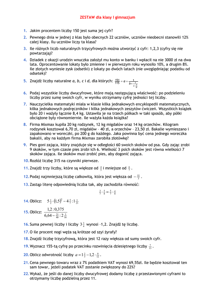 ZESTAW dla klasy I gimnazjum 1. Jakim procentem liczby 150 jest suma jej cyfr? 2. Pewnego dnia w jednej z klas było obecnych 22 uczniów, uczniów nieobecni stanowili 12% całej klasy. Ilu uczniów liczy ta klasa? 3. Ile różnych liczb naturalnych trzycyfrowych można utworzyć z cyfr: 1,2,3 (cyfry się nie powtarzają)? 4. Dziadek z okazji urodzin wnuczka założył mu konto w banku i wpłacił na nie 3000 zł na dwa lata. Oprocentowanie lokaty było zmienne i w pierwszym roku wynosiło 10%, a drugim 8%. Ile złotych wyniesie zysk (odsetki) z lokaty po dwóch latach (nie uwzględniając podatku od odsetek)? 5. Znajdź liczby naturalne a, b, c i d, dla których: 151 a 1 115 b 11 c d 6. Podaj wszystkie liczby dwucyfrowe, które mają następującą właściwość: po podzieleniu liczby przez sumę swoich cyfr, w wyniku otrzymamy cyfrę jedności tej liczby. 7. Nauczycielka matematyki miała w klasie kilka jednakowych encyklopedii matematycznych, kilka jednakowych podręczników i kilka jednakowych zeszytów ćwiczeń. Wszystkich książek było 20 i ważyły łącznie 8,4 kg. Ustawiła je na trzech półkach w taki sposób, aby półki obciążone były równomiernie. Ile ważyła każda książka? 8. Firma Mixmax kupiła 20 kg rodzynek, 12 kg migdałów oraz 14 kg orzechów. Kilogram rodzynek kosztował 6,70 zł, migdałów – 40 zł, a orzechów – 23,50 zł. Bakalie wymieszano i zapakowano w woreczki, po 200 g do każdego. Jaka powinna być cena jednego woreczka bakalii, aby na każdym firma Mixmax zarobiła złotówkę? 9. Pies goni zająca, który znajduje się w odległości 60 swoich skoków od psa. Gdy zając zrobi 9 skoków, w tym czasie pies zrobi ich 6. Wielkość 3 psich skoków jest równa wielkości 7 skoków zająca. Ile skoków musi zrobić pies, aby dogonić zająca. 10. Rozłóż liczbę 315 na czynniki pierwsze. 11. Znajdź trzy liczby, które są większe od 4 5 i mniejsze od 6 7 . 12. Podaj najmniejszą liczbę całkowitą, która jest większa od 323 . 13. Zastąp literę odpowiednią liczba tak, aby zachodziła równość: 3 7 14. Oblicz: 15. Oblicz: 58 57 a8 2 5 12 1,5 4 75 : 1 211 1,2 : 0,375 21 6,64 40 : 2 163 16. Suma pewnej liczby i liczby 3 34 wynosi –1,2. Znajdź tę liczbę. 17. O ile procent nogi węża są krótsze od szyi żyrafy? 18. Znajdź liczbę trzycyfrową, która jest 12 razy większa od sumy swoich cyfr. 19. Wyznacz 155-tą cyfrę po przecinku rozwinięcia dziesiętnego liczby 7 13 . 20. Oblicz odwrotność liczby a 1 23 1,2 129 . 21. Cena pewnego towaru wraz z 7% podatkiem VAT wynosi 69,55zł. Ile będzie kosztował ten sam towar, jeżeli podatek VAT zostanie zwiększony do 22%? 22. Wykaż, że jeśli do danej liczby dwucyfrowej dodamy liczbę z przestawionymi cyframi to otrzymamy liczbę podzielną przez 11. 23. Ile jest liczb naturalnych dwucyfrowych podzielnych przez 15 lub 20? 24. Najmniejszym ssakiem na Ziemi jest ryjówka etruska. Najmniejszy zbadany osobnik ważył 2g. Jego ogon miał 2,5 cm długości i stanowił 125 długości całego ciała. Jaką długość miało ciało ryjówki? 25. Znajdź liczbę, której 37% wynosi: 1 13 2 9 16 . 26. O ile suma liczb 2 23 i 2 14 jest większa od różnicy pierwszej i drugiej liczby? 27. Wstaw nawiasy tak, aby otrzymać równość: 10 21,1 8,9 3,5 1 12 1500 . 28. O ile procent powiększy się pole kwadratu, jeśli każdy jego bok zwiększymy o 20%? 29. Marek ma o 50% więcej pieniędzy od Jarka. Czy Jarek ma o 50% mniej pieniędzy od Marka? 30. Oblicz, jakim procentem wartości wyrażenia a jest wartość wyrażenia b, jeśli: a 1 207 : 2,7 2,7 : 1,35 b 2 12 : 10 10 : 2 12 31. Ile jest liczb trzycyfrowych, w których zapisie (w systemie dziesiętnym) występuje więcej zer niż cyfr nie będących zerami? 32. O jaki kąt obróci się godzinowa wskazówka zegara w trakcie 100-minutowego seansu? 33. Przez wnętrze pewnego prostokąta poprowadzono 5 różnych prostych równoległych do krótszego boku i 5 różnych prostych równoległych do dłuższego boku. Na ile części proste te podzieliły wyjściowy prostokąt? 34. Na ile części dzielą płaszczyznę cztery proste będące przedłużeniami boków trapezu, który nie jest równoległobokiem? 35. Ile najwięcej osób może zmieścić się na kwadratowym placu o boku długości 200 metrów, jeśli na jednym metrze kwadratowym mieszczą się 4 osoby? 36. Jaka jest najmniejsza liczba zapałek wystarczająca do ułożenia trójkąta różnobocznego? Zapałek nie wolno łamać. 37. Na ile różnych sposobów można rozciąć kwadrat na cztery trójkąty, z których dwa mają równe pola? 38. Zegarmistrz podczas naprawy źle zmontował mechanizm zegarka, przez co wskazówki przesuwały się z właściwą prędkością, ale... do tyłu. Jeśli o 1215 zegarmistrz ustawił prawidłowy czas, to którą godzinę będzie wskazywał zegarek tego samego dnia o 1800? 39. Ile płytek o wymiarach 25 cm × 35 cm potrzeba do wyłożenia podłogi w pomieszczeniu o szerokości 3 m i długości 7 m? 40. Na ile działek o polu 500 m2 można podzielić stuhektarową działkę? 41. Jaką długość ma 32-calowa przekątna ekranu telewizora, jeśli jeden cal to 2,54 cm? 42. Jaki kąt tworzą wskazówki zegara (minutowa i godzinowa) o godzinie 15:30? 43. Sznurek długości 60 cm rozcięto na 3 części tak, że łączna długość pierwszej i trzeciej części była 2 razy większa od długości drugiej części. Jaka była długość drugiej części? 44. Ile wynosi suma wszystkich liczb naturalnych mniejszych od 10? 45. Gdy Marek próbował układać posiadane dwuzłotówki w stosiki po 5 monet lub w stosiki po 7 monet, za każdym razem zostawała mu 1 moneta. Ile dwuzłotówek ma Marek, jeśli ich łączna wartość jest mniejsza od 100 zł, ale większa od 10 zł? 46. 24 jabłka chcemy podzielić między dwóch braci, Jacka i Wacka, tak by Wacek dostał dwukrotnie więcej niż Jacek. O ile więcej jabłek od brata dostanie Wacek? 47. Kąt przy wierzchołku pe