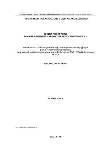 Paweł Bartoszewicz, Tłumacz Przysięgły Języka Angielskiego, ul. Bielawska 36c/122, 05-520 Konstancin-Jeziorna TŁUMACZENIE POŚWIADCZONE Z JĘZYKA ANGIELSKIEGO SKRÓT PROSPEKTU GLOBAL PARTNERS - KREDYT BANK POLISH WINNERS 1 subfunduszu publicznego otwartego towarzystwa inwestycyjnego prawa luksemburskiego (sicav) opartego o inwestycje spełniające warunki dyrektywy 85/611/EWG dotyczącej UCITS GLOBAL PARTNERS 26 maja 2010 r. LU_07_PLAINVANILLA_SHAREBASKET-/- Strona 1 z 11 Skrót prospektu obejmuje:-/ informacje dotyczące sicav,-/ informacje dotyczące subfunduszu,-/ aneks zawierający corocznie uaktualniane informacje.-/W przypadku rozbieżności pomiędzy wersją angielską a innymi wersjami językowymi skrótu prospektu wiążąca jest wersja angielska.-/-/- Informacje dotyczące sicav-/1 Nazwa:-/Global Partners-/- 2 Data utworzenia:-/13 lipca 2007 r.-/- 3 Czas trwania:-/Nieograniczony-/- 4 Państwo członkowskie, w którym znajduje się siedziba Sicav:-/Luksemburg-/- 5 Status prawny:-/Sicav złożone z różnych subfunduszy, które wybrało inwestycje spełniające warunki dyrektywy 85/611/EWG i które w zakresie swych transakcji i inwestycji podlega Ustawie z dnia 20 grudnia 2002 r. o instytucjach wspólnego inwestowania.-/- 6 Rodzaj zarządzania:-/Sicav, które wskazało podmiot zarządzający dla instytucji wspólnego inwestowania: KBC Asset Management SA, 5, Place de la Gare, 1616 Luksemburg.-/- 7 Zlecenie zarządzania portfelem inwestycyjnym:-/Nie zlecono zarządzania portfelem inwestycyjnym.-/- 8 Zlecenie centralnej administracji Sicav:-/Podmiot Zarządzający powołał KREDIETRUST LUXEMBOURG S.A. na Agenta Siedziby, Agenta Administracyjnego i Agenta Rejestracyjno-Transferowego Spółki na podstawie umów, które weszły w życie dnia 1 maja 2006 r.-/Spółka KREDIETRUST LUXEMBOURG S.A. została utworzona dnia 16 lutego 1973 r. jako société anonyme zgodnie z prawem luksemburskim. Jej siedziba mieści się przy 11 rue Aldringen, L - 2960 Luksemburg. KREDIETRUST LUXEMBOURG S.A. jest spółką zależną KBL European Private Bankers S.A.-/W odniesieniu do całości lub części zleconych jej zadań i na własną odpowiedzialność KREDIETRUST LUXEMBOURG jako Agent Administracyjny oraz Agent Rejestracyjno-Transferowy może korzystać z usług European Fund Administration („E.F.A.”), société anonyme z siedzibą w Luksemburgu.-/KREDIETRUST LUXEMBOURG S.A. otrzymuje wynagrodzenie od Podmiotu Zarządzającego.-/- 9 Podmioty świadczące usługi finansowe:-/Podmiotem świadczącym usługi finansowe w Luksemburgu jest:-/KBL European Private Bankers S.A., 43, Boulevard Royal, L-2955 Luksemburg-/- 10 Dystrybutor:-/- KBC Asset Management S.A., 5, Place de la Gare, L-1616 Luksemburg.-/- Strona 2 z 11 11 Depozytariusz:-/- KBL European Private Bankers S.A., 43, Boulevard Royal, L-2955 Luksemburg.-/- 12 Biegły rewident:-/- Deloitte S.A., 560, rue de Neudorf, L-2220 Luksemburg.-/- 13 Promotor:-/- KBC Asset Management SA Luksemburg-/- 14 Opodatkowanie:-/- W odniesieniu do sicav:-/-/Zgodnie z obecnie obowiązującymi przepisami prawa luksemburskiego i powszechną praktyką Sicav nie podlega opodatkowaniu dochodów w Luksemburgu. Jednak Sicav jest zobowiązane do zapłaty podatku od subskrypcji wynoszącego 0,05% wartości aktywów netto w skali roku, o ile nie podano inaczej. Powyższy podatek przypada do zapłaty co kwartał i jest obliczany na podstawie aktywów netto Sicav na koniec kwartału. Oprócz podatku z tytułu rejestracji spółki w wysokości 1200 EUR, płatnego jednorazowo przy rejestracji, w Luksemburgu nie są pobierane żadne opłaty skarbowe ani inne podatki od emisji tytułów uczestnictwa w Sicav.-/W Luksemburgu nie obowiązują żadne podatki z tytułu zrealizowanych lub niezrealizowanych zysków kapitałowych Sicav. Dochody uzyskane przez Sicav ze swoich inwestycji mogą podlegać różnym stawkom podatku potrącanego u źródła w danych krajach. Wspomniany podatek potrącany u źródła nie zawsze może być odzyskany.-/Powyższe informacje oparte są na obecnie obowiązujących przepisach prawa i praktykach oraz mogą ulec zmianie.-/-/Zasady opodatkowania dochodów i zysków kapitałowych uzyskanych przez inwestorów zależą od przepisów prawa obowiązujących poszczególnych inwestorów. W przypadku wątpliwości dotyczących obowiązujących zasad opodatkowania inwestor powinien samodzielnie zasięgnąć porady zawodowych lub kompetentnych doradców.-/- 15 Informacje dodatkowe:-/- 15.1. Źródła informacji:-/Prospekt, statut oraz roczne i półroczne sprawozdania oraz - w razie potrzeby - pełne informacje na temat pozostałych subfunduszy można uzyskać bezpłatnie na żądanie od podmiotów świadczących usługi finansowe przed lub po subskrypcji tytułów uczestnictwa.-/-/- 15.2. Kompetentny organ:-/Commission de Surveillance du Secteur Financier (CSSF)-/110, route d’Arlon-/L- 2991 Luksemburg-/Skrót prospektu zostanie opublikowany po zatwierdzeniu przez CSSF zgodnie z Ustawą z dnia 20 grudnia 2002 r. o instytucjach wspólnego inwestowania. Wspomniane zatwierdzenie nie obejmuje oceny stosowności lub jakości oferty ani okoliczności jej dokonywania.-/- 15.3. Osoba lub osoby odpowiedzialne za treść prospektu i skrótu prospektu:-/Zarząd sicav-/Zgodnie z najlepszą wiedzą Zarządu informacje zawarte w prospekcie i skrócie prospektu są prawdziwe i poprawne oraz nie pominięto żadnych informacji, które zmieniałyby znaczenie prospektu lub skrótu prospektu.-/- 15.4. Osoba kontaktowa, od której można uzyskać w razie konieczności dodatkowe informacje:-/Pan Karel De Cuyper, Dirigeant KBC Asset Management S.A., 5, Place de la Gare, L-1616 Luksemburg, tel. 00 352 299881201.-/- Strona 3 z 11 Informacje dotyczące subfunduszu Kredyt Bank Polish Winners 1-/1. Informacje podstawowe-/- 1.1. Nazwa:-/- Kredyt Bank Polish Winners 1-/- 1.2. Data uruchomienia:-/- Od 26 maja 2010 r. do 28 maja 2010 r.-/- 1.3. Czas trwania:-/- Ograniczony do 30 maja 2014