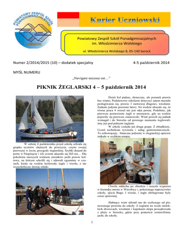 Powiatowy Zespół Szkół Ponadgimnazjalnych im. Włodzimierza Wolskiego ul. Włodzimierza Wolskiego 8, 05-140 Serock Numer 2/2014/2015 (10) – dodatek specjalny 4-5 październik 2014 MYŚL NUMERU „Navigare necesse est…” PIKNIK ŻEGLARSKI 4 – 5 październik 2014 Dzień był piękny, słoneczny, ale poranek prawie bez wiatru. Podstawowe szkolenie dotyczyć zatem musiało posługiwania się, prawie 3 metrowej długości, wiosłami. Zadanie jedynie pozornie łatwe. Na wodzie okazało się, że równa praca 4 wioseł nie jest taka prosta. Podobnie, jak pierwsze postawienie żagli w momencie, gdy na wodzie pojawiły się pierwsze zmarszczki. Wiatr powoli się jednak wzmagał i do Serocka od pewnego momentu żeglowaliśmy już pod pełnymi żaglami. W szkole czekała już druga grupa. Z obiadkiem.. Uczeń technikum żywienia i usług gastronomicznych.. To zobowiązuje.. Smaczne jedzenie w eleganckiej oprawie znikało w szybkim tempie. W sobotę 4 października przed szkołą zebrała się grupka uczniów chętnych do przeżycia, często swojej pierwszej w życiu, przygody żeglarskiej. Szybki dojazd do portu w Nieporęcie i ich oczom ukazała się DZ-eta… Dla pokolenia starszych wiekiem sterników jacht prawie kultowy, na którym szkolili się i zdawali egzaminy w czasach, kiedy na wodzie królowały żagle i wiosła, a nie wszechobecne dzisiaj silniki. Chwila oddechu po obiedzie i ruszyła wyprawa w kierunku mostu w Wierzbicy i, położonego naprzeciwko szkoły, ujścia Bugu. I wiosła, i żagle obsługiwane były coraz sprawniej. Słabnący wiatr skłonił nas do szybszego od planowanego powrotu do szkoły. Z żaglami na wcale nielekkich drzewcach, wiosłami i kapokami ekipa powędrowała z plaży w Serocku, gdzie przy pomoście zostawiliśmy jacht, do szkoły. 1 Rano śniadanko. Obowiązkowa niedzielna jajecznica. Wiatru nie było nawet na lekarstwo. Ożyła zatem i hala sportowa, i konsole do gier. Szybki lunch i ze wszystkimi gratami ekipa schodziła już w kierunku Narwi. Przygotowanie jachtu do wypłynięcia zajęło już o wiele mniej czasu niż dzień wcześniej. A i wiatr pojawił się jak na zamówienie. Kilka godzin pięknego żeglowania i niestety na horyzoncie pojawił się port w Nieporęcie. Sklarowanie* jachtu i ok. godziny 17 wszyscy uczestnicy biwaku byli już w drodze do domów. Z pytaniem na ustach, kiedy następny raz. Na wieczór przygotowany został grill. Po dniu na wodzie apetyty dopisywały. Przy okazji, ile to osób przyszło sprawdzić, jak młodzież przeżyła pierwszy dzień na wodzie… Okazało się, że uczestnikom pikniku energii zostało jeszcze tyle, że do godzin nocnych na sali piłka była odbijana, rzucana, kopana, a na siłowni trenowane mięśnie przed kolejnym dniem walki z wiosłami. Powodzeniem cieszyły się również i gry komputerowe. Wideoprojektor i głośniki zapewniły efekty o wiele lepsze niż nawet największy telewizor w warunkach domowych. W imprezie uczestniczyło łącznie 14 uczniów i nieco tylko mniej liczne grono nauczycieli. Na wodzie pływali panowie: Jarosław Czyżewski, Bartosz Lipko i Marek Szajda, część lądowo-kuchenną bardzo dzielnie wsparły panie: Anna Biernacka, Teresa Gumieniak, Marta Kulesza i Magdalena Lusa. Podziękowania należą się dodatkowo panu Sławkowi, który wsparł swoją osobą transport do i z Nieporętu. A wszystko pod czujnym okiem pań dyrektorek, w myśl przysłowia „Pańskie oko konia tuczy”….. *- to dziwne słówko oznacza zrobienie porządków Jarosław Czyżewski Nocka pokazała, że do spania potrzebne są wyłącznie śpiwór i kawałek materaca, a niekoniecznie wygodne łóżeczko. Było OK!!!!! 2 AHOJ PRZYGODO!!! Choć sezon żeglarski dobiega końca i pogoda nie sprzyja uprawianiu sportów, uczniowie Powiatowego Zespołu Szkół Ponadgimnazjalnych w Serocku nadal są aktywni. 4 października 2014 wzięliśmy udział w pierwszym pikniku żeglarskim zorganizowanym przez opiekuna Koła Żeglarskiego, które właśnie rozpoczęło działalność w naszej szkole. Pełni zapału, żądni przygód i ciekawi żeglugi udaliśmy się do Nieporętu. Wczesnym rankiem zaczęliśmy przygotowywać żaglówkę, poznawać elementy wyposażenia na pokładzie oraz zapoznawać się z podstawowymi komendami. Oczywiście każdy z nas został zaopatrzony w kapok, by wyprawa była bezpieczna. Po krótkim szkoleniu mogliśmy wreszcie wypłynąć. Ten moment, bez przesady, rozpoczął nowy rozdział w życiu niektórych z nas. A wszystko to dzięki panu Jarosławowi Czyżewskiemu i panu Markowi Szajdzie. Podczas całego rejsu towarzyszyła nam atmosfera szant i morskich opowieści. Byliśmy zafascynowani tym, jak można panować nad żaglówką, jak poruszać się po wodzie, by nie zakłócić spokoju innym. Nauczyliśmy się szacunku, jakim powinno obdarzać się naturę, a także ludzi, którzy mają takie same pasje. Zauważyliśmy, ile pracy trzeba poświęcić, by móc opanować trudną sztukę żeglowania. Nauczyliśmy się też pozdrawiać każdego, kto mijał nas motorówką, skuterem czy jachtem. Zgodnie z tradycją pikniku nie mogło zabraknąć grilla. Zapominaliśmy się w smaku i zapachu jabłek z cynamonem i szaszłyków. Zaopatrzeni w śpiwory spędziliśmy noc na oglądaniu filmów o tematyce żeglarskiej, a także na rozmowach o tym, jak można połączyć swoje życie osobiste z pasją. Nasze żeglowanie trwało dwa dni. Był to czas poświęcony na rozrywkę, refleksję i zdobywanie nowych doświadczeń. Pod koniec pikniku pojawiały się pytania o kolejne spotkanie. Każdy z nas będzie na pewno czekał na sposobność, by przez chwilę poczuć się częścią żeglarskiej drużyny, która może uzyskać sukces tylko dzięki współdziałaniu i zaangażowaniu wszystkich uczestników. Myślę, że ten weekend został dobrze wykorzystany i na pewno będziemy go mile wspominać. Katarzyna Obrębska, kl. IV TH „Kurier Uczniowski” Miesięcznik młodzieży szkolnej PZSP w Se