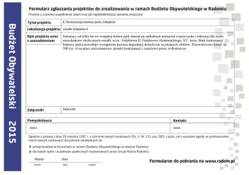 8. Kontynuacja budowy parku Gołębiów osiedle Gołębiów II Istniejący od kilku lat we wstępnej formie park okazał się unikalnym miejscem wypoczynku i rekreacji dla wielu mieszkańców okolicznych osiedli, m.in.: Gołębiowa II, Gołębiowa Akademickiego, XV -lecia. Brak kontynuacji budowy parku powoduje wystąpienie procesu degradacji dotychczas uzyskanych efektów. Przewidywany koszt: ok. 500 tys. zł na prace utrzymaniowe, projekt kontynuacji i częściowe prace wykonawcze. Załączniki xxxxx xxxxx X X Miasto Data 13. Rowerem po Radomiu ulica 11 Listopada (fragment od ul. Zbrowskiego do ul. Chrobrego) Zarówno na ulicy Zbrowskiego jak i Chrobrego znajdują się ścieżki rowerowe. Brakuje im jedynie połączenia. Wnoszę dlatego o stworzenie ścieżki na odpowiednim odcinku ulicy 11 listopada, która pozwoli bezpiecznie poruszać się rowerem tą częścią miasta. Załączniki xxxxx xxxxx X X Miasto Data 17. Droga do Radomiaka Ulica Marusarzówny Obecnie ulica Marusarzówny jest ułożona z płyt chodnikowych. Uważam, że droga, która prowadzi na Stadion Radomiaka powinna zostać wyremontowana i pokryta asfaltem. Nie wyobrażam sobie by ludzie przychodzący na stadion nadal musieli uważać by nie skręcić nogi na drogowych dziurach. Załączniki xxxxx xxxxx X X Miasto Data 18. Bezpieczna droga do szkoły Ulica Żwirki i Wigury (fragment przy skrzyżowaniu z ulica 11-go Listopada) Dziesiątki dzieci codziennie uczęszczających do Publicznej Szkoły Podstawowej przechodzi przez ulicę Żwirki i Wigury. Ulice niezwykle niebezpieczną, na której wielokrotnie zostały potracone dzieci. Zdając sobie sprawę, ze utworzenie sygnalizacji świetlnej w tym miejscu jest mało prawdopodobne wnoszę o utworzenie przy przejściu dla pieszych wysepki zwalniające. Podobne znajdują się w innych miejscach w Radomiu, np. na ulicy Kusocińskiego przy PSP Nr 34. Załączniki xxxxx xxxxx X X Miasto Data 31. Plac zabaw dla dzieci "Michałów" teren zieleni za blokiem przy ul .Królowej Jadwigi 10 na osiedlu "Michałów" Plac zabaw powinien być chociaż częściowo wyłożony bezpieczną nawierzchnią (w części dla najmłodszych dzieci). Całość ogrodzona płotkiem o wysokości ok. 1 m. W części dla młodszych dzieci powinny znaleźć się np. domek z moskitem i ślizgawką, bujaczki, karuzela, 2 huśtawki lub inne. W części z podłożem naturalnym dla starszych dzieci powinny znaleźć się m.in.: huśtawka duża, ślizgawka, "pajęczyna" do wspinania, duża piaskownica (najlepiej z możliwością przykrycia na ziemię) lub inne. Wzdłuż ogrodzenia od wew. powinny być ustawione ławki dla opiekunów. W tej części osiedla bardzo potrzebny jest plac zabaw z prawdziwego zdarzenia. Teren wyznaczony przez nas jest najlepszym miejscem z uwagi na: dużą odległość ulic, bliskość bloków z dużą ilością dzieci w różnym wieku, bliskość asfaltowego boiska na którym dzieci jeżdżą na rowerach i grają w piłkę. Miejsce to jest także widoczne z okien większości mieszkań, więc dzieci starsze byłyby pod większą kontrolą osób dorosłych. Załączniki xxxxx xxxxx X X Miasto Data 38. Modernizacja terenu do celów rekreacyjno – sportowych dla dzieci, młodzieży i dorosłych. Radom, osiedle bloków socjalnych, ul. Mroza OPIS PROJEKTU WRAZ Z UZASADNIENIEM 1. Zatwierdzenie proponowanej lokalizacji. 2. Wyrównanie i przygotowanie terenu. 3. Ogrodzenie boiska i zamontowanie piłkochwytów. 4. Zamontowanie bramek do gry w piłkę nożną. Uzasadnienie: Na terenie osiedla funkcjonują nieformalne drużyny piłki nożnej, siatkowej i koszykówki. Dzieci, młodzież jak i dorośli są zainteresowani spędzaniem wolnego czasu na grach zespołowych. Dojazd do innych obiektów sportowych jest utrudniony. Z naszej strony deklarujemy układ pracy fizycznej przy urządzaniu terenu. Załączniki xxxxx xxxxx X X Miasto Data 39. Bezpieczne otoczenie przyjaznego miejsca Radom, ul. Królowej Jadwigi 15, os. Michałów W budynku przy ul. Królowej Jadwigi 15 mieści się: - Przedsiębiorstwo Społeczne „Gospoda Jaskółeczka” utworzone w 2007 roku, przez Stowarzyszenie Ochrony Zdrowia Psychicznego „Wzajemna Pomoc”, - Warsztat Terapii Zajęciowej utworzony przez Polski Związek Niewidomych Okręg Mazowiecki – funkcjonuje od 2007 roku, - Miejski Ośrodek Pomocy Społecznej Zespół Pracy Socjalnej Nr 5. Wyżej wymienione placówki współpracują ze sobą podejmując działania na rzecz osób niepełnosprawnych oraz mieszkańców miasta Radomia. Pragniemy podkreślić, że Warsztaty Terapii Zajęciowej i Przedsiębiorstwo Społeczne ściśle współpracują w realizowaniu zadań z zakresu rehabilitacji społecznej i zawodowej osób niepełnosprawnych, szczególnie narażonych na wykluczenie społeczne. W wyniku realizacji prac związanych z ociepleniem i odnowieniem elewacji budynku w 2014 r. niezbędne jest wykonanie dodatkowych prac celem poprawy bezpieczeństwa i wizerunku otoczenia budynku. Niezbędne jest wykonanie następujących prac: - podwyższenie ogrodzenia, wykonanie bramy i furtki oraz odmalowanie. - obudowa z elementami szklanymi tarasu zewnętrznego wraz z ułożeniem płytek na część tarasu, wymiana zdewastowanych płyt chodnikowych na ścieżkach ogrodowych, - platforma dla osób niepełnosprawnych uczestników WTZ. Przewidywany koszt prac wynosi ok. 350 000 zł. Reasumując zwracamy się z prośbą o umieszczenie w budżecie Miasta Radomia na rok 2015 wyżej wymienionych prac. Działania te bezwzględnie podniosą estetykę otoczenia budynku i osiedla Michałów oraz podniosą poziom bezpieczeństwa osób niepełnosprawnych i osób ich wspierających na co dzień funkcjonujących w obiekcie. Budynek należy do zasobów Gminy Miasta Radomia, a zarządzany jest przez Miejski Zarząd Lokalami, wszyscy użytkownicy dbają o estetykę otoczenia. Jednocześnie informujemy, iż w związku z pracami związanymi z odnowieniem elewacji zostanie z naszych środków wyko
