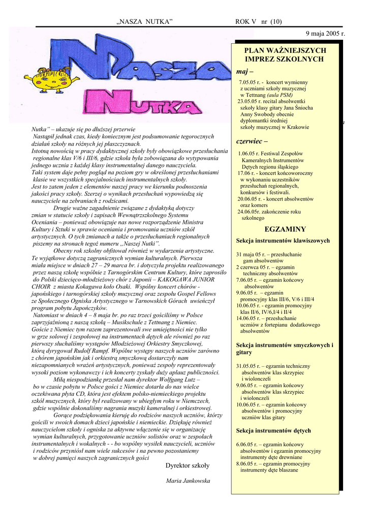 „NASZA NUTKA” ROK V nr (10) 9 maja 2005 r. PLAN WAŻNIEJSZYCH IMPREZ SZKOLNYCH maj – Nutka” – ukazuje się po dłuższej przerwie Nastąpił jednak czas, kiedy koniecznym jest podsumowanie tegorocznych działań szkoły na różnych jej płaszczyznach. Istotną nowością w pracy dydaktycznej szkoły były obowiązkowe przesłuchania regionalne klas V/6 i III/6, gdzie szkoła była zobowiązana do wytypowania jednego ucznia z każdej klasy instrumentalnej danego nauczyciela. Taki system daje pełny pogląd na poziom gry w określonej przesłuchaniami klasie we wszystkich specjalnościach instrumentalnych szkoły. Jest to zatem jeden z elementów naszej pracy we kierunku podnoszenia jakości pracy szkoły. Szerzej o wynikach przesłuchań wypowiedzą się nauczyciele na zebraniach z rodzicami. Drugie ważne zagadnienie związane z dydaktyką dotyczy zmian w statucie szkoły i zapisach Wewnątrzszkolnego Systemu Oceniania – ponieważ obowiązuje nas nowe rozporządzenie Ministra Kultury i Sztuki w sprawie oceniania i promowania uczniów szkół artystycznych. O tych zmianach a także o przesłuchaniach regionalnych piszemy na stronach tegoż numeru „Naszej Nutki”. Obecny rok szkolny obfitował również w wydarzenia artystyczne. Te wyjątkowe dotyczą zagranicznych wymian kulturalnych. Pierwsza miała miejsce w dniach 27 – 29 marca br. i dotyczyła projektu realizowanego przez naszą szkołę wspólnie z Tarnogórskim Centrum Kultury, które zaprosiło do Polski dziecięco-młodzieżowy chór z Japonii – KAKOGAWA JUNIOR CHOIR z miasta Kokagawa koło Osaki. Wspólny koncert chórów japońskiego i tarnogórskiej szkoły muzycznej oraz zespołu Gospel Fellows ze Społecznego Ogniska Artystycznego w Tarnowskich Górach uwieńczył program pobytu Japończyków. Natomiast w dniach 4 – 8 maja br. po raz trzeci gościliśmy w Polsce zaprzyjaźnioną z naszą szkołą – Musikschule z Tettnang z Niemiec. Goście z Niemiec tym razem zaprezentowali swe umiejętności nie tylko w grze solowej i zespołowej na instrumentach dętych ale również po raz pierwszy słuchaliśmy występów Młodzieżowej Orkiestry Smyczkowej, którą dyrygował Rudolf Rampf. Wspólne występy naszych uczniów zarówno z chórem japońskim jak i orkiestrą smyczkową dostarczyły nam niezapomnianych wrażeń artystycznych, ponieważ zespoły reprezentowały wysoki poziom wykonawczy i ich koncerty zyskały duży aplauz publiczności. Miłą niespodziankę przesłał nam dyrektor Wolfgang Lutz – bo w czasie pobytu w Polsce gości z Niemiec dotarła do nas wielce oczekiwana płyta CD, która jest efektem polsko-niemieckiego projektu szkół muzycznych, który był realizowany w ubiegłym roku w Niemczech, gdzie wspólnie dokonaliśmy nagrania muzyki kameralnej i orkiestrowej. Gorące podziękowania kieruję do rodziców naszych uczniów, którzy gościli w swoich domach dzieci japońskie i niemieckie. Dziękuję również nauczycielom szkoły i ogniska za aktywne włączenie się w organizację wymian kulturalnych, przygotowanie uczniów solistów oraz w zespołach instrumentalnych i wokalnych - - bo wspólny wysiłek nauczycieli, uczniów i rodziców przyniósł nam wiele sukcesów i na pewno pozostaniemy w dobrej pamięci naszych zagranicznych gości Dyrektor szkoły Maria Jankowska 7.05.05 r. - koncert wymienny z uczniami szkoły muzycznej w Tettnang (aula PSM) 23.05.05 r. recital absolwentki szkoły klasy gitary Jana Śniocha Anny Swobody Drodzyobecnie Czytelnicy! dyplomantki średniej Pisemko szkolne „Nasza szkoły muzycznej w Krakowie czerwiec – 1.06.05 r. Festiwal Zespołów Kameralnych Instrumentów Dętych regionu śląskiego 17.06 r. - koncert końcoworoczny w wykonaniu uczestników przesłuchań regionalnych, konkursów i festiwali. 20.06.05 r. - koncert absolwentów oraz komers 24.06.05r. zakończenie roku szkolnego EGZAMINY Sekcja instrumentów klawiszowych 31 maja 05 r. – przesłuchanie gam absolwentów 2 czerwca 05 r. – egzamin techniczny absolwentów 7.06.05 r. – egzamin końcowy absolwentów 9.06.05 r. – egzamin promocyjny klas III/6, V/6 i III/4 10.06.05 r. - egzamin promocyjny klas II/6, IV/6,I/4 i II/4 14.06.05 r. – przesłuchanie uczniów z fortepianu dodatkowego absolwentów Sekcja instrumentów smyczkowych i gitary 31.05.05 r. – egzamin techniczny absolwentów klas skrzypiec i wiolonczeli 9.06.05 r. – egzamin końcowy absolwentów klas skrzypiec i wiolonczeli 10.06.05 r. – egzamin końcowy absolwentów i promocyjny uczniów klas gitary Sekcja instrumentów dętych 6.06.05 r. – egzamin końcowy absolwentów i egzamin promocyjny instrumenty dęte drewniane 8.06.05 r. – egzamin promocyjny instrumenty dęte blaszane „NASZA NUTKA” ROK V nr 1(10) 9 maja 2005 r. Przesłuchania uczniów klas V/6 i III/4. W tym roku wprowadzono nowy sposób przeprowadzania przesłuchań regionalnych w klasach V/6 i III/4. Każdy nauczyciel mający uczniów lub ucznia w w/w klasach był zobowiązany przygotować co najmniej jednego na wspomniane przesłuchanie (nie dokonywano wyboru poprzez przesłuchania wewnątrzszkolne), niezależnie od poziomu umiejętności swego wychowanka. Forma przesłuchań jest słuszna i godna kontynuacji. Odstąpienie od konkursowego charakteru na rzecz zwiększenia przydatności dydaktycznej jest bardzo potrzebne uczniowi i nauczycielowi. Przesłuchania w których program jest elastyczny, umożliwiający udział uczniom o różnym poziomie indywidualnego rozwoju ( np. uczniom przechodzącym z innego instrumentu) pomaga w planowaniu ich dalszej nauki, oraz jest sprawdzianem prawidłowego doboru repertuaru przez pedagoga. Dla uczniów najzdolniejszych opracowuje się plan dalszego rozwoju, w który przewiduje się różnego typu występy, wyjazdy na konkursy i festiwale. Nauczyciele których uczniowie uzyskali słabszy wynik na przesłuchaniach niż ocena na koniec roku 2003/2004 oraz za I semestr 2004/2005 dokonają analizy występu i uzasadnią „