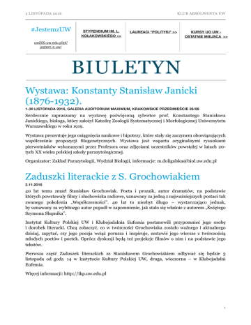 3 LISTOPADA 2016 #JestemzUW KLUB ABSOLWENTA UW STYPENDIUM IM. L. KOŁAKOWSKIEGO >> LAUREACI "POLITYKI" >> KURSY UO UW OSTATNIE MIEJSCA >> uw200.uw.edu.pl/pl/ jestem-z-uw/ BIULETYN Wystawa: Konstanty Stanisław Janicki (1876-1932). 1-30 LISTOPADA 2016, GALERIA AUDITORIUM MAXIMUM, KRAKOWSKIE PRZEDMIEŚCIE 26/28 Serdecznie zapraszamy na wystawę poświęconą sylwetce prof. Konstantego Stanisława Janickiego, biologa, który założył Katedrę Zoologii Systematycznej i Morfologicznej Uniwersytetu Warszawskiego w roku 1919. Wystawa prezentuje jego osiągnięcia naukowe i hipotezy, które stały się zaczynem obowiązujących współcześnie propozycji filogenetycznych. Wystawa jest wsparta oryginalnymi rysunkami pierwotniaków wykonanymi przez Profesora oraz zdjęciami uczestników powstałej w latach 20tych XX wieku polskiej szkoły parazytologicznej. Organizator: Zakład Parazytologii, Wydział Biologii, informacje: [email protected] Zaduszki literackie z S. Grochowiakiem 3.11.2016 40 lat temu zmarł Stanisław Grochowiak. Poeta i prozaik, autor dramatów, na podstawie których powstawały filmy i słuchowiska radiowe, uznawany za jedną z najważniejszych postaci tak zwanego pokolenia „Współczesności”. 40 lat to niezbyt długo – wystarczająco jednak, by uznawany za wybitnego autor popadł w zapomnienie, jak stało się właśnie z autorem „Świętego Szymona Słupnika”. Instytut Kultury Polskiej UW i Klubojadalnia Eufemia postanowili przypomnieć jego osobę i dorobek literacki. Chcą zobaczyć, co w twórczości Grochowiaka zostało ważnego i aktualnego dzisiaj, zapytać, czy jego poezja wciąż porusza i inspiruje, zestawić jego wiersze z twórczością młodych poetów i poetek. Oprócz dyskusji będą też projekcje filmów o nim i na podstawie jego tekstów. Pierwsza część Zaduszek literackich ze Stanisławem Grochowiakiem odbywać się będzie 3 listopada od godz. 14 w Instytucie Kultury Polskiej UW, druga, wieczorna – w Klubojadalni Eufemia. Więcej informacji: http://ikp.uw.edu.pl )1 3 LISTOPADA 2016 Radio Kampus - Absolwenci UW 5.11.2016 PO GODZ. 10.00, 97,1 FM Gościem programu w Akademickim Radiu Kampus będzie absolwentka historii sztuki na Uniwersytecie Warszawskim, obecnie profesor Akademii Sztuk Pięknych, Dorota FolgaJanuszewska. Dorota Folga-Januszewska była pracownikiem naukowym UW, gdzie w 1979 r. uzyskała stopień doktora, a w 2007 r. została doktorem habilitowanym. Przez 30 lat pracowała w Muzeum Narodowym w Warszawie, przechodząc wszystkie szczeble kariery. Obecnie jest zastępcą dyrektora w Muzeum Pałacu Króla Jana III w Wilanowie i profesorem ASP w Warszawie. Profesor Dorota Folga-Januszewska jest autorką wielu publikacji i opracowań dotyczących teorii sztuki od XVI do XX w., muzeologii i grafiki. Była wielokrotnie nagradzana w konkursach w Polsce i za granicą. Na antenie radia opowie o tym, jak wyglądały studia w końcu lat 70. XX w., dlaczego wybrała historię sztuki, co sądzi o twórczości Zdzisława Beksińskiego, a także jak pojmuje patriotyzm. Cykl wywiadów z absolwentami UW prowadzi redaktor Maciej Kwiek, absolwent Wydziału Dziennikarstwa i Nauk Politycznych Uniwersytetu Warszawskiego oraz członek Klubu Absolwenta UW. Od swoich gości wydobywa często ciekawe i nieznane szerszej publiczności historie związane ze studiowaniem na Uniwersytecie. W audycji gościł m.in. profesora i cukiernika Andrzeja Bliklego, reportażystę Mariusza Szczygła, redaktor Dorotę Warakomską, prezesa Legii Bogusława Leśnodorskiego. Emisja rozmowy z prof. Dorotą Folgą-Januszewską odbędzie się 5 listopada po godz. 10.00 na antenie Radia Kampus (97,1 FM). Poprzednie audycje >> Terminarz meczów AZS UW 5-6.11.2016 Zachęcamy do kibicowania sportowcom z AZS UW. III liga koszykówki mężczyzn sobota 5.11.2016 godz. 12:00 – Hala WZ UW, ul. Szturmowa 1/3, Warszawa AZS UW – MK Grójec KLUB ABSOLWENTA UW Geometria trąbki a ewolucja Wszechświata Efekty gwałtownego „pęcznienia” Wszechświata tuż po Wielkim Wybuchu można porównać do efektów, które powodują rozchodzenie się ścieżek mrówek podróżujących po powierzchni trąbki. Przekonują o tym naukowcy z Polski i z Francji w pracy opublikowanej we wrześniu w czasopiśmie „Physical Review Letters”. wiecej >> Nowe nadprzewodniki? Chemicy z UW poszukują nowych nadprzewodników. Tym razem sprawdzali właściwości magnetyczne i strukturalne fluorków dwuwartościowego srebra zawierających sód, potas, rubid lub cez. W badaniach brali udział naukowcy z zespołu Laboratorium Technologii Nowych Materiałów Funkcjonalnych CeNT UW oraz z Uniwersytetu Kardynała Stefana Wyszyńskiego wraz z kolegami ze Słowenii, Belgii oraz USA. Więcej >> )2 3 LISTOPADA 2016 KLUB ABSOLWENTA UW II liga piłki siatkowej mężczyzn sobota 5.11.2016 godz. 18:00 – Hala WZ UW, ul. Szturmowa 1/3, Warszawa Czołg AZS UW – Legia Warszawa II liga piłki nożnej kobiet niedziela 6.11.2016 godz. 14:00 – Boisko, al. Zieleniecka 2, Warszawa AZS UW – MUKS Tomaszów Mazowiecki Szczegóły na: www.kuazsuw.pl Zniżki w Gabinecie Fizjoterapii 20% ZNIŻKI, KAROWA 18 Gabinet Fizjoterapii Klubu Uczelnianego AZS Uniwersytetu Warszawskiego realizuje kompleksową fizjoterapię zarówno dla osób ze skierowaniem jak i bez. Dla tych, którzy potrzebują pomocy w wyborze najlepszej formy terapii oferujemy konsultacje fizjoterapeutyczne. W naszym Gabinecie realizujemy zabiegi z zakresu terapii manualnej, terapię z wykorzystaniem specjalistycznych metod fizjoterapeutycznych, igłoterapię, kinezjotaping, tradycyjne ćwiczenia indywidualne, masaż oraz całą gamę zabiegów fizykoterapeutycznych wykonywanych za pomocą nowoczesnych aparatów. Dla członków Klubu Absolwenta UW gabinet oferuje 20% zniżkę (po okazaniu Karty Absolwenta UW). Gabinet znajduje się na ul. Karowej 18. Szczegóły na stronie: www.kuazsuw.pl Chopin był z UW – koncert 6.11.2016, GODZ. 17.00, AUDITORIUM MAXIMUM, KRAKOWSKIE