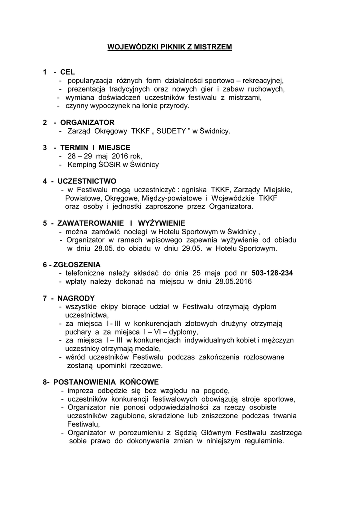 WOJEWÓDZKI PIKNIK Z MISTRZEM 1 - CEL - popularyzacja różnych form działalności sportowo – rekreacyjnej, - prezentacja tradycyjnych oraz nowych gier i zabaw ruchowych, - wymiana doświadczeń uczestników festiwalu z mistrzami, - czynny wypoczynek na łonie przyrody. 2 - ORGANIZATOR - Zarząd Okręgowy TKKF „ SUDETY ” w Świdnicy. 3 - TERMIN I MIEJSCE - 28 – 29 maj 2016 rok, - Kemping ŚOSiR w Świdnicy 4 - UCZESTNICTWO - w Festiwalu mogą uczestniczyć : ogniska TKKF, Zarządy Miejskie, Powiatowe, Okręgowe, Między-powiatowe i Wojewódzkie TKKF oraz osoby i jednostki zaproszone przez Organizatora. 5 - ZAWATEROWANIE I WYŻYWIENIE - można zamówić noclegi w Hotelu Sportowym w Świdnicy , - Organizator w ramach wpisowego zapewnia wyżywienie od obiadu w dniu 28.05. do obiadu w dniu 29.05. w Hotelu Sportowym. 6 - ZGŁOSZENIA - telefoniczne należy składać do dnia 25 maja pod nr 503-128-234 - wpłaty należy dokonać na miejscu w dniu 28.05.2016 7 - NAGRODY - wszystkie ekipy biorące udział w Festiwalu otrzymają dyplom uczestnictwa, - za miejsca I - III w konkurencjach zlotowych drużyny otrzymają puchary a za miejsca I – VI – dyplomy, - za miejsca I – III w konkurencjach indywidualnych kobiet i mężczyzn uczestnicy otrzymają medale, - wśród uczestników Festiwalu podczas zakończenia rozlosowane zostaną upominki rzeczowe. 8- POSTANOWIENIA KOŃCOWE - impreza odbędzie się bez względu na pogodę, - uczestników konkurencji festiwalowych obowiązują stroje sportowe, - Organizator nie ponosi odpowiedzialności za rzeczy osobiste uczestników zagubione, skradzione lub zniszczone podczas trwania Festiwalu, - Organizator w porozumieniu z Sędzią Głównym Festiwalu zastrzega sobie prawo do dokonywania zmian w niniejszym regulaminie. KONKURENCJE FESTIWALOWE 1 – TURNIEJ RINGO - startują 3 osobowe drużyny w tym minimum 1 kobieta, - system rozgrywek zostanie ustalony w zależności od ilości zgłoszeń. 2 – SIATKÓWKA RĘCZNIKOWA - startują drużyny składające się z 2K i 2M, grające w dowolnych parach, - przebijanie piłki wykonuje się przy pomocy ręcznika trzymanego za końce przez poszczególne pary w drużynie, - zagrywkę zza linii końcowej para wykonuje dopóki zdobywa punkty, - obowiązuje przemienność zagrywających par po stracie zagrywki. 3 – WIELOBÓJ WETERANÓW - konkurencja indywidualna w której starują : kobiety urodzone w 1976 roku i wcześniej, mężczyźni urodzeni w 1966 roku i wcześniej, - startujący wykonują zadania przygotowane przez zespół sędziowski, - zwycięża zawodnik, który zdobędzie największą ilość punktów, - punktacja jest prowadzona oddzielnie dla kobiet i mężczyzn. 4 – TURNIEJ PETANKI - startują drużyny 2 osobowe bez względu na płeć, - system rozgrywek zostanie ustalony w zależności od ilości zgłoszeń. 5 – RZUTKI DO TARCZY - konkurencja indywidualna w której startują uczestnicy Festiwalu, - oddzielna klasyfikacja kobiet i mężczyzn. PROGRAM MINUTOWY FESTIWALU 28 maja 2016 r. - sobota godz. 8,30 - 9,30 - przyjazd uczestników Festiwalu, zakwaterowanie, godz. 10,00 - OTWARCIE XVIII WOJEWÓDZKIEGO FESTIWALU GIER I ZABAW REKREACYJNYCH SPOTKANIA RODZINNE > ŚWIDNICA – 2016 < - Powitanie przybyłych Mistrzów Sportu godz. 10,30 - 14,00 - SIATKÓWKA RĘCZNIKOWA godz. 13,00 - 16,00 - TURNIEJ PETANKI godz. 14,00 - 17,00 - TURNIEJ RINGO godz. 18,00 - 19,00 - obiadokolacja godz. 19,00 - 20,00 - RZUTKI DO TARCZY godz. 20,30 - 1,00 - spotkanie przy muzyce 29 maja 2016 r. – niedziela godz. 9,00 - 9,30 - śniadanie godz. 10,00 -12,00 - WIELOBÓJ WETERANÓW godz. 12,00 -12,30 - ZAKOŃCZENIE XVIII WOJEWÓDZKIEGO FESTIWALU GIER I ZABAW REKREACYJNYCH > SPOTKANIA RODZINNE - ŚWIDNICA - 2016 < WRĘCZANIE PUCHARÓW, MEDALI I DYPLOMÓW PRZEZ MISTRZÓW SPORTU Losowanie nagród wśród uczestników Festiwalu. godz. 13,30 - 14,00 – obiad