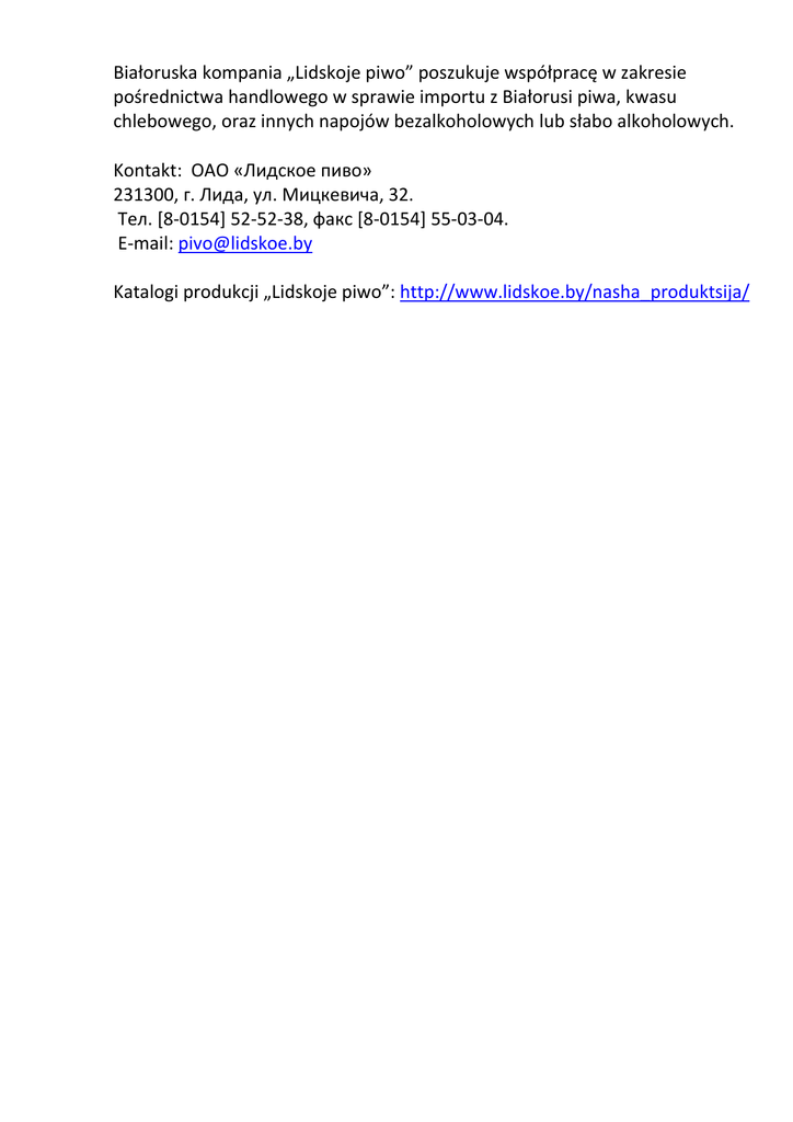 Białoruska kompania „Lidskoje piwo” poszukuje współpracę w zakresie pośrednictwa handlowego w sprawie importu z Białorusi piwa, kwasu chlebowego, oraz innych napojów bezalkoholowych lub słabo alkoholowych. Kontakt: ОАО «Лидское пиво» 231300, г. Лида, ул. Мицкевича, 32. Тел. [8-0154] 52-52-38, факс [8-0154] 55-03-04. E-mail: [email protected] Katalogi produkcji „Lidskoje piwo”: http://www.lidskoe.by/nasha_produktsija/