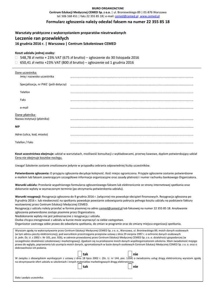 BIURO ORGANIZACYJNE Centrum Edukacji Medycznej CEMED Sp. z o.o. | ul. Broniewskiego 89 | 01-876 Warszawa tel. 506 168 451 | faks 22 355 85 18| e-mail: [email protected] www.cemed.pl Formularz zgłoszenia należy odesłać faksem na numer 22 355 85 18 Warsztaty praktyczne z wykorzystaniem preparatów nieutrwalonych Leczenie ran przewlekłych 16 grudnia 2016 r. | Warszawa | Centrum Szkoleniowe CEMED Koszt udziału jednej osoby: 548,78 zł netto + 23% VAT (675 zł brutto) – zgłoszenie do 30 listopada 2016 650,41 zł netto +23% VAT (800 zł brutto) – zgłoszenie od 1 grudnia 2016 Dane uczestnika: Imię i nazwisko uczestnika …………………………………………………………………………………………………………………………………………………… Specjalizacja, nr PWZ (jeśli dotyczy) …………………………………………………………………………………………………………………………………………………… Telefon …………………………………………………………………………………………………………………………………………………… Faks …………………………………………………………………………………………………………………………………………………… e-mail …………………………………………………………………………………………………………………………………………………… Dane płatnika: Nazwa instytucji (płatnika) …………………………………………………………………………………………………………………………………………………… NIP …………………………………………………………………………………………………………………………………………………… Adres (ulica, kod, miasto) …………………………………………………………………………………………………………………………………………………… Telefon / Faks …………………………………………………………………………………………………………………………………………………… Koszt uczestnictwa obejmuje: udział w warsztatach, możliwość konsultacji z wykładowcami, przerwy kawowe, dyplom potwierdzający udział Cena nie obejmuje kosztów noclegu. Uwaga! Szkolenie zostanie zrealizowane jedynie w przypadku zebrania odpowiedniej liczby uczestników. Potwierdzenie zgłoszenia: O przyjęciu zgłoszenia decyduje kolejność. Ilość miejsc ograniczona. Przyjęte zgłoszenie zostanie potwierdzone e-mailem lub faksem zawierającym szczegółowe informacje organizacyjne oraz zasady płatności i numer rachunku bankowego Organizatora. Warunki udziału: Przesłanie wypełnionego formularza zgłoszeniowego faksem lub elektronicznie ze strony internetowej spotkania oraz dokonanie wpłaty w wyznaczonym terminie (po otrzymaniu potwierdzenia udziału). Warunki rezygnacji: Rezygnacja zgłoszona do 9 grudnia 2016 r. (włącznie) nie powoduje obciążeń finansowych. Rezygnacja zgłoszona po 9 grudnia 2016 r. lub nieobecność na spotkaniu powoduje powstanie zobowiązania pokrycia pełnego kosztu udziału na podstawie faktury wystawionej przez Centrum Edukacji Medycznej CEMED. Rezygnację z udziału należy przesłać w formie pisemnej na adres [email protected] lub faksowej na numer 22 355 85 18. Anulowanie zgłoszenia potwierdzone zostaje pisemnie przez Organizatora. Niedokonanie wpłaty nie jest jednoznaczne z rezygnacją z udziału. Osoba chcąca zrezygnować z udziału w kursie może wyznaczyć za siebie zastępstwo. Organizator zastrzega sobie prawo do odwołania spotkania, do zmian w programie oraz do zmiany miejsca organizacji spotkania. Wyrażam zgodę na wykorzystywanie przez Centrum Edukacji Medycznej CEMED Sp. z o. o., Warszawa, ul. Broniewskiego 89, moich danych osobowych (w tym adresu poczty elektronicznej), pod warunkiem przestrzegania przepisów ustawy z dnia 29 sierpnia 1997 r. o ochronie danych osobowych (t. jedn. Dz. U. z 2002 r. Nr 101, poz. 926), w zakresie prowadzonej przez Centrum Edukacji Medycznej CEMED Sp. z o. o. działalności gospodarczej (w szczególności działalności szkoleniowej i marketingowej). Zgadzam się na przekazanie moich danych współorganizatorom szkolenia. Mam świadomość mojego prawa do wglądu, poprawiania lub usunięcia moich danych, zgromadzonych w bazie danych osobowych Centrum Edukacji Medycznej CEMED Sp. z o. o. oraz o dobrowolności ich podania. tak nie W związku z obowiązkiem wynikającym z ustawy z dnia 18 lipca 2002 r. (Dz. U. nr 144, poz. 1204) o świadczeniu usług drogą elektroniczną wyrażam zgodę na otrzymywanie ofert udziału w szkoleniach i innych materiałów marketingowych drogą elektroniczną. tak Data i podpis uczestnika: nie …………………………………………………………………………………………………………..