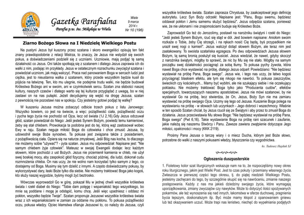 Gazetka Parafialna Parafia p.w. p.w. św. Mikołaja w Wielu Wiele 9 marca 2014 r. Nr 10 (196) Ziarno Bożego Słowa na I Niedzielę Wielkiego Postu Na pustyni Jezus był kuszony przez szatana i skoro ewangeliści opisują ten fakt znany prawdopodobnie z relacji Mistrza, to znaczy, że Jezus nie wstydził się swoich pokus, a doświadczeniami podzielił się z uczniami. Uczniowie, mają podjąć tę samą działalność co Jezus. Oni także spotkają się z szatanem i dlatego Jezus zaprawia ich do walki z nim, podając im przykłady. Jezus w ostatecznym rozrachunku zwyciężył szatana i powiedział uczniom, jak mają walczyć. Praca nad panowaniem Boga w sercach ludzi jest ciężka, jest to nieustanna walka z szatanem, który przede wszystkim będzie kusił do pójścia na łatwiznę. Ten, kto mu ulegnie, nie podejmie trudu walki, nie będzie budował Królestwa Bożego ani w swoim, ani w czyimkolwiek sercu. Szatan zna słabości naszej kultury, naszych czasów i dlatego warto się tej kulturze przyglądać z uwagą, bo w niej zastawi on na nas pułapki. Jeżeli decydujemy się wejść na drogę Jezusa, szatan z pewnością nie pozostawi nas w spokoju. Czy jesteśmy gotowi podjąć tę walkę? W kuszeniu Jezusa można zobaczyć odbicie trzech pokus z listu Janowego: Wszystko bowiem, co jest na świecie, a więc: pożądliwość ciała, pożądliwość oczu i pycha tego życia nie pochodzi od Ojca, lecz od świata (1J 2,16).Gdy Jezus odczuwał głód, szatan powiedział do Niego: Jeśli jesteś Synem Bożym, powiedz temu kamieniowi, żeby się stał chlebem. Prowokacja ta podobna jest do tej, którą wąż zastosował wobec Ewy w raju. Szatan neguje miłość Boga do człowieka i chce zmusić Jezusa, by udowodnił swoje Boże synostwo. Ta pokusa jest związana także z posiadaniem, z pożądliwością ciała. Opiera się na naturze zmysłowej. Jeśli Bóg nas kocha, to dlaczego nie możemy sobie "używać"? - pyta szatan. Jezus mu odpowiedział: Napisane jest: "Nie samym chlebem żyje człowiek". Mateusz w swojej Ewangelii dodaje: lecz każdym słowem, które pochodzi z ust Bożych. Jezus nie przemienił kamienia w chleb, nie użył swej boskiej mocy, aby zaspokoić głód fizyczny, chociaż później, dla ludzi, dokonał cudu rozmnożenia chleba. On nas uczy, że nie wolno nam korzystać tylko samym z tego, co dostajemy od Boga. Musimy się tym dzielić z innymi. A często doświadczamy pokusy, by wykorzystywać dary, łaski Boże tylko dla siebie. Nie możemy traktować Boga jako kogoś, kto służy naszej wygodzie, byśmy mogli żyć beztrosko. Wówczas wyprowadził Go w górę, pokazał Mu w jednej chwili wszystkie królestwa świata i rzekł diabeł do Niego: "Tobie dam potęgę i wspaniałość tego wszystkiego, bo mnie są poddane i mogę je odstąpić, komu chcę. Jeśli więc upadniesz i oddasz mi pokłon, wszystko będzie Twoje". Szatan proponuje Jezusowi wszystkie królestwa świata wraz z ich wspaniałościami w zamian za oddanie mu pokłonu. To pokusa pożądliwości oczu, pokusa władzy. Ojciec kłamstwa ofiaruje Jezusowi to, co należy do Jezusa, czyli wszystkie królestwa świata. Szatan zaprasza Chrystusa, by zaakceptował jego definicję autorytetu. Lecz Syn Boży odrzekł: Napisane jest: "Panu, Bogu swemu, będziesz oddawał pokłon i Jemu samemu służyć będziesz". Jezus odpędza szatana, ponieważ wie, że nie ukłonami i nie znajomościami buduje się Królestwo Boże. Zaprowadził Go też do Jerozolimy, postawił na narożniku świątyni i rzekł do Niego: "Jeśli jesteś Synem Bożym, rzuć się stąd w dół. Jest bowiem napisane: Aniołom swoim rozkaże o Tobie, żeby Cię strzegli, i na rękach nosić Cię będą, byś przypadkiem nie uraził swej nogi o kamień". Jezus walczył dotąd słowem Bożym, ale teraz nim jest zaatakowany. To swoista szatańska egzegeza. Po dwu odpowiedziach Jezusa słowem Bożym, tą samą bronią posłużył się kusiciel. Jezus wiedział, że nawet, gdyby skoczył z narożnika świątyni, mógłby to sprawić, że nic by Mu się nie stało. Mógłby na samym początku swej działalności pociągnąć za sobą tłumy. To pokusa pychy żywota, która nawet Boga chce wystawiać na próbę, dlatego Jezus odparł: Powiedziano: "Nie będziesz wystawiał na próbę Pana, Boga swego". Jezus wie, i tego nas uczy, że łatwo kogoś przyciągnąć blaskiem efektu, ale tym się nikogo nie nawróci. To pokusa zaszczytów, świeckich czy kościelnych... Mamy być wybitni, ale nie szukający siebie i nie oczekujący poklasku. Nie możemy traktować Boga tylko jako "Producenta cudów", efektów specjalnych, towarzyszących naszemu apostolatowi. Jezus nie mówi szatanowi, by nie wystawiał Go na próbę, lecz stwierdza, że On, Jezus, Boży Syn nie ma zamiaru wystawiać na próbę swojego Ojca. Uczmy się tego od Jezusa. Kuszenie Boga polega na wystawianiu na próbę - w słowach lub uczynkach - Jego dobroci i wszechmocy. Właśnie w ten sposób Szatan chciał, by Jezus rzucił się ze Świątyni i aby przez to zmusił Boga do działania. Jezus przeciwstawia Mu słowa Boga: "Nie będziesz wystawiał na próbę Pana, Boga swego" (Pwt 6,16). Takie wystawianie Boga na próbę rani szacunek i zaufanie, jakie należą się naszemu Stwórcy i Panu. Zawsze zawiera zwątpienie dotyczące Jego miłości, opatrzności i mocy (KKK 2119). Prośmy Pana Jezusa o tarczę wiary i o miecz Ducha, którym jest Boże słowo, potrzebne do walki z naszymi pokusami władzy, błyszczenia czy wygodnictwa. ks. Tadeusz Hajduk SJ Ogłoszenia duszpasterskie 1. Fioletowy kolor szat liturgicznych wskazuje nam na to, że rozpoczęliśmy nowy okres roku liturgicznego, jakim jest Wielki Post. Jest to czas pokuty i przemiany własnego życia. Zwłaszcza w pierwszej części tego okresu, tj. do piątej niedzieli Wielkiego Postu, jesteśmy zachęcani do tego, by szczególnie skupić się na nawróceniu, zmianie naszego postępowania. Każdy z nas ma jakieś dziedziny swojego życia, 