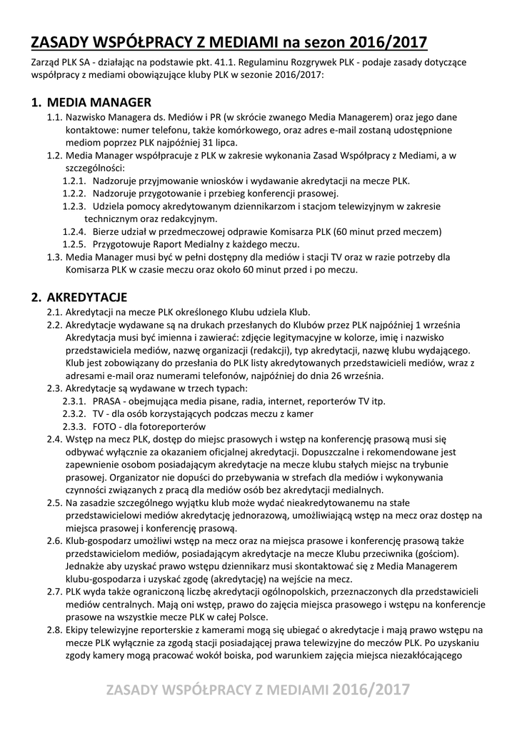 ZASADY WSPÓŁPRACY Z MEDIAMI na sezon 2016/2017 Zarząd PLK SA - działając na podstawie pkt. 41.1. Regulaminu Rozgrywek PLK - podaje zasady dotyczące współpracy z mediami obowiązujące kluby PLK w sezonie 2016/2017: 1. MEDIA MANAGER 1.1. Nazwisko Managera ds. Mediów i PR (w skrócie zwanego Media Managerem) oraz jego dane kontaktowe: numer telefonu, także komórkowego, oraz adres e-mail zostaną udostępnione mediom poprzez PLK najpóźniej 31 lipca. 1.2. Media Manager współpracuje z PLK w zakresie wykonania Zasad Współpracy z Mediami, a w szczególności: 1.2.1. Nadzoruje przyjmowanie wniosków i wydawanie akredytacji na mecze PLK. 1.2.2. Nadzoruje przygotowanie i przebieg konferencji prasowej. 1.2.3. Udziela pomocy akredytowanym dziennikarzom i stacjom telewizyjnym w zakresie technicznym oraz redakcyjnym. 1.2.4. Bierze udział w przedmeczowej odprawie Komisarza PLK (60 minut przed meczem) 1.2.5. Przygotowuje Raport Medialny z każdego meczu. 1.3. Media Manager musi być w pełni dostępny dla mediów i stacji TV oraz w razie potrzeby dla Komisarza PLK w czasie meczu oraz około 60 minut przed i po meczu. 2. AKREDYTACJE 2.1. Akredytacji na mecze PLK określonego Klubu udziela Klub. 2.2. Akredytacje wydawane są na drukach przesłanych do Klubów przez PLK najpóźniej 1 września Akredytacja musi być imienna i zawierać: zdjęcie legitymacyjne w kolorze, imię i nazwisko przedstawiciela mediów, nazwę organizacji (redakcji), typ akredytacji, nazwę klubu wydającego. Klub jest zobowiązany do przesłania do PLK listy akredytowanych przedstawicieli mediów, wraz z adresami e-mail oraz numerami telefonów, najpóźniej do dnia 26 września. 2.3. Akredytacje są wydawane w trzech typach: 2.3.1. PRASA - obejmująca media pisane, radia, internet, reporterów TV itp. 2.3.2. TV - dla osób korzystających podczas meczu z kamer 2.3.3. FOTO - dla fotoreporterów 2.4. Wstęp na mecz PLK, dostęp do miejsc prasowych i wstęp na konferencję prasową musi się odbywać wyłącznie za okazaniem oficjalnej akredytacji. Dopuszczalne i rekomendowane jest zapewnienie osobom posiadającym akredytacje na mecze klubu stałych miejsc na trybunie prasowej. Organizator nie dopuści do przebywania w strefach dla mediów i wykonywania czynności związanych z pracą dla mediów osób bez akredytacji medialnych. 2.5. Na zasadzie szczególnego wyjątku klub może wydać nieakredytowanemu na stałe przedstawicielowi mediów akredytację jednorazową, umożliwiającą wstęp na mecz oraz dostęp na miejsca prasowej i konferencję prasową. 2.6. Klub-gospodarz umożliwi wstęp na mecz oraz na miejsca prasowe i konferencję prasową także przedstawicielom mediów, posiadającym akredytacje na mecze Klubu przeciwnika (gościom). Jednakże aby uzyskać prawo wstępu dziennikarz musi skontaktować się z Media Managerem klubu-gospodarza i uzyskać zgodę (akredytację) na wejście na mecz. 2.7. PLK wyda także ograniczoną liczbę akredytacji ogólnopolskich, przeznaczonych dla przedstawicieli mediów centralnych. Mają oni wstęp, prawo do zajęcia miejsca prasowego i wstępu na konferencje prasowe na wszystkie mecze PLK w całej Polsce. 2.8. Ekipy telewizyjne reporterskie z kamerami mogą się ubiegać o akredytacje i mają prawo wstępu na mecze PLK wyłącznie za zgodą stacji posiadającej prawa telewizyjne do meczów PLK. Po uzyskaniu zgody kamery mogą pracować wokół boiska, pod warunkiem zajęcia miejsca niezakłócającego ZASADY WSPÓŁPRACY Z MEDIAMI 2016/2017 oglądania meczu widzom i innym uczestnikom widowiska (preferowane jest zajęcie miejsca na ławkach dla fotoreporterów). Wszelkie wywiady mogą być przeprowadzane wyłącznie na tle zastawki sponsorskiej. 2.9. Ekipy telewizyjne nieposiadające zgody stacji posiadającej prawa telewizyjne do meczów PLK mogą filmować wyłącznie konferencje prasowe i pomeczowe wywiady w strefie mieszanej. 2.10. Dziennikarzy posiadających akredytacje na mecze PLK obowiązują zasady regulaminu akredytacji PLK, który zostanie przesłany do klubów nie później niż do 15 sierpnia i który musi zostać zaakceptowany podpisem przy odbiorze akredytacji. Akredytacja może być cofnięta przez PLK w przypadku znaczącego naruszenia zapisów regulaminu akredytacji PLK. 2.11. Klub i PLK nie mogą i nie będą odbierać akredytacji przedstawicielom mediów za prowadzoną w dopuszczalny i kulturalny sposób krytykę poczynań klubu, zawodników, trenerów i działaczy ligi. 2.12. PLK udostępni ekipie TV pracującej podczas meczu 30 akredytacji jednorazowych, które zostaną zwrócone po zakończeniu transmisji. 3. FOTOREPORTERZY 3.1. Tylko przedstawiciele mediów posiadający akredytacje FOTO mają prawo wykonywać zdjęcia podczas meczów PLK. Posiadacze akredytacji FOTO nie mogą filmować za pomocą aparatów. W przypadku łączenia zadań fotoreportera i dziennikarza piszącego, należy wydać akredytację FOTO. 3.2. Posiadacze akredytacji FOTO mogą wykonywać zdjęcia z każdego miejsca w hali, także z miejsc dla publiczności, jednakże pod warunkiem, że nie utrudniają obserwacji meczu widzom i innym uczestnikom widowiska. 3.3. Fotoreporterzy powinni zajmować miejsca na ławkach dla fotoreporterów, znajdujących się w czterech miejscach wokół boiska: za liniami końcowymi, z obu stron kosza, bezpośrednio za bandami reklamowymi. Fotoreporterzy powinni zajmować miejsca na ławkach w czasie przerw w grze (przed meczem, między kwartami) i podczas gry pozostają w tej samej strefie, znajdując się w pozycji siedzącej. Niedozwolone jest przemieszczanie się między strefami podczas gry. Absolutnie niedozwolone jest zajmowanie miejsc przez fotoreporterów przed bandami reklamowymi i wzdłuż linii bocznych boiska. 3.4. Dozwolone jest umieszczanie aparatów fotograficznych na konstrukcji kosza i na dachu obiektu sportowego. Musi być jednakże ono wykonane najpóźniej 60 minut przed rozpoczęciem meczu, wyłącznie w obecności Media Manager