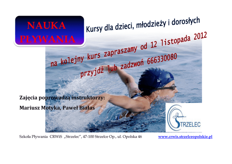 NAUKA PŁYWANIA Zajęcia poprowadzą instruktorzy: Mariusz Motyka, Paweł Białas Szkoła Pływania CRWiS „Strzelec”, 47-100 Strzelce Op., ul. Opolska 46 www.crwis.strzelceopolskie.pl