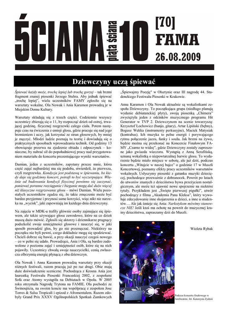 Dziewczyny uczą śpiewać Śpiewać każdy może, trochę lepiej lub trochę gorzej – tak brzmi fragment znanej piosenki Jerzego Stuhra. Aby jednak śpiewać „trochę lepiej”, wielu uczestników FAMY zgłosiło się na warsztaty wokalne. Ola Nowak i Ania Karamon prowadzą je w Miejskim Domu Kultury. Warsztaty składają się z trzech części. Codziennie wszyscy uczestnicy zbierają się o 11, by rozpocząć dzień od ostrej, trwającej godzinę, fizycznej rozgrzewki całego ciała. Potem następuje czas na ćwiczenia z emisji głosu, gdzie pracuje się nad jego brzmieniem i uczy, jak korzystać ze strun głosowych, by mniej je męczyć. Młodzi ludzie poznają tu teorię i dowiadują się o praktycznych sposobach wprowadzania technik. Od godziny 13 obowiązuje przerwa na zjedzenie obiadu i odpoczynek – konieczne, by nabrać sił do popołudniowej pracy nad przygotowaniem materiału do koncertu prezentującego wyniki warsztatów. Damian, jeden z uczestników, zapytany przeze mnie, która część zajęć najbardziej mu się podoba, stwierdził, że pierwsza, czyli rozgrzewka. Kondycja jest podstawą w śpiewaniu, bo kiedy daje się godzinny koncert, potrafi to być wyczerpujące. Właśnie od budowania kondycji fizycznej powinno się zaczynać, ponieważ poranne rozciąganie i bieganie mogą dać dużo więcej niż klasyczne rozgrzewanie głosu – mówi Damian. Wielu pozostałych uczestników zgadza się, że takie zmęczenie może być bardzo przyjemne i przynosi same korzyści, więc nikt nie narzeka na „wycisk”, jaki zapewniają im każdego dnia dziewczyny. Na zajęcia w MDK-u trafiły głównie osoby zajmujące się śpiewem, ale także używające głosu zawodowo, które na co dzień muszą dużo mówić. Zgłosili się aktorzy i dziennikarze pragnący podszkolić swoje umiejętności głosowe i nauczyć się, w jaki sposób prowadzić głos, by go nie przemęczać. Niektórzy na początku nie byli pewni, czego dokładnie mogą się spodziewać. Chcieli dobrze się bawić, a przy okazji nauczyć czegoś nowego – co w pełni się udało. Prowadzące, Ania i Ola, są bardzo zadowolone z poziomu zajęć i umiejętności osób, które się na nich pojawiły. Uczestnicy chwalą swoje nauczycielki, cenią zwłaszcza olbrzymią energię płynącą z obu dziewczyn. Ola Nowak i Anna Karamon prowadzą warsztaty przy okazji różnych festiwali, razem pracują już po raz drugi. Obie mają duże doświadczenie sceniczne. Pochodząca z Krosna Ania jest laureatką Festiwalu Piosenki Francuskiej 2002, z zespołami Sofa oraz Atomy wystąpiła na Debiutach w Opolu. W 2005 roku otrzymała Nagrodę Trytona na FAMIE. Ola pochodzi ze Świnoujścia, na swoim koncie ma współpracę z zespołem Jose Torres & Salsa Tropicali i epizod z Afromentalem. Razem zdobyły Grand Prix XXXV Ogólnopolskich Spotkań Zamkowych „Śpiewajmy Poezję" w Olsztynie oraz III nagrodę 44. Studenckiego Festiwalu Piosenki w Krakowie. Anna Karamon i Ola Nowak aktualnie są wokalistkami zespołu Dziewczyny. To początkująca grupa (niedługo planują wydanie debiutanckiej płyty), swoją piosenką „Chimera” zwyciężyła jeden z odcinków muzycznego programu Hit Generator w TVP 2. Dziewczynom na scenie towarzyszą: Krzysztof Łochowicz (banjo, gitary), Artur Lipiński (bębny), Bogusz Wekka (instrumenty perkusyjne), Maciek Matysiak (kontrabas). Ich muzyka to pełne energii i porywającego rytmu połączenie jazzu, funky i soulu. Jak brzmi na żywo, będzie można się przekonać na Koncercie Finałowym FAMY „Czarno to widzę”, gdzie Dziewczyny zostały zaproszone jako gwiazda wieczoru. Wystąpią z Anną Serafińską, uznaną wokalistką o niepowtarzalnej barwie głosu. To wydarzenie będzie miało miejsce w sobotę, ale już dziś, podczas koncertu „Witajcie w naszej bajce” o godzinie 17 w Muszli Koncertowej, poznamy efekty pracy uczestników warsztatów wokalnych. Usłyszymy piosenki z gatunku muzyki dziecięcej, pochodzące przeważnie z dobranocek. Powrót po latach do utworów znanych z dzieciństwa bywa przeżyciem nostalgicznym, ale może też ujawnić nowe spojrzenie na niektóre tytuły. Przykładem jest „Święto pierwszej pigułki”, utwór pochodzący z filmu „Akademia Pana Kleksa”, który wywołuje zdecydowanie inne skojarzenia u dzieci, a inne u studentów… Ale jak śmieje się Ania: Narkotykom mówimy stanowcze NIE! Jeśli ktoś ma ochotę na powrót do muzycznej krainy dzieciństwa, zapraszamy dziś do Muszli. Wioleta Rybak Podczas koncertu finałowego w Amfiteatrze, fot. Katarzyna Zydroń 2 „Chcieliśmy dobrze…” Przestrzeń Inicjatyw Twórczych Tektura działa w Lublinie więcej niż prężnie – koncerty, pokazy filmów, wystawy, akcje performatywne, własny festiwal, etc, etc, etc. Może ze względu na tę wzmożoną aktywność grupa chętniej korzysta z możliwości wypoczynku, jakie stwarza FAMA niż z okazji do prezentowania swojej pracy z jak najlepszej strony. Zresztą już to zrobili podczas poprzednich edycji, o czym świadczą przyznane im nagrody. Spoczęli na laurach? W tym roku można odnieść takie wrażenie. Zaczęło się niepomyślnie od „Akcji nr 1”: miejsce, w którym miała się odbyć, zmieniano kilkakrotnie, w dostępnych programach pojawiały się rozbieżne informacje. Finalnie na placu za Centralą, gdzie czekali, nie zjawił się nikt. Akcja anulowana z braku zainteresowania. „Akcja nr 2” została zaaranżowana na terenie Oflagu na zasadzie tunelu strachu. Uczestnicy, którym przy wejściu zawiązywano oczy, byli pojedynczo przeprowadzani przez korytarze budynku szkoły. Tam czekały na nich „atrakcje” węchowe, zapachowe, dźwiękowe i dotykowe. Tekturowi oszczędzili tylko nasze zmysły smaku. Doznania, które nam fundowali, w założeniu grupy nie miały nic wspólnego z przyjemnością: przytoczę choćby dyszenie w twarz czy wkładanie do dłoni wędzonej ryby. O ile lubię jej smak, to zapach zdecydowanie zaliczam do odpych
