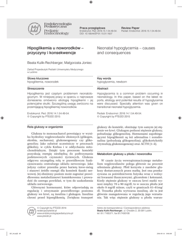 Praca przeglądowa Endokrynol. Ped. 2016.15.1.54.49-54. DOI: 10.18544/EP-01.15.01.1637 Hipoglikemia u noworodków – przyczyny i konsekwencje Review Paper Pediatr. Endocrinol. 2016.15.1.54.49-54. Neonatal hypoglycemia – causes and consequences Beata Kulik-Rechberger, Małgorzata Joniec Zakład Propedeutyki Pediatrii Uniwersytetu Medycznego w Lublinie Słowa kluczowe hipoglikemia, noworodek Key words hypoglycemia, newborn Streszczenie Abstract Hipoglikemia jest częstym problemem neonatologicznym. W niniejszej pracy w oparciu o najnowsze doniesienia omówiono etiologię hipoglikemii i jej potencjalne skutki. Szczególną uwagę zwrócono na przemijającą hipoglikemię noworodków. Hypoglycemia is a common problem occurring in neonatology. In this paper, based on the latest reports, etiology and potential results of hypoglycemia were discussed. Specially attention was given on transitional neonatal hypoglycemia. Endokrynol. Ped. 2016.14.1.54.49-54. © Copyright by PTEiDD 2015 Pediatr. Endocrinol. 2016.14.1.54.49-54. © Copyright by PTEiDD 2015 Rola glukozy w organizmie glukozy do komórki, obniżając tym samym jej stężenie we krwi. Glukagon podnosi stężenie glukozy, pobudzając glikogenolizę. Hormonami zapobiegającymi hipoglikemii są też adrenalina i noradrenalina (pobudzają glikogenolizę), glikokortykoidy (stymulują glukoneogenezę) oraz ACTH [1–4]. Glukoza to monosacharyd powstający w wyniku hydrolizy węglowodanów złożonych (glikogen, skrobia, sacharoza), glukoneogenezy czy glikogenolizy. Jako substrat uczestniczy w procesach glikolizy, w cyklu Krebsa i w oddychaniu mitochondrialnym. Dzięki tym procesom komórki pozyskują energię niezbędną do podtrzymania podstawowych czynności życiowych. Glukoza odgrywa szczególną rolę w prawidłowym funkcjonowaniu centralnego układu nerwowego. Jako jedyny cukier przenika przez barierę krew-mózg i stanowi źródło energii dla komórek tkanki nerwowej. Jej obniżony poziom może zagrażać prawidłowemu metabolizmowi komórkowemu i prowadzić do szeregu powikłań, w tym do uszkodzenia układu nerwowego. Głównymi hormonami, które odpowiadają za regulację i utrzymanie prawidłowego poziomu glukozy we krwi, są insulina i glukagon. Insulina chroni przed hiperglikemią. Zwiększa transport © Copyright by PTEiDD 2016 [email protected] www.endokrynologiapediatryczna.pl www.pteidd.pl EP_54.indd 49 Metabolizm glukozy u płodu i noworodka W czasie życia wewnątrzmacicznego metabolizm węglowodanów polega głównie na procesie utleniania glukozy. Płód korzysta z zasobów glukozy dostarczonych przez matkę. Jest ona przekazywana za pośrednictwem łożyska wraz z wolnymi kwasami tłuszczowymi, glicerolem i ketonami. Kiedy stężenie glukozy w osoczu krwi matki wynosi między 70 a 90 mg/dl, to w osoczu płodu jest około 9 mg/dl niższe, czyli w granicach 61–81mg/ dl. Trzustka płodu wytwarza insulinę, ale ta jest głównie zaangażowana w regulację jego wzrastania. Tak więc stężenie glukozy u płodu warun- Adres do korespondencji / Correspondence address: Beata Kulik-Rechberger, ul. Chodźki 2, 20-091 Lublin, tel. 81/ 7185371, fax 81/7430100 2016-03-14 19:01:00 kowane jest głównie stężeniem glukozy u matki [5]. U noworodków główne procesy utrzymujące prawidłowe stężenie glukozy we krwi to glikoliza i glukoneogeneza. Glikoliza polega na degradacji glukozy do acetylo-CoA (w warunkach tlenowych w procesie oksydatywnej dekarboksylacji, w warunkach beztlenowych w procesie redukcji do mleczanu). Glukoneogeneza – na przekształceniu związków niecukrowych (mleczanów, aminokwasów, glicerolu) w glukozę lub glikogen. Proces ten przebiega głównie w wątrobie i w nerkach. Wykształca się on w okresie postnatalnym i u noworodka odpowiada za produkcję od 30 do 70% glukozy [1,6]. W przypadku niedoboru glukozy dochodzi do uruchomienia alternatywnych dróg jej produkcji – lipolizy i ketogenezy. Po przecięciu pępowiny w wyniku przerwania transportu glukozy od matki dochodzi do gwałtownego obniżenia stężenia glukozy we krwi noworodka. U zdrowych noworodków, urodzonych o czasie, z odpowiednią masą ciała do wieku płodowego (ang. appropriate for gestational age, AGA), najniższe stężenie glukozy w osoczu krwi wynosi 55–65 mg/dl. Stosunkowo niski poziom glukozy utrzymuje się przez pierwsze blisko dwa dni. Maksymalny spadek jej stężenia obserwowany jest między pierwszą a trzecią godziną życia [7]. Po około dwóch godzinach od porodu następuje stopniowy wzrost glikemii i po 48 godzinach stężenie glukozy zwykle osiąga wartości rzędu 70–100 mg/ dl, a więc takie jakie jest u zdrowych dzieci i dorosłych [8]. Zjawisko to nosi nazwę samoistnej przemijającej hipoglikemii noworodków. Pomimo obniżonego stężenia glukozy wydzielanie insuliny nie zostaje zahamowane. Stan ten porównywany jest do wrodzonego hiperinsulinizmu spowodowanego aktywującymi mutacjami genu glukokinazy (GCK). Tu także obserwuje się niezależną od karmienia hipoglikemię, obniżone stężenia ketonów i wolnych kwasów tłuszczowych we krwi oraz pozytywną odpowiedź glikemiczną na glukagon czy epinefrynę [5,7,9]. Niektóre badania sugerują, że przemijająca hipoglikemia u zdrowych AGA noworodków pobudza sekrecję glukagonu i epinefryny przy wartościach glukozy w osoczu rzędu 50–60 mg/dl [5]. Tak więc zmiany metaboliczne i hormonalne towarzyszące samoistnej przemijającej hipoglikemii noworodków świadczą o tym, że jest to hipoglikemia z umiarkowaną hiperinsulinemią. W tej sytuacji hamowanie wydzielania insuliny następuje przy stężeniach glukozy niższych niż 55–66 mg/dl, a nie jak u niemowląt, starszych dzieci i dorosłych przy stężeniach 80–85 mg/dl. Stanley i wsp. sugerują, 50 EP_54.indd 50 Endokrynol. Ped. 2016.15.1.54.49-54 by stan ten nazwać przemijającą hiperinsulinemią noworodków [5]. Wątpliwości może budzić stężenie insuliny, które w większości przypadków ni