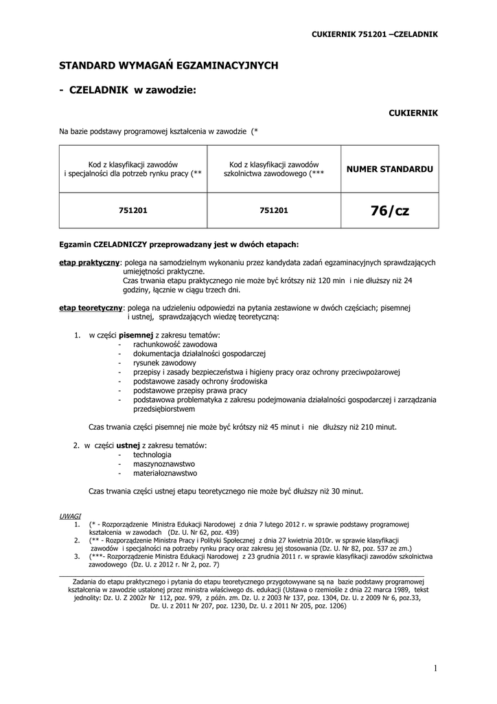 CUKIERNIK 751201 –CZELADNIK STANDARD WYMAGAŃ EGZAMINACYJNYCH - CZELADNIK w zawodzie: CUKIERNIK Na bazie podstawy programowej kształcenia w zawodzie (* Kod z klasyfikacji zawodów i specjalności dla potrzeb rynku pracy (** Kod z klasyfikacji zawodów szkolnictwa zawodowego (*** NUMER STANDARDU 751201 751201 76/cz Egzamin CZELADNICZY przeprowadzany jest w dwóch etapach: etap praktyczny: polega na samodzielnym wykonaniu przez kandydata zadań egzaminacyjnych sprawdzających umiejętności praktyczne. Czas trwania etapu praktycznego nie może być krótszy niż 120 min i nie dłuższy niż 24 godziny, łącznie w ciągu trzech dni. etap teoretyczny: polega na udzieleniu odpowiedzi na pytania zestawione w dwóch częściach; pisemnej i ustnej, sprawdzających wiedzę teoretyczną: 1. w części pisemnej z zakresu tematów: rachunkowość zawodowa dokumentacja działalności gospodarczej rysunek zawodowy przepisy i zasady bezpieczeństwa i higieny pracy oraz ochrony przeciwpożarowej podstawowe zasady ochrony środowiska podstawowe przepisy prawa pracy podstawowa problematyka z zakresu podejmowania działalności gospodarczej i zarządzania przedsiębiorstwem Czas trwania części pisemnej nie może być krótszy niż 45 minut i nie dłuższy niż 210 minut. 2. w części ustnej z zakresu tematów: technologia maszynoznawstwo materiałoznawstwo Czas trwania części ustnej etapu teoretycznego nie może być dłuższy niż 30 minut. UWAGI 1. 2. 3. (* - Rozporządzenie Ministra Edukacji Narodowej z dnia 7 lutego 2012 r. w sprawie podstawy programowej kształcenia w zawodach (Dz. U. Nr 62, poz. 439) (** - Rozporządzenie Ministra Pracy i Polityki Społecznej z dnia 27 kwietnia 2010r. w sprawie klasyfikacji zawodów i specjalności na potrzeby rynku pracy oraz zakresu jej stosowania (Dz. U. Nr 82, poz. 537 ze zm.) (***- Rozporządzenie Ministra Edukacji Narodowej z 23 grudnia 2011 r. w sprawie klasyfikacji zawodów szkolnictwa zawodowego (Dz. U. z 2012 r. Nr 2, poz. 7) _________________________________________________________________________________________ Zadania do etapu praktycznego i pytania do etapu teoretycznego przygotowywane są na bazie podstawy programowej kształcenia w zawodzie ustalonej przez ministra właściwego ds. edukacji (Ustawa o rzemiośle z dnia 22 marca 1989, tekst jednolity: Dz. U. Z 2002r Nr 112, poz. 979, z późn. zm. Dz. U. z 2003 Nr 137, poz. 1304, Dz. U. z 2009 Nr 6, poz.33, Dz. U. z 2011 Nr 207, poz. 1230, Dz. U. z 2011 Nr 205, poz. 1206) 1 CUKIERNIK 751201 –CZELADNIK W efekcie pozytywnie zdanego egzaminu CZELADNICZEGO izba rzemieślnicza wystawia ŚWIADECTWO CZELADNICZE, które jest formalnym potwierdzeniem kwalifikacji zawodowych, uzyskanych w różnych ścieżkach edukacji oraz w procesie pracy. 1. PROFIL UMIEJĘTNOŚCI CZELADNIKA ZWIĄZANY Z ZAWODEM Czeladnik (posiadacz świadectwa czeladniczego) w zawodzie cukiernik potrafi: − dobierać, oceniać i przygotowywać surowce, półprodukty i dodatki do produkcji wyrobów cukierniczych, − rozróżniać grupy produktów cukierniczych oraz oceniać ich wartość kaloryczną, − prowadzić procesy technologiczne zgodnie z normami, systemami zapewnienia jakości i bezpieczeństwa zdrowotnego żywności, − sporządzać półprodukty, wyroby cukiernicze i oceniać ich jakość, − dekorować wyroby cukiernicze i ciastkarskie, − użytkować maszyny i urządzenia stosowane w produkcji cukierniczej, − czyścić, myć i dezynfekować maszyny, urządzenia i drobny sprzęt cukierniczy, − przechowywać surowce, półprodukty i wyroby cukiernicze, − prowadzić dokumentację produkcji, − rozliczać zużycie surowców, − kalkulować ceny gotowych wyrobów cukierniczych i ciastkarskich, − przestrzegać przepisów bezpieczeństwa i higieny pracy, ochrony przeciwpożarowej oraz ochrony środowiska podczas wykonywania zadań zawodowych, − udzielać pierwszej pomocy poszkodowanym w wypadkach przy pracy. Czeladnik w zawodzie cukiernik jest przygotowany do wykonywania następujących zadań zawodowych: 1) wytwarzania wyrobów cukierniczych; 2) dekorowania wyrobów cukierniczych i przygotowanie ich do dystrybucji; 3) magazynowania wyrobów cukierniczych. 2.WIEDZA I UMIEJĘTNOŚCI ZWIĄZANE Z WYKONYWANIEM WYŻEJ WYMIENIONYCH ZADAŃ ZAWODOWYCH Z ZAKRESU: 2.1. Bezpieczeństwo i higiena pracy Czeladnik: 1) rozróżnia pojęcia związane z bezpieczeństwem i higieną pracy, ochroną przeciwpożarową, ochroną środowiska i ergonomią; 2) rozróżnia zadania i uprawnienia instytucji oraz służb działających w zakresie ochrony pracy i ochrony środowiska w Polsce; 3) określa prawa i obowiązki pracownika oraz pracodawcy w zakresie bezpieczeństwa i higieny pracy; 4) przewiduje zagrożenia dla zdrowia i życia człowieka oraz mienia i środowiska związane z wykonywaniem zadań zawodowych; 5) określa zagrożenia związane z występowaniem szkodliwych czynników w środowisku pracy; 6) określa skutki oddziaływania czynników szkodliwych na organizm człowieka; 7) organizuje stanowisko pracy zgodnie z obowiązującymi wymaganiami ergonomii, przepisami bezpieczeństwa i higieny pracy, ochrony przeciwpożarowej i ochrony środowiska; 8) stosuje środki ochrony indywidualnej i zbiorowej podczas wykonywania zadań zawodowych; 9) przestrzega zasad bezpieczeństwa i higieny pracy oraz stosuje przepisy prawa dotyczące ochrony przeciwpożarowej i ochrony środowiska; 10) udziela pierwszej pomocy poszkodowanym w wypadkach przy pracy oraz w stanach zagrożenia zdrowia i życia. 2.2.Podejmowanie i prowadzenie działalności gospodarczej Czeladnik: 1) stosuje pojęcia z obszaru funkcjonowania gospodarki rynkowej; 2) stosuje przepisy prawa pracy, przepisy prawa dotyczące ochrony danych osobowych oraz przepisy prawa podatkowego i prawa autorskiego; 3) stosuje przepisy prawa dotyczące prowadzenia działalności gospodarczej; 4) rozróżnia przedsiębiorstwa i instytucje występujące w branży i powiązania między nimi; 
