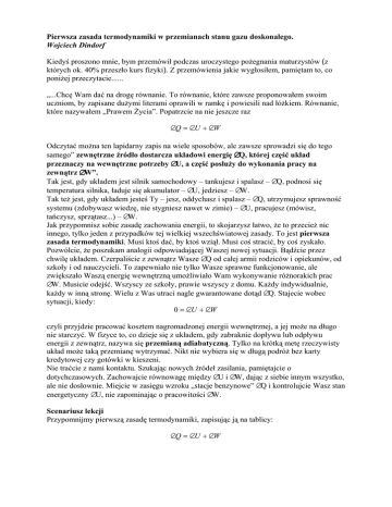 Pierwsza zasada termodynamiki w przemianach stanu gazu doskonałego. Wojciech Dindorf Kiedyś proszono mnie, bym przemówił podczas uroczystego poż egnania maturzystów (z których ok. 40% przeszło kurs fizyki). Z przemówienia jakie wygłosiłem, pamię tam to, co poniż ej przeczytacie...... „...Chcę Wam dać na drogę równanie. To równanie, które zawsze proponowałem swoim uczniom, by zapisane duż ymi literami oprawili w ramkę i powiesili nad łóż kiem. Równanie, które nazywałem „Prawem Ż ycia”. Popatrzcie na nie jeszcze raz ∆Q = ∆U + ∆W Odczytać moż na ten lapidarny zapis na wiele sposobów, ale zawsze sprowadzi się do tego samego” zewnętrzne ź ródło dostarcza układowi energię ∆Q, której częś ć układ przeznaczy na wewnętrzne potrzeby ∆U, a częś ć posłuż y do wykonania pracy na zewną trz ∆W”. Tak jest, gdy układem jest silnik samochodowy – tankujesz i spalasz – ∆Q, podnosi się temperatura silnika, ładuje się akumulator – ∆U, jedziesz – ∆W. Tak też jest, gdy układem jesteś Ty – jesz, oddychasz i spalasz – ∆Q, utrzymujesz sprawność systemu (zdobywasz wiedzę , nie stygniesz nawet w zimie) – ∆U, pracujesz (mówisz, tań czysz, sprzą tasz...) – ∆W. Jak przypomnisz sobie zasadę zachowania energii, to skojarzysz łatwo, ż e to przecież nic innego, tylko jeden z przypadków tej wielkiej wszechświatowej zasady. To jest pierwsza zasada termodynamiki. Musi ktoś dać , by ktoś wzią ł. Musi coś stracić , by coś zyskało. Pozwólcie, ż e poszukam analogii odpowiadają cej Waszej nowej sytuacji. Bą dź cie przez chwilę układem. Czerpaliście z zewną trz Wasze ∆Q od całej armii rodziców i opiekunów, od szkoły i od nauczycieli. To zapewniało nie tylko Wasze sprawne funkcjonowanie, ale zwię kszało Waszą energię wewnę trzną umoż liwiało Wam wykonywanie róż norakich prac ∆W. Musicie odejść . Wszyscy ze szkoły, prawie wszyscy z domu. Każ dy indywidualnie, każ dy w inną stronę . Wielu z Was utraci nagle gwarantowane dotą d ∆Q. Stajecie wobec sytuacji, kiedy: 0 = ∆U + ∆W czyli przyjdzie pracować kosztem nagromadzonej energii wewnę trznej, a jej moż e na długo nie starczyć . W fizyce to, co dzieje się z układem, gdy zabraknie dopływu lub odpływu energii z zewną trz, nazywa się przemianą adiabatyczną . Tylko na krótką metę rzeczywisty układ moż e taką przemianę wytrzymać . Nikt nie wybiera się w długą podróż bez karty kredytowej czy gotówki w kieszeni. Nie trać cie z nami kontaktu. Szukają c nowych ź ródeł zasilania, pamię tajcie o dotychczasowych. Zachowajcie równowagę mię dzy ∆U i ∆W, dają c z siebie innym wszystko, ale nie dosłownie. Miejcie w zasię gu wzroku „stacje benzynowe” ∆Q i kontrolujcie Wasz stan energetyczny ∆U, nie zapominają c o pracowitości ∆W. Scenariusz lekcji Przypomnijmy pierwszą zasadę termodynamiki, zapisują c ją na tablicy: ∆Q = ∆U + ∆W Odwołują c się do wcześniej zdobytej wiedzy, przypominamy, ż e gaz doskonały jest posłuszny prawu pV = nkT. Pierwsza zasada termodynamiki jest doskonałym narzę dziem do rozwią zywania problemów. Przeanalizujmy przemiany gazu doskonałego. Przemiana izotermiczna. Idealna, niemal nieosią galna sytuacja. ∆U = 0. Tego chcemy. Temperatura odpowiedzialna za energię wewnę trzną gazu nie zmienia się . Mamy to, co chciał genialny Joule. Praca wykonana nad gazem ma ogrzewać wyłą cznie otoczenie. Mamy prawo Boyle’a: pV = const. Ciepło dostarczone gazowi nie ma prawa tego gazu ogrzać , a ma być w całości wykorzystane na wykonanie pracy – popchnię cie tłoka, zwię kszenie obję tości ∆V. Trzeba dodać , ż e – niestety – ciśnienie też się zmienia, wię c obliczyć ilość pracy moż na w zasadzie tylko z wykresu. Tu dygresja: tak jak w wielu innych miejscach nauczyciel zwraca uwagę , ż e przy zmienności wszystkiego na raz i wszę dzie wyodrę bnienie wyizolowanych procesów moż e mieć tylko charakter przybliż ony, moż e służ yć jako eksperyment myślowy, moż e pomóc w wyprowadzaniu wzorów. Modelowanie procesów w przyrodzie jest zawsze idealizowaniem. Tu podobnie jak w ruchu bez tarcia, jak z doświadczeniami na poziomej płaszczyź nie, jak przy pompowaniu opony rowerowej, jak w ruchu ze stałym przyspieszeniem zawsze w wię kszym lub mniejszym stopniu idealizujemy. Warto na tym poziomie o tych sprawach mówić nie po to, by podważ yć zaufanie do nauki, ale po to, by sobie uświadomić , do jakich działań Przyroda nas zmusza i jak sobie z tym radzimy. Przemiana adiabatyczna Odizolować układ od zewnę trznego świata, inaczej ∆Q = 0, to wynalezienie bariery dla trzech „intruzów”: konwekcji, przewodnictwa i promieniowania. W ż adną stronę , ż adnym ze sposobów ciepło nie moż e ani dopływać , ani odpływać z naszego układu. Wyobraż amy sobie taki idealny zamknię ty układ, gdzie mamy albo pracę kosztem własnej energii układu, albo wzrost energii, bo ktoś z zewną trz ściska układ. Pierwsze, co przychodzi na myśl, to to, ż e gdyby dodać , ż e wszystko odbywa się w bardzo krótkim czasie, to jeszcze moż na by to sobie wyobrazić . I słusznie. Nawet klaśnię cie dłoń mi moż na by uznać za proces adiabatyczny. Sprę ż enie gazu nastą piło tak szybko, ż e zanim cokolwiek z energii wewnę trznej zdołało uciec, proces moż na było uznać za adiabatyczny. Tu podobnie jak poprzednio moż na sporzą dzić wykres w układzie współrzę dnych p-V. Zwracamy uwagę , ż e krzywa przebiegać bę dzie bardziej stromo niż poprzednio. Tu ciśnienie wzrasta nie tylko z powodu zmniejszania obję tości, ale i z powodu zmiany energii mechanicznej (pracy) na energię wewnę trzną (wzrost temperatury). Gdy gaz rozprę ż amy, to „gasimy” ruch czą steczek, podobnie jak tenisista „gasi” piłkę , cofają c rakietę w czasie zderzenia. Na obu wykresach w takiej samej ska
