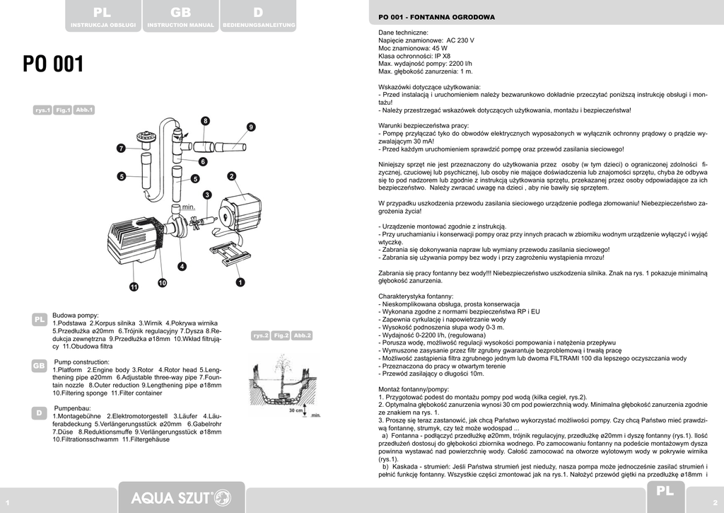 PL GB INSTRUKCJA OBSŁUGI INSTRUCTION MANUAL D BEDIENUNGSANLEITUNG Dane techniczne: Napięcie znamionowe: AC 230 V Moc znamionowa: 45 W Klasa ochronności: IP X8 Max. wydajność pompy: 2200 l/h Max. głębokość zanurzenia: 1 m. PO 001 rys.1 Fig.1 PO 001 - FONTANNA OGRODOWA Wskazówki dotyczące użytkowania: - Przed instalacją i uruchomieniem należy bezwarunkowo dokładnie przeczytać poniższą instrukcję obsługi i montażu! - Należy przestrzegać wskazówek dotyczących użytkowania, montażu i bezpieczeństwa! Abb.1 Warunki bezpieczeństwa pracy: - Pompę przyłączać tyko do obwodów elektrycznych wyposażonych w wyłącznik ochronny prądowy o prądzie wyzwalającym 30 mA! - Przed każdym uruchomieniem sprawdzić pompę oraz przewód zasilania sieciowego! Niniejszy sprzęt nie jest przeznaczony do użytkowania przez osoby (w tym dzieci) o ograniczonej zdolności fizycznej, czuciowej lub psychicznej, lub osoby nie mające doświadczenia lub znajomości sprzętu, chyba że odbywa się to pod nadzorem lub zgodnie z instrukcją użytkowania sprzętu, przekazanej przez osoby odpowiadające za ich bezpieczeństwo. Należy zwracać uwagę na dzieci , aby nie bawiły się sprzętem. W przypadku uszkodzenia przewodu zasilania sieciowego urządzenie podlega złomowaniu! Niebezpieczeństwo zagrożenia życia! - Urządzenie montować zgodnie z instrukcją. - Przy uruchamianiu i konserwacji pompy oraz przy innych pracach w zbiorniku wodnym urządzenie wyłączyć i wyjąć wtyczkę. - Zabrania się dokonywania napraw lub wymiany przewodu zasilania sieciowego! - Zabrania się używania pompy bez wody i przy zagrożeniu wystąpienia mrozu! Zabrania się pracy fontanny bez wody!!! Niebezpieczeństwo uszkodzenia silnika. Znak na rys. 1 pokazuje minimalną głębokość zanurzenia. PL GB D 1 Budowa pompy: 1.Podstawa 2.Korpus silnika 3.Wirnik 4.Pokrywa wirnika 5.Przedłużka ø20mm 6.Trójnik regulacyjny 7.Dysza 8.Redukcja zewnętrzna 9.Przedłużka ø18mm 10.Wkład filtrujący 11.Obudowa filtra Pump construction: 1.Platform 2.Engine body 3.Rotor 4.Rotor head 5.Lengthening pipe ø20mm 6.Adjustable three-way pipe 7.Fountain nozzle 8.Outer reduction 9.Lengthening pipe ø18mm 10.Filtering sponge 11.Filter container Pumpenbau: 1.Montagebühne 2.Elektromotorgestell 3.Läufer 4.Läuferabdeckung 5.Verlängerungsstück ø20mm 6.Gabelrohr 7.Düse 8.Reduktionsmuffe 9.Verlängerungsstück ø18mm 10.Filtrationsschwamm 11.Filtergehäuse rys.2 Fig.2 Abb.2 Charakterystyka fontanny: - Nieskomplikowana obsługa, prosta konserwacja - Wykonana zgodne z normami bezpieczeństwa RP i EU - Zapewnia cyrkulację i napowietrzanie wody - Wysokość podnoszenia słupa wody 0-3 m. - Wydajność 0-2200 l/h, (regulowana) - Porusza wodę, możliwość regulacji wysokości pompowania i natężenia przepływu - Wymuszone zasysanie przez filtr zgrubny gwarantuje bezproblemową i trwałą pracę - Możliwość zastąpienia filtra zgrubnego jednym lub dwoma FILTRAMI 100 dla lepszego oczyszczania wody - Przeznaczona do pracy w otwartym terenie - Przewód zasilający o długości 10m. Montaż fontanny/pompy: 1. Przygotować podest do montażu pompy pod wodą (kilka cegieł, rys.2). 2. Optymalna głębokość zanurzenia wynosi 30 cm pod powierzchnią wody. Minimalna głębokość zanurzenia zgodnie ze znakiem na rys. 1. 3. Proszę się teraz zastanowić, jak chcą Państwo wykorzystać możliwości pompy. Czy chcą Państwo mieć prawdziwą fontannę, strumyk, czy też może wodospad ... a) Fontanna - podłączyć przedłużkę ø20mm, trójnik regulacyjny, przedłużkę ø20mm i dyszę fontanny (rys.1). Ilość przedłużeń dostosuj do głębokości zbiornika wodnego. Po zamocowaniu fontanny na podeście montażowym dysza powinna wystawać nad powierzchnię wody. Całość zamocować na otworze wylotowym wody w pokrywie wirnika (rys.1). b) Kaskada - strumień: Jeśli Państwa strumień jest nieduży, nasza pompa może jednocześnie zasilać strumień i pełnić funkcję fontanny. Wszystkie części zmontować jak na rys.1. Nałożyć przewód giętki na przedłużkę ø18mm i PL 22 poprowadziă do wypływu strumienia. 4. Pompę osadzić na przygotowanym podeście montażowym. 5. Pompę przyłączać tylko do obwodów elektrycznych wyposażonych w wyłącznik ochronny prądowy o prądzie wyłączającym 30 mA! 6. Włączyć pompę. 7. Za pomocą trójnika wyregulować przepływ wody i dostosować go do własnych potrzeb. Przegląd kontrolny i konserwacja: Dla zachowania wysokiej sprawności fontanny zaleca się przeprowadzanie regularnego czyszczenia wkładu filtrującego, wirnika i jego komory. Czyszczenie wkładu filtrującego: 1. Wyłącz pompę przez wyjęcie wtyczki sieciowej! 2. Wyjmij pompę. 3. Zdejmij obudowę filtra z korpusu pompy. 4. Wyjmij wkład filtrujący z obudowy filtra i umyj ją w letniej wodzie. 5. Zmontuj pompę w odwrotnej kolejności. W przypadku zakłóceń w pracy silnika (ciężko pracujący silnik) należy oczyścić wirnik i jego komorę. Czyszczenie wirnika i jego komory: 1. Wyłącz pompę przez wyjęcie wtyczki sieciowej! 2. Wyjmij pompę 3. Zdejmij obudowę filtra z korpusu pompy. 4. Przez obrót wysuń pokrywę wirnika z mocowania na korpusie. 5. Wyjmij wirnik z komory i starannie wypłucz pod bieżącą wodą, usuń osad 6. Zmontuj pompę w odwrotnej kolejności. Przedłużki, złączki redukcyjne, regulator i dysze należy od czasu do czasu przeczyścić. Demontaż i kasacja: „Producent odpadów” - tj. użytkownik pompy, w chwili likwidacji wyrobu czy też wymiany zużytych części, powinien podjąć następujące działania: - części nadające się do dalszego wykorzystania poddać regeneracji bądź przechować, - odpady metaliczne przekazać do punktu skupu złomu, - elementy z tworzyw sztucznych, gumy itp. przekazać do punktów prowadzących recykling, lub postępować zgodnie z miejscowymi przepisami o postępowaniu z odpadami metalicznymi, nieorganicznymi, organicznymi i mieszanymi