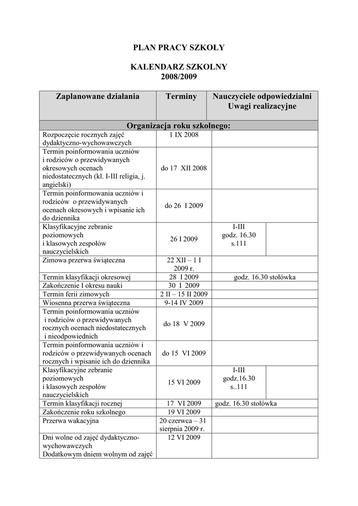 PLAN PRACY SZKOŁY KALENDARZ SZKOLNY 2008/2009