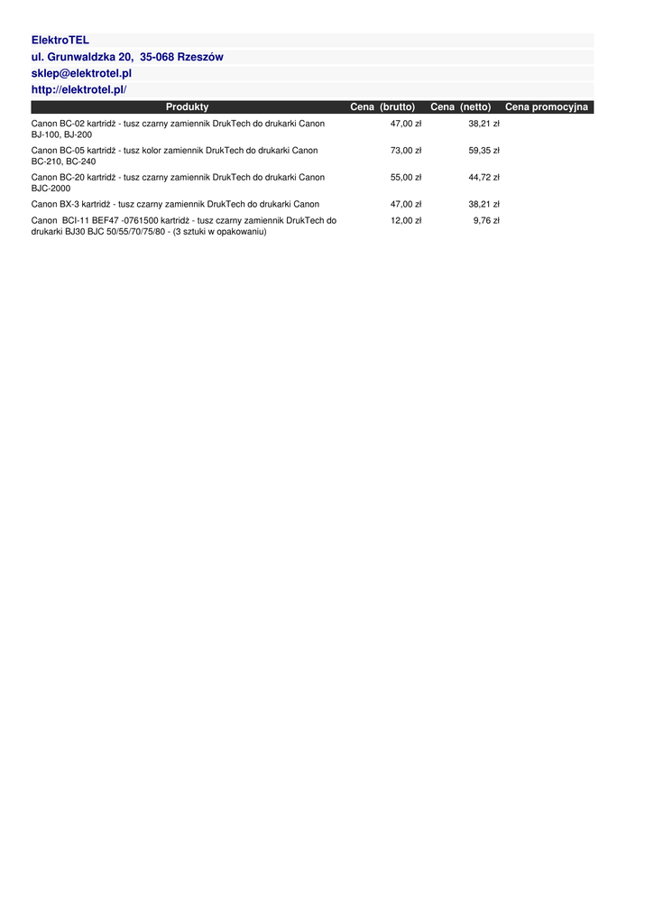 ElektroTEL ul. Grunwaldzka 20, 35-068 Rzeszów [email protected] http://elektrotel.pl/ Produkty Cena (brutto) Cena (netto) Canon BC-02 kartridż - tusz czarny zamiennik DrukTech do drukarki Canon BJ-100, BJ-200 47,00 zł 38,21 zł Canon BC-05 kartridż - tusz kolor zamiennik DrukTech do drukarki Canon BC-210, BC-240 73,00 zł 59,35 zł Canon BC-20 kartridż - tusz czarny zamiennik DrukTech do drukarki Canon BJC-2000 55,00 zł 44,72 zł Canon BX-3 kartridż - tusz czarny zamiennik DrukTech do drukarki Canon 47,00 zł 38,21 zł Canon BCI-11 BEF47 -0761500 kartridż - tusz czarny zamiennik DrukTech do drukarki BJ30 BJC 50/55/70/75/80 - (3 sztuki w opakowaniu) 12,00 zł 9,76 zł Cena promocyjna