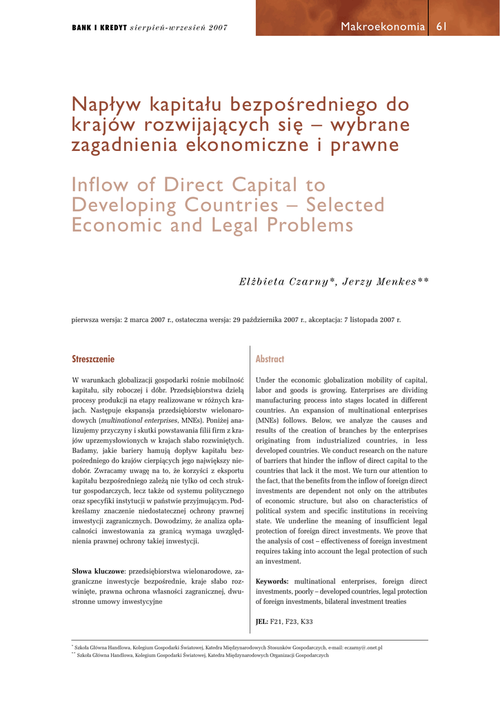 Makroekonomia 61 B a n k i K r e dy t s i e r p i e ń - w rz e s i e ń 2 007 Napływ kapitału bezpoÊredniego do krajów rozwijajàcych si´ – wybrane zagadnienia ekonomiczne i prawne Inflow of Direct Capital to Developing Countries – Selected Economic and Legal Problems Elżbieta Czarny*, Jerzy Menkes** pierwsza wersja: 2 marca 2007 r., ostateczna wersja: 29 października 2007 r., akceptacja: 7 listopada 2007 r. Streszczenie Abstract W warunkach globalizacji gospodarki rośnie mobilność kapitału, siły roboczej i dóbr. Przedsiębiorstwa dzielą procesy produkcji na etapy realizowane w różnych krajach. Następuje ekspansja przedsiębiorstw wielonarodowych (multinational enterprises, MNEs). Poniżej analizujemy przyczyny i skutki powstawania filii firm z krajów uprzemysłowionych w krajach słabo rozwiniętych. Badamy, jakie bariery hamują dopływ kapitału bezpośredniego do krajów cierpiących jego największy niedobór. Zwracamy uwagę na to, że korzyści z eksportu kapitału bezpośredniego zależą nie tylko od cech struktur gospodarczych, lecz także od systemu politycznego oraz specyfiki instytucji w państwie przyjmującym. Podkreślamy znaczenie niedostatecznej ochrony prawnej inwestycji zagranicznych. Dowodzimy, że analiza opłacalności inwestowania za granicą wymaga uwzględnienia prawnej ochrony takiej inwestycji. Under the economic globalization mobility of capital, labor and goods is growing. Enterprises are dividing manufacturing process into stages located in different countries. An expansion of multinational enterprises (MNEs) follows. Below, we analyze the causes and results of the creation of branches by the enterprises originating from industrialized countries, in less developed countries. We conduct research on the nature of barriers that hinder the inflow of direct capital to the countries that lack it the most. We turn our attention to the fact, that the benefits from the inflow of foreign direct investments are dependent not only on the attributes of economic structure, but also on characteristics of political system and specific institutions in receiving state. We underline the meaning of insufficient legal protection of foreign direct investments. We prove that the analysis of cost – effectiveness of foreign investment requires taking into account the legal protection of such an investment. Słowa kluczowe: przedsiębiorstwa wielonarodowe, zagraniczne inwestycje bezpośrednie, kraje słabo rozwinięte, prawna ochrona własności zagranicznej, dwustronne umowy inwestycyjne Keywords: multinational enterprises, foreign direct investments, poorly – developed countries, legal protection of foreign investments, bilateral investment treaties JEL: F21, F23, K33 * Szkoła ** Główna Handlowa, Kolegium Gospodarki Światowej, Katedra Międzynarodowych Stosunków Gospodarczych, e-mail: [email protected] Szkoła Główna Handlowa, Kolegium Gospodarki Światowej, Katedra Międzynarodowych Organizacji Gospodarczych 62 Macroeconomics 1. Wstęp Obecny poziom umiędzynarodowienia procesów gospodarczych pozwala mówić o globalizacji gospodarki. Rośnie mobilność kapitału, siły roboczej i dóbr, a w pewnej mierze także usług. Dokonuje się rewolucja technologiczna, której przejawami są rozprzestrzenianie się innowacji i spadek przeciętnych kosztów produkcji. Przedsiębiorstwa dzielą procesy produkcji na etapy realizowane w różnych krajach. Spadają koszty transakcyjne związane z prowadzeniem międzynarodowej działalności gospodarczej, w tym zwłaszcza koszt transportu i komunikacji. W konsekwencji czas i przestrzeń coraz słabiej ograniczają działalność gospodarczą. Dzięki technice teleinformacyjnej zanikają granice między krajami. W dodatku pojedyncze kraje i ich grupy, zrzeszone m.in. w organizacjach międzynarodowych (np. WTO), liberalizują niektóre sfery działalności gospodarczej. W wielu krajach, zwłaszcza uprzemysłowionych, następuje urynkowienie i odchodzenie państwa od działalności gospodarczej. Przejawem umiędzynarodowienia gospodarki jest ekspansja przedsiębiorstw wielonarodowych (multinational enterprises, MNEs), definiowanych przez ekonomistów jako firmy zaangażowane w bezpośrednie inwestycje zagraniczne (foreign direct investment, FDI), będące właścicielami lub kontrolujące działalność gospodarczą w więcej niż jednym kraju. Bank i Kredyt sierpień-wrzesień 2007 Definicje prawne inwestycji są sformułowane w BITs (Bilateral Investment Treaties). Chociaż każda umowa różni się od pozostałych, to zauważalna jest ich wzajemna niesprzeczność. Poniżej koncentrujemy uwagę na inwestycjach zagranicznych, polegających na zakładaniu zagranicznych filii przedsiębiorstw wielonarodowych i prowadzeniu przez nie działalności. W szczególności analizujemy przyczyny i skutki powstawania filii firm z krajów uprzemysłowionych w krajach słabo rozwiniętych. Badamy, jakie bariery hamują dopływ kapitału bezpośredniego do krajów cierpiących jego największy niedobór. Zwracamy uwagę na to, że korzyści z eksportu kapitału bezpośredniego zależą nie tylko od cech struktur gospodarczych, lecz także od systemu politycznego oraz specyfiki instytucji w państwie przyjmującym. Podkreślamy przy tym znaczenie niedostatecznej ochrony prawnej inwestycji zagranicznych. Dowodzimy, że analiza opłacalności inwestowania za granicą wymaga uwzględnienia prawnej ochrony takiej inwestycji. Koncentrujemy uwagę na najważniejszych – naszym zdaniem – problemach prawnych i ekonomicznych. Mamy jednak świadomość, że analiza działalności firm wielonarodowych obejmuje problematykę bardziej interdyscyplinarną (m.in. dotyczy aspektów socjologicznych i politologicznych). Nazwa przedsiębiorstwo wielonarodowe (firma wielonarodowa) jest względnie wiernym tłumaczeniem na język polski angielskiej nazwy multinational enterprise. Jednak w literaturze przedmiotu używa się też w podobnym znacze