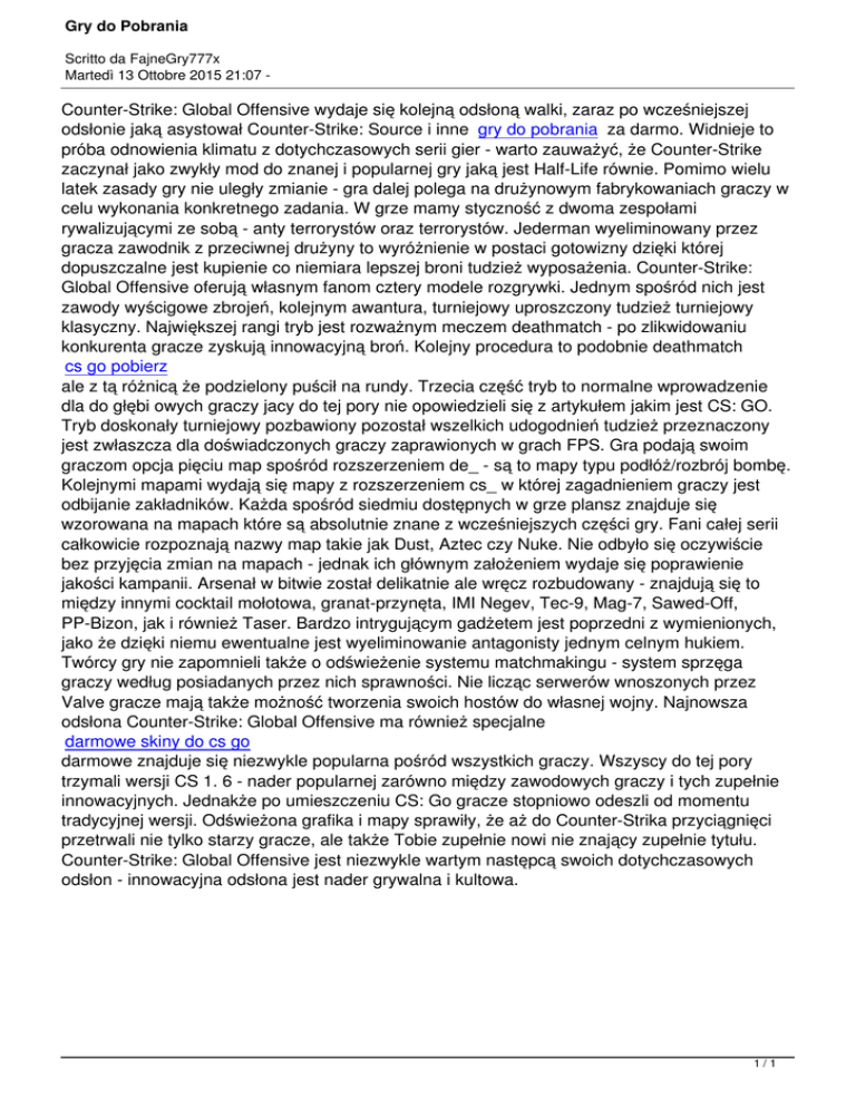 Gry do Pobrania Scritto da FajneGry777x Martedì 13 Ottobre 2015 21:07 - Counter-Strike: Global Offensive wydaje się kolejną odsłoną walki, zaraz po wcześniejszej odsłonie jaką asystował Counter-Strike: Source i inne gry do pobrania za darmo. Widnieje to próba odnowienia klimatu z dotychczasowych serii gier - warto zauważyć, że Counter-Strike zaczynał jako zwykły mod do znanej i popularnej gry jaką jest Half-Life równie. Pomimo wielu latek zasady gry nie uległy zmianie - gra dalej polega na drużynowym fabrykowaniach graczy w celu wykonania konkretnego zadania. W grze mamy styczność z dwoma zespołami rywalizującymi ze sobą - anty terrorystów oraz terrorystów. Jederman wyeliminowany przez gracza zawodnik z przeciwnej drużyny to wyróżnienie w postaci gotowizny dzięki której dopuszczalne jest kupienie co niemiara lepszej broni tudzież wyposażenia. Counter-Strike: Global Offensive oferują własnym fanom cztery modele rozgrywki. Jednym spośród nich jest zawody wyścigowe zbrojeń, kolejnym awantura, turniejowy uproszczony tudzież turniejowy klasyczny. Największej rangi tryb jest rozważnym meczem deathmatch - po zlikwidowaniu konkurenta gracze zyskują innowacyjną broń. Kolejny procedura to podobnie deathmatch cs go pobierz ale z tą różnicą że podzielony puścił na rundy. Trzecia część tryb to normalne wprowadzenie dla do głębi owych graczy jacy do tej pory nie opowiedzieli się z artykułem jakim jest CS: GO. Tryb doskonały turniejowy pozbawiony pozostał wszelkich udogodnień tudzież przeznaczony jest zwłaszcza dla doświadczonych graczy zaprawionych w grach FPS. Gra podają swoim graczom opcja pięciu map spośród rozszerzeniem de_ - są to mapy typu podłóż/rozbrój bombę. Kolejnymi mapami wydają się mapy z rozszerzeniem cs_ w której zagadnieniem graczy jest odbijanie zakładników. Każda spośród siedmiu dostępnych w grze plansz znajduje się wzorowana na mapach które są absolutnie znane z wcześniejszych części gry. Fani całej serii całkowicie rozpoznają nazwy map takie jak Dust, Aztec czy Nuke. Nie odbyło się oczywiście bez przyjęcia zmian na mapach - jednak ich głównym założeniem wydaje się poprawienie jakości kampanii. Arsenał w bitwie został delikatnie ale wręcz rozbudowany - znajdują się to między innymi cocktail mołotowa, granat-przynęta, IMI Negev, Tec-9, Mag-7, Sawed-Off, PP-Bizon, jak i również Taser. Bardzo intrygującym gadżetem jest poprzedni z wymienionych, jako że dzięki niemu ewentualne jest wyeliminowanie antagonisty jednym celnym hukiem. Twórcy gry nie zapomnieli także o odświeżenie systemu matchmakingu - system sprzęga graczy według posiadanych przez nich sprawności. Nie licząc serwerów wnoszonych przez Valve gracze mają także możność tworzenia swoich hostów do własnej wojny. Najnowsza odsłona Counter-Strike: Global Offensive ma również specjalne darmowe skiny do cs go darmowe znajduje się niezwykle popularna pośród wszystkich graczy. Wszyscy do tej pory trzymali wersji CS 1. 6 - nader popularnej zarówno między zawodowych graczy i tych zupełnie innowacyjnych. Jednakże po umieszczeniu CS: Go gracze stopniowo odeszli od momentu tradycyjnej wersji. Odświeżona grafika i mapy sprawiły, że aż do Counter-Strika przyciągnięci przetrwali nie tylko starzy gracze, ale także Tobie zupełnie nowi nie znający zupełnie tytułu. Counter-Strike: Global Offensive jest niezwykle wartym następcą swoich dotychczasowych odsłon - innowacyjna odsłona jest nader grywalna i kultowa. 1/1