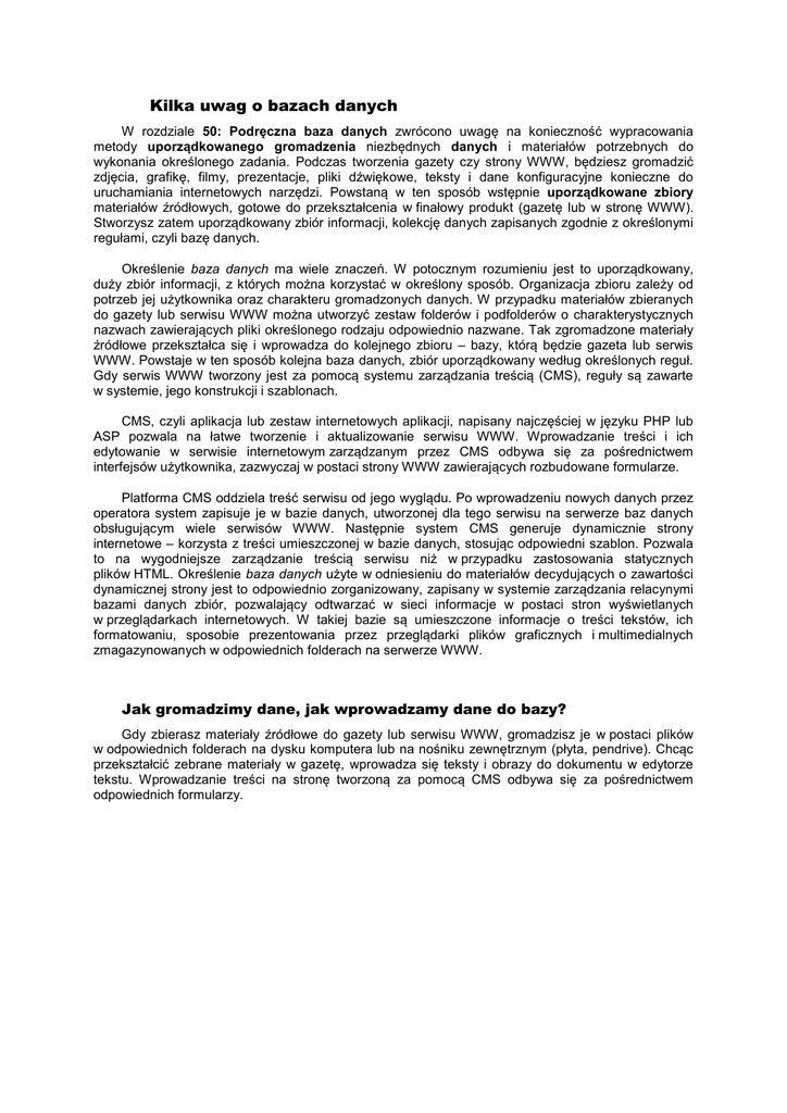 Kilka uwag o bazach danych W rozdziale 50: Podręczna baza danych zwrócono uwagę na konieczność wypracowania metody uporządkowanego gromadzenia niezbędnych danych i materiałów potrzebnych do wykonania określonego zadania. Podczas tworzenia gazety czy strony WWW, będziesz gromadzić zdjęcia, grafikę, filmy, prezentacje, pliki dźwiękowe, teksty i dane konfiguracyjne konieczne do uruchamiania internetowych narzędzi. Powstaną w ten sposób wstępnie uporządkowane zbiory materiałów źródłowych, gotowe do przekształcenia w finałowy produkt (gazetę lub w stronę WWW). Stworzysz zatem uporządkowany zbiór informacji, kolekcję danych zapisanych zgodnie z określonymi regułami, czyli bazę danych. Określenie baza danych ma wiele znaczeń. W potocznym rozumieniu jest to uporządkowany, duży zbiór informacji, z których można korzystać w określony sposób. Organizacja zbioru zależy od potrzeb jej użytkownika oraz charakteru gromadzonych danych. W przypadku materiałów zbieranych do gazety lub serwisu WWW można utworzyć zestaw folderów i podfolderów o charakterystycznych nazwach zawierających pliki określonego rodzaju odpowiednio nazwane. Tak zgromadzone materiały źródłowe przekształca się i wprowadza do kolejnego zbioru – bazy, którą będzie gazeta lub serwis WWW. Powstaje w ten sposób kolejna baza danych, zbiór uporządkowany według określonych reguł. Gdy serwis WWW tworzony jest za pomocą systemu zarządzania treścią (CMS), reguły są zawarte w systemie, jego konstrukcji i szablonach. CMS, czyli aplikacja lub zestaw internetowych aplikacji, napisany najczęściej w języku PHP lub ASP pozwala na łatwe tworzenie i aktualizowanie serwisu WWW. Wprowadzanie treści i ich edytowanie w serwisie internetowym zarządzanym przez CMS odbywa się za pośrednictwem interfejsów użytkownika, zazwyczaj w postaci strony WWW zawierających rozbudowane formularze. Platforma CMS oddziela treść serwisu od jego wyglądu. Po wprowadzeniu nowych danych przez operatora system zapisuje je w bazie danych, utworzonej dla tego serwisu na serwerze baz danych obsługującym wiele serwisów WWW. Następnie system CMS generuje dynamicznie strony internetowe – korzysta z treści umieszczonej w bazie danych, stosując odpowiedni szablon. Pozwala to na wygodniejsze zarządzanie treścią serwisu niż w przypadku zastosowania statycznych plików HTML. Określenie baza danych użyte w odniesieniu do materiałów decydujących o zawartości dynamicznej strony jest to odpowiednio zorganizowany, zapisany w systemie zarządzania relacynymi bazami danych zbiór, pozwalający odtwarzać w sieci informacje w postaci stron wyświetlanych w przeglądarkach internetowych. W takiej bazie są umieszczone informacje o treści tekstów, ich formatowaniu, sposobie prezentowania przez przeglądarki plików graficznych i multimedialnych zmagazynowanych w odpowiednich folderach na serwerze WWW. Jak gromadzimy dane, jak wprowadzamy dane do bazy? Gdy zbierasz materiały źródłowe do gazety lub serwisu WWW, gromadzisz je w postaci plików w odpowiednich folderach na dysku komputera lub na nośniku zewnętrznym (płyta, pendrive). Chcąc przekształcić zebrane materiały w gazetę, wprowadza się teksty i obrazy do dokumentu w edytorze tekstu. Wprowadzanie treści na stronę tworzoną za pomocą CMS odbywa się za pośrednictwem odpowiednich formularzy. Z pozoru wykonuje się czynności przypominające edycję tekstu w prostym edytorze. W rzeczywistości po naciśnięciu przycisku zapisującego pracę, formularz jednocześnie dokonuje wpisu w bazie umieszczonej na serwerze baz danych i generuje odpowiednie zapisy w plikach umieszczonych na serwerze WWW. Większość współczesnych stron internetowych to ogromne zbiory tworzone za pomocą skomplikowanych systemów zarządzania, składających się z wielu modułów i baz powiązanych ze sobą wieloma relacjami. Użytkownicy, operatorzy, edytorzy a często również administratorzy takich serwisów odpowiedzialni za stronę merytoryczną nie znają szczegółów ich konstrukcji. Ta wiedza i odpowiedzialność za poprawność działania serwisów spoczywa na programistach i administratorach serwerów, którzy muszą być wysokiej klasy specjalistami, aby te rozbudowane systemy informatyczne działały poprawnie.