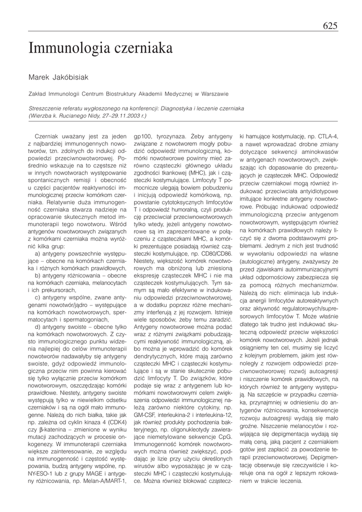 625 Immunologia czerniaka Marek Jakóbisiak Zak³ad Immunologii Centrum Biostruktury Akademii Medycznej w Warszawie Streszczenie referatu wyg³oszonego na konferencji: Diagnostyka i leczenie czerniaka (Wierzba k. Rucianego Nidy, 27–29.11.2003 r.) Czerniak uwa¿any jest za jeden z najbardziej immunogennych nowotworów, tzn. zdolnych do indukcji odpowiedzi przeciwnowotworowej. Poœrednio wskazuje na to czêstsze ni¿ w innych nowotworach wystêpowanie spontanicznych remisji i obecnoœæ u czêœci pacjentów reaktywnoœci immunologicznej przeciw komórkom czerniaka. Relatywnie du¿a immunogennoœæ czerniaka stwarza nadzieje na opracowanie skutecznych metod immunoterapii tego nowotworu. Wœród antygenów nowotworowych zwi¹zanych z komórkami czerniaka mo¿na wyró¿niæ kilka grup: a) antygeny powszechnie wystêpuj¹ce – obecne na komórkach czerniaka i ró¿nych komórkach prawid³owych, b) antygeny ró¿nicowania – obecne na komórkach czerniaka, melanocytach i ich prekursorach, c) antygeny wspólne, zwane antygenami nowotwór/j¹dro – wystêpuj¹ce na komórkach nowotworowych, spermatocytach i spermatogoniach, d) antygeny swoiste – obecne tylko na komórkach nowotworowych. Z czysto immunologicznego punktu widzenia najlepiej do celów immunoterapii nowotworów nadawa³yby siê antygeny swoiste, gdy¿ odpowiedŸ immunologiczna przeciw nim powinna kierowaæ siê tylko wy³¹cznie przeciw komórkom nowotworowym, oszczêdzaj¹c komórki prawid³owe. Niestety, antygeny swoiste wystêpuj¹ tylko w niewielkim odsetku czerniaków i s¹ na ogó³ ma³o immunogenne. Nale¿¹ do nich bia³ka, takie jak np. zale¿na od cyklin kinaza 4 (CDK4) czy β-katenina – zmienione w wyniku mutacji zachodz¹cych w procesie onkogenezy. W immunoterapii czerniaka wiêksze zainteresowanie, ze wzglêdu na immunogennoœæ i czêstoœæ wystêpowania, budz¹ antygeny wspólne, np. NY-ESO-1 lub z grupy MAGE i antygeny ró¿nicowania, np. Melan-A/MART-1, gp100, tyrozynaza. ¯eby antygeny zwi¹zane z nowotworem mog³y pobudziæ odpowiedŸ immunologiczn¹, komórki nowotworowe powinny mieæ zarówno cz¹steczki g³ównego uk³adu zgodnoœci tkankowej (MHC), jak i cz¹steczki kostymuluj¹ce. Limfocyty T pomocnicze ulegaj¹ bowiem pobudzeniu i inicjuj¹ odpowiedŸ komórkow¹, np. powstanie cytotoksycznych limfocytów T i odpowiedŸ humoraln¹, czyli produkcjê przeciwcia³ przeciwnowotworowych tylko wtedy, je¿eli antygeny nowotworowe s¹ im zaprezentowane w po³¹czeniu z cz¹steczkami MHC, a komórki prezentuj¹ce posiadaj¹ równie¿ cz¹steczki kostymuluj¹ce, np. CD80/CD86. Niestety, wiêkszoœæ komórek nowotworowych ma obni¿on¹ lub zniesion¹ ekspresjê cz¹steczek MHC i nie ma cz¹steczek kostymuluj¹cych. Tym samym s¹ ma³o efektywne w indukowaniu odpowiedzi przeciwnowotworowej, a w dodatku poprzez ró¿ne mechanizmy interferuj¹ z jej rozwojem. Istnieje wiele sposobów, ¿eby temu zaradziæ. Antygeny nowotworowe mo¿na podaæ wraz z ró¿nymi zwi¹zkami pobudzaj¹cymi reaktywnoœæ immunologiczn¹, albo mo¿na je wprowadziæ do komórek dendrytycznych, które maj¹ zarówno cz¹steczki MHC i cz¹steczki kostymuluj¹ce i s¹ w stanie skutecznie pobudziæ limfocyty T. Do zwi¹zków, które podaje siê wraz z antygenem lub komórkami nowotworowymi celem zwiêkszenia odpowiedzi immunologicznej nale¿¹ zarówno niektóre cytokiny, np. GM-CSF, interleukina-2 i interleukina-12, jak równie¿ produkty pochodzenia bakteryjnego, np. oligonukleotydy zawieraj¹ce niemetylowane sekwencje CpG. Immunogennoœæ komórek nowotworowych mo¿na równie¿ zwiêkszyæ, poddaj¹c je lizie przy u¿yciu okreœlonych wirusów albo wyposa¿aj¹c je w cz¹steczki MHC i cz¹steczki kostymuluj¹ce. Mo¿na równie¿ blokowaæ cz¹stecz- ki hamuj¹ce kostymulacjê, np. CTLA-4, a nawet wprowadzaæ drobne zmiany dotycz¹ce sekwencji aminokwasów w antygenach nowotworowych, zwiêkszaj¹c ich dopasowanie do prezentuj¹cych je cz¹steczek MHC. OdpowiedŸ przeciw czerniakowi mog¹ równie¿ indukowaæ przeciwcia³a antyidiotypowe imituj¹ce konkretne antygeny nowotworowe. Próbuj¹c indukowaæ odpowiedŸ immunologiczn¹ przeciw antygenom nowotworowym, wystêpuj¹cym równie¿ na komórkach prawid³owych nale¿y liczyæ siê z dwoma podstawowymi problemami. Jednym z nich jest trudnoœæ w wywo³aniu odpowiedzi na w³asne (autologiczne) antygeny, zwa¿ywszy ¿e przed zjawiskami autoimmunizacyjnymi uk³ad odpornoœciowy zabezpiecza siê za pomoc¹ ró¿nych mechanizmów. Nale¿¹ do nich: eliminacja lub indukcja anergii limfocytów autoreaktywnych oraz aktywnoœæ regulatorowych/supresorowych limfocytów T. Mo¿e w³aœnie dlatego tak trudno jest indukowaæ skuteczn¹ odpowiedŸ przeciw wiêkszoœci komórek nowotworowych. Je¿eli jednak osi¹gniemy ten cel, musimy siê liczyæ z kolejnym problemem, jakim jest równoleg³y z rozwojem odpowiedzi przeciwnowotworowej rozwój autoagresji i niszczenie komórek prawid³owych, na których równie¿ te antygeny wystêpuj¹. Na szczêœcie w przypadku czerniaka, przynajmniej w odniesieniu do antygenów ró¿nicowania, konsekwencje rozwoju autoagresji wydaj¹ siê ma³o groŸne. Niszczenie melanocytów i rozwijaj¹ca siê depigmentacja wydaj¹ siê ma³¹ cen¹, jak¹ pacjent z czerniakiem gotów jest zap³aciæ za powodzenie terapii przeciwnowotworowej. Depigmentacjê obserwuje siê rzeczywiœcie i koreluje ona na ogó³ z lepszym rokowaniem w trakcie leczenia.