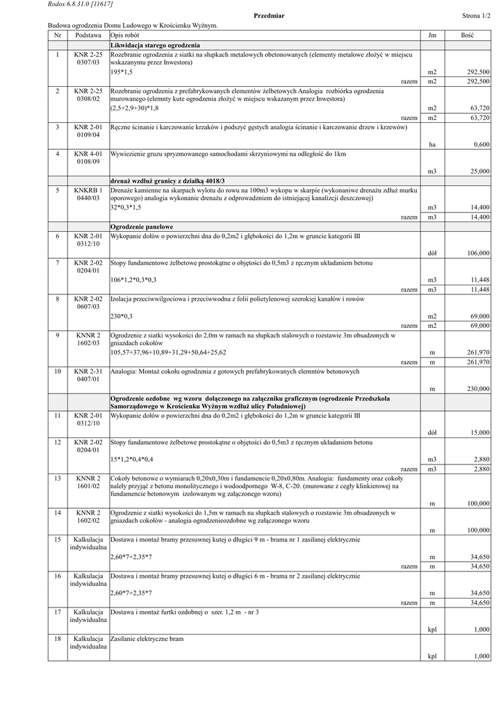 Rodos 6.8.31.0 [11617] Przedmiar Budowa ogrodzenia Domu Ludowego w Krościenku Wyżnym. Nr Podstawa Opis robót Likwidacja starego ogrodzenia 1 KNR 2-25 Rozebranie ogrodzenia z siatki na słupkach metalowych obetonowanych (elementy metalowe złożyć w miejscu 0307/03 wskazanymu przez Inwestora) 195*1,5 razem 2 KNR 2-25 Rozebranie ogrodzenia z prefabrykowanych elementów żelbetowych Analogia rozbiórka ogrodzenia 0308/02 murowanego (elemnty kute ogrodzenia złożyć w miejscu wskazanym przez Inwestora) (2,5+2,9+30)*1,8 razem 3 KNR 2-01 Ręczne ścinanie i karczowanie krzaków i podszyć gęstych analogia ścinanie i karczowanie drzew i krzewów) 0109/04 4 5 KNR 4-01 0108/09 KNKRB 1 0440/03 6 KNR 2-01 0312/10 7 KNR 2-02 0204/01 KNR 2-02 0607/03 10 KNNR 2 1602/03 KNR 2-31 0407/01 11 KNR 2-01 0312/10 12 KNR 2-02 0204/01 m2 m2 63,720 63,720 ha 0,600 m3 25,000 m3 m3 14,400 14,400 dół 106,000 razem m3 m3 11,448 11,448 razem m2 m2 69,000 69,000 razem m m 261,970 261,970 m 230,000 dół 15,000 m3 m3 2,880 2,880 m 100,000 m 100,000 razem m m 34,650 34,650 razem m m 34,650 34,650 kpl 1,000 kpl 1,000 Wywiezienie gruzu spryzmowanego samochodami skrzyniowymi na odległość do 1km drenaż wzdłuż granicy z działką 4018/3 Drenaże kamienne na skarpach wylotu do rowu na 100m3 wykopu w skarpie (wykonaniwe drenażu zdłuż murku oporowego) analogia wykonanie drenażu z odprowadzniem do istniejącej kanalizcji deszczowej) 32*0,3*1,5 razem Ogrodzenie panelowe Wykopanie dołów o powierzchni dna do 0,2m2 i głębokości do 1,2m w gruncie kategorii III Stopy fundamentowe żelbetowe prostokątne o objętości do 0,5m3 z ręcznym układaniem betonu Izolacja przeciwwilgociowa i przeciwwodna z folii polietylenowej szerokiej kanałów i rowów Ogrodzenie z siatki wysokości do 2,0m w ramach na słupkach stalowych o rozstawie 3m obsadzonych w gniazdach cokołów 105,57+37,96+10,89+31,29+50,64+25,62 Analogia: Montaż cokołu ogrodzenia z gotowych prefabrykowanych elemntów betonowych Ogrodzenie ozdobne wg wzoru dołączonego na załączniku graficznym (ogrodzenie Przedszkola Samorządowego w Krościenku Wyżnym wzdłuż ulicy Południowej) Wykopanie dołów o powierzchni dna do 0,2m2 i głębokości do 1,2m w gruncie kategorii III Stopy fundamentowe żelbetowe prostokątne o objętości do 0,5m3 z ręcznym układaniem betonu 15*1,2*0,4*0,4 13 KNNR 2 1601/02 razem Cokoły betonowe o wymiarach 0,20x0,30m i fundamencie 0,20x0,80m. Analogia: fundamenty oraz cokoły naleły przyjąć z betonu monolitycznego i wodoodpornego W-8, C-20. (murowane z cegły klinkierowej na fundamencie betonowym izolowanym wg załączonego wzoru) 14 KNNR 2 1602/02 Ogrodzenie z siatki wysokości do 1,5m w ramach na słupkach stalowych o rozstawie 3m obsadzonych w gniazdach cokołów - analogia ogrodzenieozdobne wg załączonego wzoru 15 16 Ilość 292,500 292,500 230*0,3 9 Jm m2 m2 106*1,2*0,3*0,3 8 Strona 1/2 Kalkulacja Dostawa i montaż bramy przesuwnej kutej o długści 9 m - brama nr 1 zasilanej elektrycznie indywidualna 2,60*7+2,35*7 Kalkulacja Dostawa i montaż bramy przesuwnej kutej o długści 6 m - brama nr 2 zasilanej elektrycznie indywidualna 2,60*7+2,35*7 17 Kalkulacja Dostawa i montaż furtki ozdobnej o szer. 1,2 m - nr 3 indywidualna 18 Kalkulacja Zasilanie elektryczne bram indywidualna Rodos 6.8.31.0 [11617] Strona 2/2 Przedmiar Budowa ogrodzenia Domu Ludowego w Krościenku Wyżnym. Nr Podstawa Opis robót 19 KNNR 1 Ręczne plantowanie powierzchni gruntu rodzimego kategorii III 0501/02 18,5*2+21,5*1 Jm razem m2 m2 Ilość 58,500 58,500