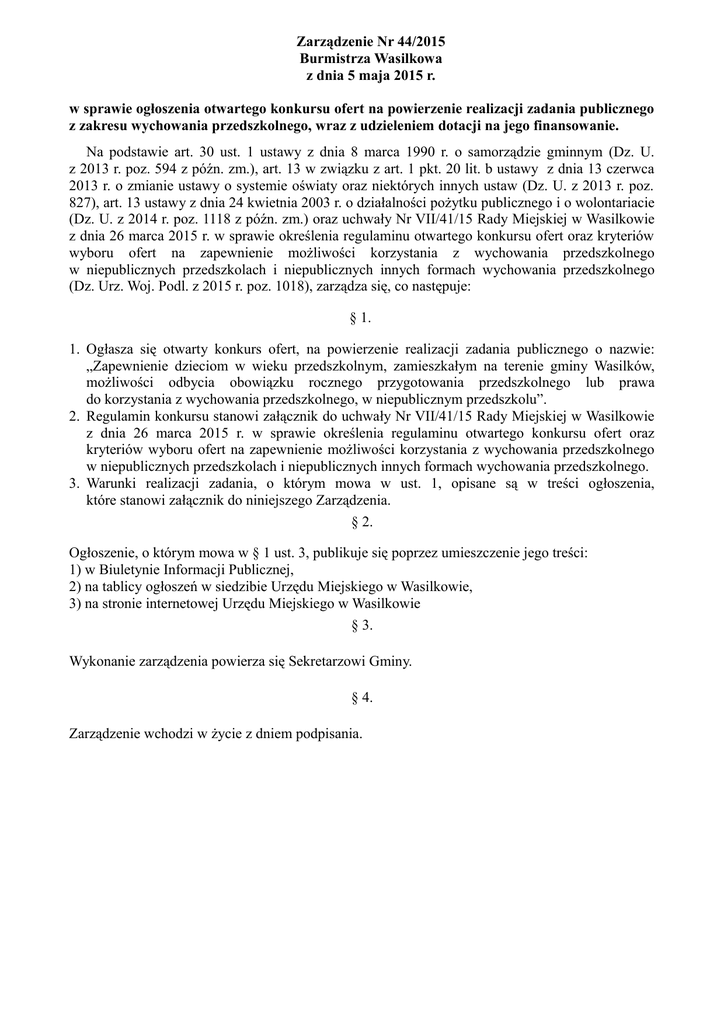 Zarządzenie Nr 44/2015 Burmistrza Wasilkowa z dnia 5 maja 2015 r. w sprawie ogłoszenia otwartego konkursu ofert na powierzenie realizacji zadania publicznego z zakresu wychowania przedszkolnego, wraz z udzieleniem dotacji na jego finansowanie. Na podstawie art. 30 ust. 1 ustawy z dnia 8 marca 1990 r. o samorządzie gminnym (Dz. U. z 2013 r. poz. 594 z późn. zm.), art. 13 w związku z art. 1 pkt. 20 lit. b ustawy z dnia 13 czerwca 2013 r. o zmianie ustawy o systemie oświaty oraz niektórych innych ustaw (Dz. U. z 2013 r. poz. 827), art. 13 ustawy z dnia 24 kwietnia 2003 r. o działalności pożytku publicznego i o wolontariacie (Dz. U. z 2014 r. poz. 1118 z późn. zm.) oraz uchwały Nr VII/41/15 Rady Miejskiej w Wasilkowie z dnia 26 marca 2015 r. w sprawie określenia regulaminu otwartego konkursu ofert oraz kryteriów wyboru ofert na zapewnienie możliwości korzystania z wychowania przedszkolnego w niepublicznych przedszkolach i niepublicznych innych formach wychowania przedszkolnego (Dz. Urz. Woj. Podl. z 2015 r. poz. 1018), zarządza się, co następuje: § 1. 1. Ogłasza się otwarty konkurs ofert, na powierzenie realizacji zadania publicznego o nazwie: „Zapewnienie dzieciom w wieku przedszkolnym, zamieszkałym na terenie gminy Wasilków, możliwości odbycia obowiązku rocznego przygotowania przedszkolnego lub prawa do korzystania z wychowania przedszkolnego, w niepublicznym przedszkolu”. 2. Regulamin konkursu stanowi załącznik do uchwały Nr VII/41/15 Rady Miejskiej w Wasilkowie z dnia 26 marca 2015 r. w sprawie określenia regulaminu otwartego konkursu ofert oraz kryteriów wyboru ofert na zapewnienie możliwości korzystania z wychowania przedszkolnego w niepublicznych przedszkolach i niepublicznych innych formach wychowania przedszkolnego. 3. Warunki realizacji zadania, o którym mowa w ust. 1, opisane są w treści ogłoszenia, które stanowi załącznik do niniejszego Zarządzenia. § 2. Ogłoszenie, o którym mowa w § 1 ust. 3, publikuje się poprzez umieszczenie jego treści: 1) w Biuletynie Informacji Publicznej, 2) na tablicy ogłoszeń w siedzibie Urzędu Miejskiego w Wasilkowie, 3) na stronie internetowej Urzędu Miejskiego w Wasilkowie § 3. Wykonanie zarządzenia powierza się Sekretarzowi Gminy. § 4. Zarządzenie wchodzi w życie z dniem podpisania. Załącznik do Zarządzenia Nr 44/2015 z dnia 5 maja 2015 r. OGŁOSZENIE Burmistrz Wasilkowa, ogłasza otwarty konkurs ofert, na powierzenie realizacji zadania publicznego z zakresu wychowania przedszkolnego, wraz z udzielaniem dotacji na jego finansowanie. I. Rodzaj zadania. „Zapewnienie dzieciom w wieku przedszkolnym, zamieszkałym na terenie gminy Wasilków, możliwości odbycia obowiązku rocznego przygotowania przedszkolnego lub prawa do korzystania z wychowania przedszkolnego, w niepublicznym przedszkolu.” II. Wysokość środków przeznaczonych na powierzenie zadania oraz wysokość dotacji na jedno dziecko, jaką otrzyma podmiot realizujący zadanie. 1. Na realizację zadania gmina Wasilków planuje przeznaczyć środki finansowe: 1) w roku 2015- do 2 834 210,00 zł, 2) w roku 2016- około 2 850 000,00 zł. 2. Podmiot, który będzie realizował zadanie otrzyma dotację z budżetu gminy Wasilków na każde dziecko, w wysokości równej wydatkom bieżącym, przewidzianym na jedno dziecko w przedszkolach publicznych prowadzonych przez gminę Wasilków, pomniejszoną o opłaty za korzystanie z wychowania przedszkolnego oraz za wyżywienie, stanowiące dochody budżetu gminy, z tym, że na dziecko niepełnosprawne w wysokości równej kwocie przewidzianej na niepełnosprawne dziecko przedszkola, w części oświatowej subwencji ogólnej otrzymywanej przez gminę Wasilków. III. Warunki jakie musi spełnić podmiot, któremu może zostać powierzona realizacja zadania. 1. Konkurs ofert dotyczy prowadzenia niepublicznego przedszkola na warunkach, o których mowa w art. 90 ust. 1b ustawy o systemie oświaty. 2. Do konkursu przystąpić mogą, organy prowadzące przedszkola niepubliczne, które są wpisane do ewidencji szkół i placówek niepublicznych gminy Wasilków. 3. Niepubliczne przedszkole realizujące zadanie, musi spełnić następujące warunki: 1) określone w art. 6 ust. 1 ustawy o systemie oświaty, z tym że czas bezpłatnego nauczania, wychowania i opieki, o którym mowa w art. 6 ust. 1 pkt 2, nie może być krótszy niż czas bezpłatnego nauczania, wychowania i opieki ustalony uchwałą Nr XXIV/201/12 Rady Miejskiej w Wasilkowie z dnia 28 czerwca 2012 r. w sprawie opłat za świadczenia przekraczające bezpłatne podstawy programowe przedszkoli i innych publicznych form wychowania przedszkolnego (tj. 5 godzin dziennie), 2) będzie pobierać opłaty za korzystanie z wychowania przedszkolnego nie wyższe niż opłaty ustalone uchwałą Nr XXIV/201/12 Rady Miejskiej w Wasilkowie z dnia 28 czerwca 2012 r. w sprawie opłat za świadczenia przekraczające bezpłatne podstawy programowe przedszkoli i innych publicznych form wychowania przedszkolnego (tj. 1,00 zł za godzinę), 3) będzie prowadzić dokumentację przebiegu nauczania, wychowania i opieki ustaloną dla przedszkoli publicznych, 4) zapewni liczbę uczniów w oddziale przedszkolnym nieprzekraczającą maksymalnej liczby uczniów w oddziale przedszkola publicznego (tj. 25 uczniów), 5) zapewni uczniom pomoc psychologiczno-pedagogiczną zgodnie z przepisami wydanymi na podstawie art. 22 ust. 2 pkt 11 ustawy o systemie oświaty, 6) będzie stosować zasady przyjmowania do publicznego przedszkola, określone w rozdziale 2a ustawy o systemie oświaty. 4. Ponadto podmiot realizujący zadanie, musi zapewnić następujące standardy wychowania przedszkolnego, obowiązujące w przedszkolu publicznym prowadzonym przez gminę Wasilków: 1) zapewnić możliwość korzystania z usług świadczonych przez przedszkole w godz. 6.30-17.00, 2) realizować podstawę programową wychowania przedszkolnego w godz. 7.30-12.30 (czas bezpłatnego nauczania d