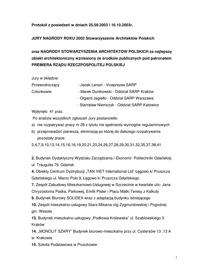 Protokół z posiedze w dniach 25.09.2003 i 16.10.2003r. JURY NAGRODY ROKU 2002 Stowarzyszenie Architektów Polskich oraz NAGRODY STOWARZYSZENIA ARCHITEKTOW POLSKICH za najlepszy obiekt architektoniczny wzniesiony ze rodków publicznych pod patronatem PREMIERA RZ DU RZECZPOSPOLITEJ POLSKIEJ Jury w składzie: Przewodnicz cy - Jacek Lenart - Viceprezes SARP Członkowie: - Marek Dunikowski - Oddział SARP Kraków - Olgierd Jagiełło - Oddział SARP Warszawa - Stanisław Niemczyk - Oddział SARP Katowice Wpłyn ło 41 prac. Po analizie wszystkich zgłosze Jury postanowiło: a) nie rozpatrywa pracy nr 28 z tytułu nie spełnienia wymogów regulaminowych b) przeprowadzi pierwsz eliminacj po której do dalszego rozpatrywania pozostały prace: 2,4,7,9,10,13,14,15,16,18,19,20,21,23,24,26,27,28,29,30,31,32,35,37,38,41. 2. Budynek Dydaktyczny Wydziału Zarz dzania i Ekonomii Politechniki Gda skiej ul. Traugutta 79, Gda sk 4. Obiekty Centrum Dystrybucji „TAN VIET International Ltd” Ł gowo k/ Pruszcza Gda skiego ul. Marco Polo 9, Ł gowo k/ Pruszcza Gda skiego 7. Zespół Zabudowy Mieszkaniowo-Usługowej w Szczecinie w kwartale ulic: Jana Chryzostoma Paska, Parkowej, Emilii Plater i Placu Matki Teresy z Kalkuty 9. Budynek Biurowy SOLIDEX wraz z adaptacj budynku istniej cego 10. Zespól mieszkalno-usługowy Stara Miłosna róg Zygmuntowskiej i Pogodnej gm. Wesoła 13. Budynek mieszkalno-usługowy „Podkowa Królewska” ul. Szablowskiego 3 Kraków 14. „MONOLIT SZARY” Budynek biurowo-mieszkalny przy ul. Cystersów 13 ,13 A w Krakowie 15. Szkoła Podstawowa w Pruszkowie 1 16. Wydział Biologii Molekularnej i Biotechnologii oraz Zespół DydaktycznoBiologiczny i wej cia Głównego Kompleksu Nauk Biologicznych zlokalizowany na terenie Kampusu 600-lecia odnowienia Uniwersytetu Jagiello skiego 18. Biurowiec FUTURA poło ony przy ul. Pi tkowskiej 161 w Poznaniu 19. Wojewódzki O rodek Ruchu Drogowego w Poznaniu z obiektami towarzysz cymi ul. Wilczak 53 20. Dworzec autobusowy komunikacji miejskiej w Rybniku ul. Budowlanych 6 21. Odbudowa Starej Papierni w Konstancinie-Jeziornej i adaptacja na Centrum Usługowo-Handlowo-Kulturalne ul. Warszawska róg Wojska Polskiego 3 Konstancin - Jeziorna 23. Zabudowa wschodniej ciany Al. KEN, Warszawa / od Beli Bartoka do Jarz bowskiego/ 24. Przedszkole integracyjne dla 80 dzieci przy ul. Bieniewickiej 32 w Warszawie 26. Kryta pływalnia typu wielozadaniowego z parkingiem podziemnym przy ul. Białobrzeskiej w Warszawie 27. Kryta Pływalnia w O arowie Mazowieckim ul. Pozna ska róg Szkolnej 28. Zespól mieszkaniowy EKO-Park Warszawa ul. Chodkiewicz 11 29. Zespól mieszkaniowy EKO-PARK Etap A4 30. Budynek biurowy firmy AVON – ul. Słowicza 32 róg Hynka Warszawa 31. Siedziba PLL LOT Warszawa 32. Zakład badania ssaków Polskiej Akademii Nauk ul. Waszkiewicza 1, Białowie a 35. Budynek Dydaktyczny Wydziału Prawa, Administracji i Ekonomii Uniwersytetu Wrocławskiego przy ul. Ku niczej 42 / Uniwersyteckiej 7 we Wrocławiu 37. Centrum Handlowo-Usługowo-Biurowe „ Galeria Łódzka” Al. Piłsudskiego 15/23 38. Wie a S dziowska na Wielkiej Krokwi 41. Cmentarz Komunalny w Cz stochowie przy ulicy Białostockiej W rezultacie dalszej analizy i porównania pozostałych w wyniku pierwszej eliminacji prac nominowano do Nagrody Roku 16 prac. 7,9,10,13,14,15,16,21,26,27,29,30,31,35,37,41. 7. Zespół Zabudowy Mieszkaniowo-Usługowej w Szczecinie w kwartale ulic: Jana Chryzostoma Paska, Parkowej, Emilii Plater i Placu Matki Teresy z Kalkuty 9. Budynek Biurowy SOLIDEX wraz z adaptacj budynku istniej cego 2 10. Zespól mieszkalno-usługowy Stara Miłosna róg Zygmuntowskiej i Pogodnej gm. Wesoła 13. Budynek mieszkalno-usługowy „Podkowa Królewska” ul. Szablowskiego 3, Kraków 14. „MONOLIT SZARY” Budynek biurowo-mieszkalny przy ul. Cystersów 13 ,13 A w Krakowie 15. Szkoła Podstawowa w Pruszkowie 16. Wydział Biologii Molekularnej i Biotechnologii oraz Zespół DydaktycznoBiologiczny i wej cia Głównego Kompleksu Nauk Biologicznych zlokalizowany na terenie Kampusu 600-lecia odnowienia Uniwersytetu Jagiello skiego 21. Odbudowa Starej Papierni w Konstancinie-Jeziornej i adaptacja na Centrum Usługowo-Handlowo-Kulturalne ul. Warszawska róg Wojska Polskiego 3 Konstancin - Jeziorna 26. Kryta pływalnia typu wielozadaniowego z parkingiem podziemnym przy ul. Białobrzeskiej w Warszawie 27. Kryta Pływalnia w O arowie Mazowieckim ul. Pozna ska róg Szkolnej 29. Zespól mieszkaniowy EKO-PARK Etap A4 30. Budynek biurowy firmy AVON – ul. Słowicza 32 róg Hynka Warszawa 31. Siedziba PLL LOT Warszawa 35. Budynek Dydaktyczny Wydziału Prawa, Administracji i Ekonomii Uniwersytetu Wrocławskiego przy ul. Ku niczej 42 / Uniwersyteckiej 7 we Wrocławiu 37. Centrum Handlowo-Usługowo-Biurowe „ Galeria Łódzka” Al. Piłsudskiego 15/23 41. Cmentarz Komunalny w Cz stochowie przy ulicy Białostockiej Po wizji lokalnej oraz zwa ywszy zauwa alne uznanie dla obiektów przez u ytkowników i odbiorców ich walorów architektonicznych przyznano: NAGRODA ROKU 2002 GŁÓWNA i RÓWNORZ DNA w kategorii budynków u yteczno ci publicznej praca nr 21 Obiekt: Odbudowa Starej Papierni w Konstancinie-Jeziornej i adaptacja na Centrum Usługowo-Handlowo-Kulturalne ul. Warszawska róg Wojska Polskiego 3 3 Konstancin - Jeziorna Autorzy: arch. Włodzimierz Mucha arch. Andrzej Bulanda arch. Łukasz Stanaszek arch. Rafał Zelent arch. Andrzej Gomułka Współpraca: arch. Jarosław Ptaszy ski arch. Małgorzata Trybulska tech. Anna Wesołowska Inwestor: „Stara Papiernia” Sp. z o.o. Wykonawca: WARBUD S.A NAGRODA ROKU 2002 RÓWNORZ DNA w kategorii architektury mieszkaniowej praca nr 29 Obiekt: Zespól mieszkaniowy EKO-PARK Etap A4 Autorzy: arch. Stefan Kuryłowicz arch. Paweł Grodzicki arch. Paweł Gumuła arch. Agnieszka Stefa ska Inwestor: Eko-Park S.A Generalny wykonawca: Mitex S.A. WYRÓ NIENIA 10,27,30,37,41 praca nr 10 Obiekt: Zespól mieszkalno-usługowy Stara Miłosna róg Zygmuntowskiej i Pog