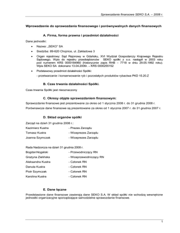 Sprawozdanie finansowe SEKO S.A. – 2008 r. Wprowadzenie do sprawozdania finansowego i porównywalnych danych finansowych A. Firma, forma prawna i przedmiot działalności Dane jednostki: Nazwa: „SEKO” SA Siedziba: 89-620 Chojnice, ul. Zakładowa 3 Organ rejestrowy: Sąd Rejonowy w Gdańsku, XVI Wydział Gospodarczy Krajowego Rejestru Sądowego. Wpis do rejestru przedsiębiorców SEKO spółki z o.o. nastąpił w 2003 roku pod numerem KRS 0000184960 (historycznie zapis RHB – 7718 w dniu 29.05.1992 roku). Wpis SEKO SA dokonano 13.04.2006r. – KRS 0000255152 Podstawowy przedmiot działalności Spółki: - przetwarzanie i konserwowanie ryb i pozostałych produktów rybactwa PKD 15.20.Z B. Czas trwania działalności Spółki. Czas trwania Spółki jest nieoznaczony C. Okresy objęte sprawozdaniem finansowym: Sprawozdanie finansowe jest prezentowane za okres od 1 stycznia 2008 r. do 31 grudnia 2008 r. Porównawcze dane finansowe są prezentowane za okres od 1 stycznia 2007 r. do 31 grudnia 2007 r. D. Skład organów spółki Zarząd na dzień 31 grudnia 2008 r.: Kazimierz Kustra - Prezes Zarządu Tomasz Kustra - Wiceprezes Zarządu Joanna Szymczak - Wiceprezes Zarządu Rada Nadzorcza na dzień 31 grudnia 2008 r. Bogdan Nogalski - Przewodniczący RN Grażyna Zielińska - Wiceprzewodniczący RN Aleksandra Kustra - Członek RN Danuta Kustra - Członek RN Piotr Szymczak - Członek RN Karolina Kustra - Członek RN E. Dane łączne Przedstawione dane finansowe zawierają dane SEKO S.A. W skład spółki nie wchodzą wewnętrzne jednostki organizacyjne sporządzające samodzielne sprawozdanie finansowe. 1 Sprawozdanie finansowe SEKO S.A. – 2008 r. F. Jednostka dominująca Na dzień 31 grudnia 2008 r. Spółka jest jednostką dominującą wobec spółki Złota Rybka Bis Sp. z o.o. SEKO S.A. jest właścicielem 90,0% udziałów w spółce Złota Rybka Bis Sp. z o.o., które dają prawo do 90,0% głosów na Zgromadzeniu Wspólników. Kapitał zakładowy spółki Złota Rybka Bis Sp. z o.o. wynosi 50,0 tys. zł. Ponadto Spółka jest jednostką dominującą wobec spółki Polryb Sp. z o.o. SEKO S.A. jest właścicielem 2 693 udziałów w spółce Polryb Sp. z o.o., które stanowią 50,0% kapitału zakładowego spółki i dają 50,0% udziałów w głosach na Zgromadzeniu Wspólników. Ponadto SEKO S.A. korzysta z osobistego przywileju powoływania dwóch spośród trzech członków zarządu spółki. SEKO S.A. jako jednostka dominująca w stosunku do firm: POLRYB Sp. z o.o. i ZŁOTA RYBKA BIS Sp. z o.o. odstąpiła od konsolidacji kierując się zasadą istotności, o której mowa w par. 5 i 8 MSR 8 „Zasady (polityka) rachunkowości, zmiany wartości szacunkowych i korygowanie błędów”. Zgodnie z MSR Nr 1 & 29-31 emitent w emitent w sprawozdaniu finansowym za 2008 rok wyodrębnił istotne dane finansowe podmiotów zależnych. G. Połączenie spółek W trakcie trwania okresu sprawozdawczego nie nastąpiło połączenie SEKO SA z innym podmiotem. H. Kontynuacja działalności Sprawozdanie finansowe zostało sporządzone przy założeniu kontynuacji działalności gospodarczej przez Spółkę w dającej się przewidzieć przyszłości. Nie są znane okoliczności wskazujące na zagrożenie kontynuowania przez spółkę działalności I. Prezentacja i przekształcenie sprawozdań finansowych Sprawozdanie finansowe za 2008 r. zostało sporządzone za okres 1 stycznia – 31.grudnia 2008r. Spółka nie dokonywała przekształceń sprawozdań finansowych w celu zapewnienia porównywalności danych, ponieważ w latach 2007 i 2008 w Spółce nie były dokonywane zmiany zasad rachunkowości. J. Korekty wynikające z zastrzeżeń w opiniach podmiotów uprawnionych do badania W prezentowanym sprawozdaniu finansowym nie dokonywano żadnych korekt wynikających z zastrzeżeń podmiotów uprawnionych do badania sprawozdań finansowych. K. Zasady (polityka) rachunkowości, w tym metody wyceny aktywów i pasywów, ustalenia przychodów, kosztów i wyniku finansowego oraz sposób sporządzania sprawozdania finansowego Zasady rachunkowości przyjęte przy sporządzaniu sprawozdania finansowego na dzień 31 grudnia 2008 r. są zgodne z ustawą z dnia 29 września 1994 r. o rachunkowości ze zmianami. Zapisy księgowe prowadzone są według zasady kosztu historycznego. Jednostka nie dokonywała żadnych korekt, które odzwierciedlałyby wpływ inflacji na poszczególne pozycje bilansu oraz rachunku zysków i strat. Spółka sporządza rachunek zysków i strat w wariancie kalkulacyjnym. Rachunek przepływów pieniężnych sporządzany jest metodą pośrednią. Wartości niematerialne i prawne wyceniane są według cen nabycia lub kosztów wytworzenia. Odpisy amortyzacyjne wartości niematerialnych i prawnych, stanowiących nabyte prawa, dokonywane są metodą liniową przy zastosowaniu stawek wynikających z ustawy o podatku dochodowym od osób prawnych, przy czym okres dokonywania odpisów umorzeniowych wynosi dla: 2 Sprawozdanie finansowe SEKO S.A. – 2008 r. oprogramowań oraz licencji - 2 lata praw autorskich - 2 lata ,gdy ich wartość początkowa jest równa 500,00 zł i więcej. Podatkowo - licencje na programy komputerowe o wartości początkowej nie przekraczającej 3 500,00 zł nie podlegają amortyzacji w czasie a ich wartość jest kosztem uzyskania przychodu w momencie oddania do użytku. Nie amortyzuje się wartości niematerialnych i prawnych, gdy ich wartość nie przekracza 500,00 zł - są kosztem zużycia materiałów w miesiącu oddania do użytku. Rzeczowe aktywa trwałe są wyceniane w cenie nabycia lub koszcie wytworzenia po aktualizacji wyceny składników majątku pomniejszonych o skumulowane umorzenie oraz dokonane odpisy aktualizujące ich wartość. Zgodnie z Ustawą o Rachunkowości wartość początkowa i dotychczas dokonane od środków trwałych odpisy amortyzacyjne (umorzeniowe) mogą na podstawie odrębnych przepisów ulegać aktualizacji wyceny. Ustalona w wyniku aktualiza