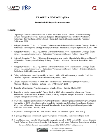 TRAGEDIA GÓRNOŚLĄSKA Zestawienie bibliograficzne w wyborze Książki 1. Deportacje Górnoślązaków do ZSRR w 1945 roku / red. Adam Dziurok, Marcin Niedurny ; Instytut Pamięci Narodowej - Komisja Ścigania Zbrodni przeciwko Narodowi Polskiemu. Katowice : Instytut Pamięci Narodowej - Komisja Ścigania Zbrodni przeciwko Narodowi Polskiemu, 2004 2. Księga Sybiraków. T. 1 z. 1 / Centrum Dokumentowania Losów Mieszkańców Górnego Śląska. – Katowice : Towarzystwo Zachęty Kultury ; Gliwice : Muzeum : Związek Sybiraków. Koło, 1993 3. Księga Sybiraków. T. 1 z. 2 / [Centrum Dokumentowania Losów Mieszkańców Górnego Śląska : oprac. i red. Jerzy Miksiewicz]. – Katowice : Towarzystwo Zachęty Kultury [etc.], 1995 4. Księga Sybiraków. T. 2 z. 1 / Centrum Dokumentowania Losów Mieszkańców Górnego Śląska T. – Katowice : Towarzystwo Zachęty Kultury ; Gliwice : Muzeum : Związek Sybiraków. Koło, 1994 5. Księga Sybiraków. T. 2 z. 2 / [Centrum Dokumentowania Losów Mieszkańców Górnego Śląska : oprac. i red. Jerzy Miksiewicz]. – Katowice : Towarzystwo Zachęty Kultury ; Gliwice : Związek Sybiraków. Oddział Rejonowy, 1998 6. Ofiary stalinizmu na ziemi bytomskiej w latach 1945-1956 : dokumentacja zbrodni / red. Jan Drabina. - Bytom : Towarzystwo Miłośników Bytomia, 1993 7. „Śląska tragedia” w Zabrzu w 1945 roku : internowania i deportacje / [Zbigniew Gołasz] ; Muzeum Miejskie w Zabrzu. - Zabrze : MM : "M-Studio", 2005 8. Tragedia górnośląska / Franciszek Antoni Marek. - Opole : Instytut Śląski, 1989 9. Tragedia w cieniu „wyzwolenia”. Górny Śląsk w 1945 roku : materiały edukacyjne / Anna Skiendziel, Adam Dziurok, Kornelia Banaś, Andrzej Sznajder, Lucyna Staniczek. – Katowice : Instytut Pamięci Narodowej, 2015 10. Wywózka : deportacja mieszkańców Górnego Śląska do obozów pracy przymusowej w Związku Sowieckim w 1945 roku : faktografia, konteksty, pamięć / red. Sebastian Rosenbaum, Dariusz Węgrzyna. - Katowice : Instytut Pamięci Narodowej - Komisja Ścigania Zbrodni przeciwko Narodowi Polskiemu. Oddział, 2014 11. Wywózka Górnoślązaków do ZSRR w 1945 roku / Jan Drabina. – [Bm : b.w, 1997] 12. Z górnego Śląska do sowieckich łagrów / Zygmunt Woźniczka. - Katowice : Śląsk, 1996 13. Z przeklętego raju : zapiski Górnoślązaków deportowanych w 1945 r. do ZSRS / oprac. Kornelia Banaś, Sebastian Rosenbaum ; [transkr. dok. i oprac. wersji niem. Sebastian Rosenbaum, Marius Oprac. …Elżbieta Barczyk – nauczyciel bibliotekarz PBP RODN „WOM” w Częstochowie Licencja Uznanie autorstwa Użycie niekomercyjne 3.0. Polska 1 Urbanik] ; Oddział Instytutu Pamięci Narodowej - Komisji Ścigania Zbrodni przeciwko Narodowi Polskiemu w Katowicach. - Katowice : Oddział Instytutu Pamięci Narodowej - Komisji Ścigania Zbrodni przeciwko Narodowi Polskiemu, 2009 14. Zapomniane historie ludzkich dramatów : losy mieszkańców Górnego Śląska w latach 1939-1956 / red. Kornelia Banaś, Andrzej Sznajder. - Katowice : Instytut Pamięci Narodowej - Komisja Ścigania Zbrodni Przeciwko Narodowi Polskiemu, 2003 Artykuły z czasopism 1. Branka śląska 1945-1946 / Henryka Wolna Van Das // Śląsk. - 2012, nr 12, s. 26-30 2. Cena "wyzwolenia" / Kornelia Banaś // Śląsk. - 2010, nr 2, s. 14-16 3. Czy to było wyzwolenie? : Górny Śląsk w 1945 roku / Zygmunt Woźniczka // Śląsk. - 1996, nr 3, s. 20-22 4. Górnośląska tragedia / Adam Turla // Śląsk. - 2010, nr 2, s. 10-13 5. Górnoślązacy jako forma reparacji : deportacje z Górnego Śląska do ZSRR w 1945 roku / Dariusz Węgrzyn // Zesłaniec. - 2008, nr 35, s. 51-70 6. Kierunek: Wschód : deportacje Ślązaków / Krzysztof Karwat // Śląsk. - 1996, nr 3, s. 10-13 7. Kilka uwag o liczbie Górnoślązaków deportowanych do ZSRS w 1945 r. / Dariusz Węgrzyn // CzasyPismo. - 2012, nr 1, s. 80-85 8. Los : wywózki Ślązaków w 1945 r. do ZSRR / Elżbieta Maj // Śląsk. - 2014, nr 7, s. 16-17 9. Oddamy wam tylko mury i pustą ziemię : demontaże i wywózka sprzętu przez Sowietów w 1945 roku z terenu Górnego Śląska / Adam Dziurok, Bogdan Musiał // CzasyPismo. - 2012, nr 2, s. 108-117 10. Przemilczana tragedia / Kornelia Banaś // Gość Niedzielny. - 2003, nr 48, s. 37 11. Przeżyć Golgotę / Beata Tomanek // Śląsk. - 2014, nr 11, s. 8-10 12. Represje na Górnym Śląsku w 1945 r. / Zygmunt Woźniczka // Wiadomości Historyczne. - 1995, nr 2, s. 65-77 13. Szpitalnicy : 1945: o tragedii śląskiej wiemy coraz więcej / Andrzej Jarczewski // Śląsk. - 2005, nr 6, s. 36-39 14. Śląska Golgota / Norbert Honka // Nasza Gazeta. - 1996, nr 3, s. 8-9 15. Tragedia Górnośląska / [aut.] Jerzy Myszor [i in.] // Gość Niedzielny. - 2015, nr 4, dodatek. - 16 s. 16. Wywózka Górnoślązaków do ZSRR w 1945 roku / Jan Drabina // Niepodległość i Pamięć. - 1997, nr 2, s. 159-169 17. Zostały setki wdów / Barbara Poremba-Wolkowa // Śląsk. - 1996, nr 1, s. 19-21 Oprac. …Elżbieta Barczyk – nauczyciel bibliotekarz PBP RODN „WOM” w Częstochowie Licencja Uznanie autorstwa Użycie niekomercyjne 3.0. Polska 2 Oprac. …Elżbieta Barczyk – nauczyciel bibliotekarz PBP RODN „WOM” w Częstochowie Licencja Uznanie autorstwa Użycie niekomercyjne 3.0. Polska 3