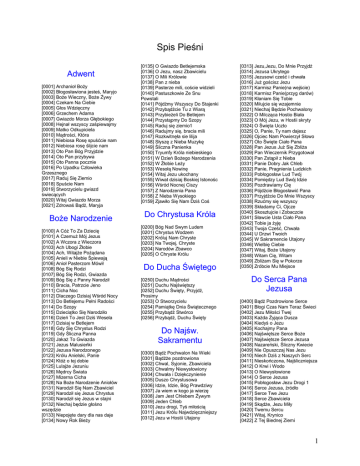 Spis Pieśni Adwent [0001] Archanioł Boży [0002] Błogosławiona jesteś, Maryjo [0003] Boże Wieczny, Boże Żywy [0004] Czekam Na Ciebie [0005] Głos Wdzięczny [0006] Grzechem Adama [0007] Gwiazdo Morza Głębokiego [0008] Hejnał wszyscy zaśpiewajmy [0009] Matko Odkupiciela [0010] Mądrości, Która [0011] Niebiosa Rosę spuśćcie nam [0012] Niebiosa rosę ślijcie nam [0013] Oto Pan Bóg Przyjdzie [0014] Oto Pan przybywa [0015] Oto Panna pocznie [0016] Po Upadku Człowieka Grzesznego [0017] Raduj Się Ziemio [0018] Spuście Nam [0019] Stworzycielu gwiazd świecących [0020] Witaj Gwiazdo Morza [0021] Zdrowaś Bądź, Maryja Boże Narodzenie [0100] A Cóż To Za Dziecię [0101] A Czemuż Mój Jezus [0102] A Wczora z Wieczora [0103] Ach Ubogi Żłobie [0104] Ach, Witajże Pożądana [0105] Anieli w Niebie Śpiewają [0106] Anioł Pasterzom Mówił [0108] Bóg Się Rodzi [0107] Bóg Się Rodzi, Gwiazda [0109] Bóg Się z Panny Narodził [0110] Bracia, Patrzcie Jeno [0111] Cicha Noc [0112] Dlaczego Dzisiaj Wśród Nocy [0113] Do Betlejemu Pełni Radości [0114] Do Szopy [0115] Dzieciątko Się Narodziło [0116] Dzień To Jest Dziś Wesela [0117] Dzisiaj w Betlejem [0118] Gdy Się Chrystus Rodzi [0119] Gdy Śliczna Panna [0120] Jakaż To Gwiazda [0121] Jezus Malusieńki [0122] Jezusa Narodzonego [0123] Królu Anielski, Panie [0124] Któż o tej dobie [0125] Lulajże Jezuniu [0126] Mędrcy Świata [0127] Mizerna Cicha [0128] Na Boże Narodzenie Aniołów [0131] Narodził Się Nam Zbawiciel [0129] Narodził się Jezus Chrystus [0130] Narodził się Jezus w stajni [0132] Niechaj będzie głośno wszędzie [0133] Niepojęte dary dla nas daje [0134] Nowy Rok Bieży [0135] O Gwiazdo Betlejemska [0136] O Jezu, nasz Zbawicielu [0137] O Mili Królowie [0138] Pan z nieba [0139] Pasterze mili, coście widzieli [0140] Pastuszkowie Ze Snu Powstali [0141] Pójdźmy Wszyscy Do Stajenki [0142] Przybądźcie Tu z Wiarą [0143] Przybieżeli Do Betlejem [0144] Przystąpmy Do Szopy [0145] Raduj się ziemio1 [0146] Radujmy się, bracia mili [0147] Rozkwitnęła sie lilija [0148] Słyszę z Nieba Muzykę [0149] Śliczna Panienka [0150] Tryumfy Króla niebieskiego [0151] W Dzień Bożego Narodzenia [0152] W Żłobie Leży [0153] Wesołą Nowinę [0154] Witaj Jezu ukochany [0155] Wiwat dzisiaj Boskiej Istonośc [0156] Wśród Nocnej Ciszy [0157] Z Narodzenia Pana [0158] Z Nieba Wysokiego [0159] Zjawiło Się Nam Dziś Coś Do Chrystusa Króla [0200] Bóg Nad Swym Ludem [0201] Chrystus Wodzem [0202] Króluj Nam Chryste [0203] Na Twojej, Chryste [0204] Narodów Zbawco [0205] O Chryste Królu Do Ducha Świętego [0250] Duchu Mądrości [0251] Duchu Najświętszy [0252] Duchu Święty, Przyjdź, Prosimy [0253] O Stworzycielu [0254] Pamiątkę Dnia Świątecznego [0255] Przybądź Stwórco [0256] Przybądź, Duchu Święty Do Najśw. Sakramentu [0300] Bądź Pochwalon Na Wieki [0301] Bądźże pozdrowiona [0302] Chwal, Syjonie, Zbawiciela [0303] Chwalmy Niewysłowiony [0304] Chwała i Dziękczynienie [0305] Duszo Chrystusowa [0306] Idzie, Idzie, Bóg Prawdziwy [0307] Ja wiem w kogo ja wierzę [0308] Jam Jest Chlebem Żywym [0309] Jeden Chleb [0310] Jezu drogi, Tyś miłością [0311] Jezu Królu Najwdzięczniejszy [0312] Jezu w Hostii Utajony [0313] Jezu,Jezu, Do Mnie Przyjdź [0314] Jezusa Ukrytego [0315] Jezusowi cześć i chwała [0316] Już gościsz Jezu [0317] Karmisz Panie(na wejście) [0318] Karmisz Panie(przyg darów) [0319] Kłaniam Się Tobie [0320] Miłujcie się wzajemnie [0321] Niechaj Będzie Pochwalony [0322] O Milcząca Hostio Biała [0323] O Mój Jezu, w Hostii skryty [0324] O Święta Uczto [0325] O, Panie, Ty nam dajesz [0326] Ojciec Nam Powierzył Słowo [0327] Oto Święte Ciało Pana [0328] Pan Jezus Już Się Zbliża [0329] Pan Wieczernik Przygotował [0330] Pan Zstąpił z Nieba [0331] Panie Dobry Jak Chleb [0332] Panie, Pragnienia Ludzkich [0333] Pobłogosław Lud Twój [0334] Pomiędzy Lud Swój Idzie [0335] Pozdrawiamy Cię [0336] Pójdźcie Błogosławić Pana [0337] Przyjdźcie Do Mnie Wszyscy [0338] Rzućmy się wszyscy [0339] Składamy Ci, Ojcze [0340] Skosztujcie i Zobaczcie [0341] Sławcie Usta Ciało Pana [0342] Tobie ja żyję [0343] Twoja Cześć, Chwała [0344] U Drzwi Twoich [0345] W Sakramencie Utajony [0346] Wielbię Ciebie [0347] Witaj, Boże Utajony [0348] Witam Cię, Witam [0349] Zbliżam Się w Pokorze [0350] Zróbcie Mu Miejsce Do Serca Pana Jezusa [0400] Bądź Pozdrowione Serce [0401] Błogi Czas Nam Teraz Świeci [0402] Jezu Miłości Twej [0403] Każda Żyjąca Dusza [0404] Kiedyś o Jezu [0405] Kochajmy Pana [0406] Najświętsze Serce Boże [0407] Najświętsze Serce Jezusa [0408] Nazareński, Śliczny Kwiecie [0409] Nie Opuszczaj Nas Jezu [0410] Niech Dziś z Naszych Serc [0411] Nieskończona, Najśliczniejsza [0412] O Krwi i Wodo [0413] O Niewysłowione [0414] O Serce Jezusa [0415] Pobłogosław Jezu Drogi 1 [0416] Serce Jezusa, źródło [0417] Serce Twe Jezu [0418] Serce Zbawiciela [0419] Skądże, Jezu Miły [0420] Twemu Sercu [0421] Witaj, Krynico [0422] Z Tej Biednej Ziemi 1 Do Trójcy Przenajśw [0450] Ciebie Wyznawamy [0451] Jeden w Naturze [0452] Światłości Wieczna, Jezu [0453] Trójcy Najświętszej Godzinki [0468] Godzinki NMP - Całość [0460] Godzinki NMP - Jutrznia [0466] Godzinki NMP - Kompleta [0465] Godzinki NMP - Nieszpory [0464] Godzinki NMP - Nona [0467] Godzinki NMP - Ofiarowanie [0461] Godzinki NMP - Pryma [0463] Godzinki NMP - Seksta [0462] Godzinki NMP - Tercja Hymny [0480] Boże, Coś Polskę [0482] Ciebie Boga Wysławiamy [0483] Ciebie, Boże, wielbimy [0484] Idziesz Przez Wieki [0481] My Chcemy Boga [0485] Nie Rzucim Chryste Ku Czci NMP [0500] Anielską Pieśń [0501] Anielskie Twe Wejrzenie [0502] Błękitne Rozwińmy Sztandary [0503] Boga Rodzico [0504] Boga-Rodzica [0505] Bogu-Rodzica [0506] Całaś Piękna Jest, Maryjo [0507] Chcę, Maryjo, Służyć Tobie [0508] Chwalcie Łąki [0509] Ciebie Na Wieki [0510] Ciesz Się, Maryjo 