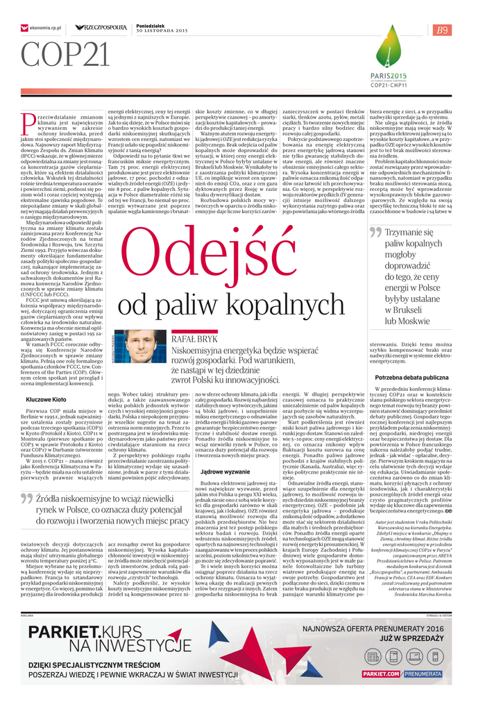 Poniedziałek ◊ ekonomia.rp.pl B9 30 listopada 2015 COP21 Kluczowe Kioto Pierwsza COP miała miejsce w Berlinie w 1995 r., jednak najważniejsze ustalenia zostały poczynione podczas trzeciego spotkania (COP3) w Kyoto (Protokół z Kioto), COP11 w Montrealu (pierwsze spotkanie po COP3 w sprawie Protokołu z Kioto) oraz COP17 w Durbanie (utworzenie Funduszu Klimatycznego). W 2015 r. COP21 – znana również jako Konferencja Klimatyczna w Paryżu – będzie miała na celu ustalenie pierwszych prawnie wiążących energii elektrycznej, ceny tej energii są jednymi z najniższych w Europie. Jak to się dzieje, że w Polsce mówi się o bardzo wysokich kosztach gospodarki niskoemisyjnej skutkujących wzrostem cen energii, natomiast we Francji udało się pogodzić niskoemisyjność z tanią energią? Odpowiedź na to pytanie tkwi we francuskim miksie energetycznym. Tam 75 proc. energii elektrycznej produkowane jest przez elektrownie jądrowe, 17 proc. pochodzi z odnawialnych źródeł energii (OZE) i jedynie 8 proc. z paliw kopalnych. Sytuacja w Polsce diametralnie różni się od tej we Francji, bo niemal 90 proc. energii wytwarzane jest poprzez spalanie węgla kamiennego i brunat- REKLAMA <\t> zanieczyszczeń w postaci tlenków siarki, tlenków azotu, pyłów, metali ciężkich. To tworzenie nowych miejsc pracy i bardzo silny bodziec dla rozwoju całej gospodarki. Pokrycie podstawowego zapotrzebowania na energię elektryczną przez energetykę jądrową stanowi nie tylko gwarancję stabilnych dostaw energii, ale również znaczne obniżenie emisyjności całego sektora. Wysoka koncentracja energii w paliwie oznacza znikomą ilość odpadów oraz łatwość ich przechowywania. Co więcej, w perspektywie rozwoju reaktorów prędkich (IV generacji) istnieje możliwość dalszego wykorzystania zużytego paliwa oraz jego powielania jako wtórnego źródła od paliw kopalnych RAFAŁ BRYK Niskoemisyjna energetyka będzie wspierać rozwój gospodarki. Pod warunkiem, że nastąpi w tej dziedzinie zwrot Polski ku innowacyjności. nego. Wobec takiej struktury produkcji, a także zaawansowanego wieku polskich jednostek wytwórczych i wysokiej emisyjności gospodarki, Polska z niepokojem przyjmuje wszelkie sugestie na temat zaostrzenia norm emisyjnych. Przez to postrzegana jest w środowisku międzynarodowym jako państwo przeciwdziałające staraniom na rzecz ochrony klimatu. Z perspektywy polskiego rządu przeciwdziałanie zaostrzaniu polityki klimatycznej wydaje się uzasadnione, jednak w parze z tymi działaniami powinien pójść zdecydowany, Źródła niskoemisyjne to wciąż niewielki rynek w Polsce, co oznacza duży potencjał do rozwoju i tworzenia nowych miejsc pracy światowych decyzji dotyczących ochrony klimatu. Jej postanowienia mają służyć utrzymaniu globalnego wzrostu temperatury poniżej 2°C. Miejsce wybrane na tę przełomową konferencję wydaje się nieprzypadkowe. Francja to sztandarowy przykład gospodarki niskoemisyjnej w energetyce. Co więcej, pomimo tak przyjaznej dla środowiska produkcji skie koszty zmienne, co w długiej perspektywie czasowej – po amortyzacji kosztów kapitałowych – prowadzi do produkcji taniej energii. Ważnym atutem rozwoju energetyki jądrowej i OZE jest redukcja ryzyka politycznego. Brak odejścia od paliw kopalnych może doprowadzić do sytuacji, w której ceny energii elektrycznej w Polsce byłyby ustalane w Brukseli lub Moskwie. Wynikałoby to z zaostrzania polityki klimatycznej UE, co implikuje wzrost cen uprawnień do emisji CO2, oraz z cen gazu dyktowanych przez Rosję w razie braku dywersyfikacji dostaw. Rozbudowa polskich mocy wytwórczych w oparciu o źródła niskoemisyjne daje liczne korzyści zarów- Odejść MATERIAŁY PRASOWE P rzeciwdziałanie zmianom klimatu jest największym wyzwaniem w zakresie ochrony środowiska, przed jakim stoi społeczność międzynarodowa. Najnowszy raport Międzyrządowego Zespołu ds. Zmian Klimatu (IPCC) wskazuje, że w głównej mierze odpowiedzialna za zmiany jest rosnąca koncentracja gazów cieplarnianych, które są efektem działalności człowieka. Wskutek tej działalności rośnie średnia temperatura oceanów i powierzchni ziemi, podnosi się poziom wód i coraz częściej występują ekstremalne zjawiska pogodowe. Te niepożądane zmiany w skali globalnej wymagają działań prewencyjnych o zasięgu międzynarodowym. Międzynarodowa odpowiedź polityczna na zmiany klimatu została zainicjowana przez Konferencję Narodów Zjednoczonych na temat Środowiska i Rozwoju, tzw. Szczytu Ziemi 1992. Przyjęto wówczas dokumenty określające fundamentalne zasady polityki społeczno-gospodarczej, nakazujące implementację zasad ochrony środowiska. Jednym z uchwalonych dokumentów jest Ramowa konwencja Narodów Zjednoczonych w sprawie zmiany klimatu (UNFCCC lub FCCC). FCCC jest umową określającą założenia współpracy międzynarodowej, dotyczącej ograniczenia emisji gazów cieplarnianych oraz wpływu człowieka na środowisko naturalne. Konwencja ma obecnie niemal ogólnoświatowy zasięg w postaci 195 zaangażowanych państw. W ramach FCCC corocznie odbywają się Konferencje Narodów Zjednoczonych w sprawie zmiany klimatu. Pełnią one rolę formalnego spotkania członków FCCC, tzw. Conferences of the Parties (COP). Głównym celem spotkań jest przegląd i ocena implementacji konwencji. acz rozsądny zwrot ku gospodarce niskoemisyjnej. Wysoka kapitałochłonność inwestycji w niskoemisyjne źródła może zniechęcić potencjalnych inwestorów, jednak rolą państwa jest zapewnienie warunków dla rozwoju „czystych” technologii. Należy podkreślić, że wysokie koszty inwestycyjne niskoemisyjnych źródeł są kompensowane przez ni- no w sferze ochrony klimatu, jak i dla całej gospodarki. Rozwój najbardziej stabilnych mocy wytwórczych, jakimi są bloki jądrowe, i uzupełnienie miksu energetycznego o odnawialne źródła energii i bloki gazowo-parowe gwarantuje bezpieczeńst