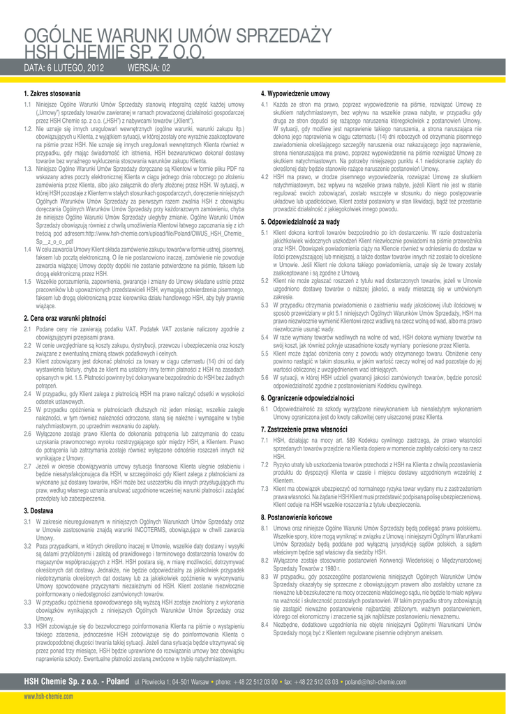 OGÓLNE WARUNKI UMÓW SPRZEDAŻY HSH CHEMIE SP. Z O.O. DATA: 6 lutego, 2012 WERSJA: 02 1. Zakres stosowania 4. Wypowiedzenie umowy 1.1 Niniejsze Ogólne Warunki Umów Sprzedaży stanowią integralną część każdej umowy („Umowy”) sprzedaży towarów zawieranej w ramach prowadzonej działalności gospodarczej przez HSH Chemie sp. z o.o. („HSH”) z nabywcami towarów („Klient”). 1.2. Nie uznaje się innych uregulowań wewnętrznych (ogólne warunki, warunki zakupu itp.) obowiązujących u Klienta, z wyjątkiem sytuacji, w której zostały one wyraźnie zaakceptowane na piśmie przez HSH. Nie uznaje się innych uregulowań wewnętrznych Klienta również w przypadku, gdy mając świadomość ich istnienia, HSH bezwarunkowo dokonał dostawy towarów bez wyraźnego wykluczenia stosowania warunków zakupu Klienta. 1.3. Niniejsze Ogólne Warunki Umów Sprzedaży doręczane są Klientowi w formie pliku PDF na wskazany adres poczty elektronicznej Klienta w ciągu jednego dnia roboczego po złożeniu zamówienia przez Klienta, albo jako załącznik do oferty złożonej przez HSH. W sytuacji, w której HSH pozostaje z Klientem w stałych stosunkach gospodarczych, doręczenie niniejszych Ogólnych Warunków Umów Sprzedaży za pierwszym razem zwalnia HSH z obowiązku doręczania Ogólnych Warunków Umów Sprzedaży przy każdorazowym zamówieniu, chyba że niniejsze Ogólne Warunki Umów Sprzedaży uległyby zmianie. Ogólne Warunki Umów Sprzedaży obowiązują również z chwilą umożliwienia Klientowi łatwego zapoznania się z ich treścią pod adresem:http://www.hsh-chemie.com/upload/file/Poland/OWUS_HSH_Chemie_ Sp__z_o_o_.pdf 1.4 W celu zawarcia Umowy Klient składa zamówienie zakupu towarów w formie ustnej, pisemnej, faksem lub pocztą elektroniczną. O ile nie postanowiono inaczej, zamówienie nie powoduje zawarcia wiążącej Umowy dopóty dopóki nie zostanie potwierdzone na piśmie, faksem lub drogą elektroniczną przez HSH. 1.5 Wszelkie porozumienia, zapewnienia, gwarancje i zmiany do Umowy składane ustnie przez pracowników lub upoważnionych przedstawicieli HSH, wymagają potwierdzenia pisemnego, faksem lub drogą elektroniczną przez kierownika działu handlowego HSH, aby były prawnie wiążące. 4.1 Każda ze stron ma prawo, poprzez wypowiedzenie na piśmie, rozwiązać Umowę ze skutkiem natychmiastowym, bez wpływu na wszelkie prawa nabyte, w przypadku gdy druga ze stron dopuści się rażącego naruszenia któregokolwiek z postanowień Umowy. W sytuacji, gdy możliwe jest naprawienie takiego naruszenia, a strona naruszająca nie dokona jego naprawienia w ciągu czternastu (14) dni roboczych od otrzymania pisemnego zawiadomienia określającego szczegóły naruszenia oraz nakazującego jego naprawienie, strona nienaruszająca ma prawo, poprzez wypowiedzenie na piśmie rozwiązać Umowę ze skutkiem natychmiastowym. Na potrzeby niniejszego punktu 4.1 niedokonanie zapłaty do określonej daty będzie stanowiło rażące naruszenie postanowień Umowy. 4.2 HSH ma prawo, w drodze pisemnego wypowiedzenia, rozwiązać Umowę ze skutkiem natychmiastowym, bez wpływu na wszelkie prawa nabyte, jeżeli Klient nie jest w stanie regulować swoich zobowiązań, zostało wszczęte w stosunku do niego postępowanie układowe lub upadłościowe, Klient został postawiony w stan likwidacji, bądź też przestanie prowadzić działalność z jakiegokolwiek innego powodu. 5. Odpowiedzialność za wady 5.1 Klient dokona kontroli towarów bezpośrednio po ich dostarczeniu. W razie dostrzeżenia jakichkolwiek widocznych uszkodzeń Klient niezwłocznie powiadomi na piśmie przewoźnika oraz HSH. Obowiązek powiadomienia ciąży na Kliencie również w odniesieniu do dostaw w ilości przewyższającej lub mniejszej, a także dostaw towarów innych niż zostało to określone w Umowie. Jeśli Klient nie dokona takiego powiadomienia, uznaje się że towary zostały zaakceptowane i są zgodne z Umową. 5.2 Klient nie może zgłaszać roszczeń z tytułu wad dostarczonych towarów, jeżeli w Umowie uzgodniono dostawę towarów o niższej jakości, a wady mieszczą się w umówionym zakresie. 5.3 W przypadku otrzymania powiadomienia o zaistnieniu wady jakościowej i/lub ilościowej w sposób przewidziany w pkt 5.1 niniejszych Ogólnych Warunków Umów Sprzedaży, HSH ma prawo niezwłocznie wymienić Klientowi rzecz wadliwą na rzecz wolną od wad, albo ma prawo niezwłocznie usunąć wady. 5.4 W razie wymiany towarów wadliwych na wolne od wad, HSH dokona wymiany towarów na swój koszt, jak również pokryje uzasadnione koszty wymiany poniesione przez Klienta. 5.5 Klient może żądać obniżenia ceny z powodu wady otrzymanego towaru. Obniżenie ceny powinno nastąpić w takim stosunku, w jakim wartość rzeczy wolnej od wad pozostaje do jej wartości obliczonej z uwzględnieniem wad istniejących. 5.6 W sytuacji, w której HSH udzieli gwarancji jakości zamówionych towarów, będzie ponosić odpowiedzialność zgodnie z postanowieniami Kodeksu cywilnego. 2. Cena oraz warunki płatności 2.1 Podane ceny nie zawierają podatku VAT. Podatek VAT zostanie naliczony zgodnie z obowiązującymi przepisami prawa. 2.2 W cenie uwzględniane są koszty zakupu, dystrybucji, przewozu i ubezpieczenia oraz koszty związane z ewentualną zmianą stawek podatkowych i celnych. 2.3 Klient zobowiązany jest dokonać płatności za towary w ciągu czternastu (14) dni od daty wystawienia faktury, chyba że klient ma ustalony inny termin płatności z HSH na zasadach opisanych w pkt. 1.5. Płatności powinny być dokonywane bezpośrednio do HSH bez żadnych potrąceń. 2.4 W przypadku, gdy Klient zalega z płatnością HSH ma prawo naliczyć odsetki w wysokości odsetek ustawowych. 2.5 W przypadku opóźnienia w płatnościach dłuższych niż jeden miesiąc, wszelkie zaległe należności, w tym również należności odroczone, staną się należne i wymagalne w trybie natychmiastowym, po uprzednim wezwaniu do