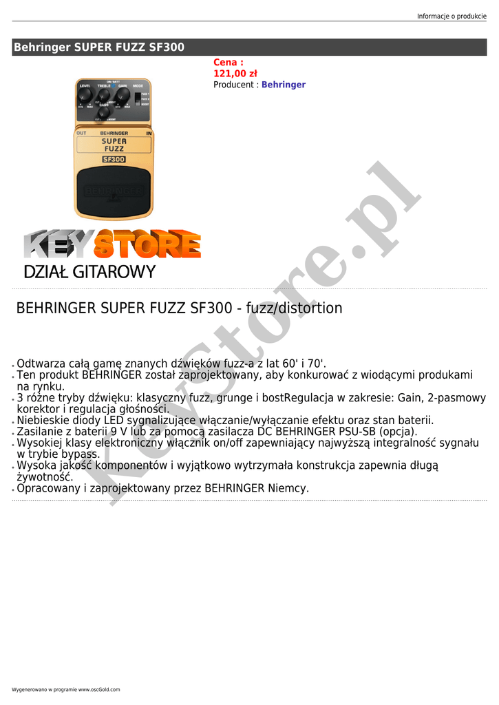 Informacje o produkcie Behringer SUPER FUZZ SF300 Cena : 121,00 zł or e. pl Producent : Behringer ● ● ● ● ● ● Odtwarza całą gamę znanych dźwięków fuzz-a z lat 60' i 70'. Ten produkt BEHRINGER został zaprojektowany, aby konkurować z wiodącymi produkami na rynku. 3 różne tryby dźwięku: klasyczny fuzz, grunge i bostRegulacja w zakresie: Gain, 2-pasmowy korektor i regulacja głośności. Niebieskie diody LED sygnalizujące włączanie/wyłączanie efektu oraz stan baterii. Zasilanie z baterii 9 V lub za pomocą zasilacza DC BEHRINGER PSU-SB (opcja). Wysokiej klasy elektroniczny włącznik on/off zapewniający najwyższą integralność sygnału w trybie bypass. Wysoka jakość komponentów i wyjątkowo wytrzymała konstrukcja zapewnia długą żywotność. Opracowany i zaprojektowany przez BEHRINGER Niemcy. ey ● K ● St BEHRINGER SUPER FUZZ SF300 - fuzz/distortion Wygenerowano w programie www.oscGold.com
