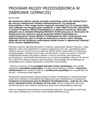 PROGRAM MŁODY PRZEDSIĘBIORCA W DĄBROWIE GÓRNICZEJ 06.09.2016 Jak skutecznie dobrać zestaw narzędzi marketingu online dla młodej firmy? Jak mierzyć efektywność działań marketingowych? Czy działania wizerunkowe w sieci mogą realnie wspierać sprzedaż? Już 15 września 2016 roku odbędzie się inauguracyjne spotkanie z cyklu Mała Firma ALL INCLUSIVE w ramach Programu Młody Przedsiębiorca w Dąbrowie Górniczej. Warsztat odbędzie się w siedzibie Miejskiej Biblioteki Publicznej przy ul. Kościuszki 25. Wydarzenie jest częścią III edycji programu Młody Przedsiębiorca, realizowanej przez Forum Młodych Przedsiębiorców RIG w Katowicach oraz Dąbrowę Górniczą. Jest to drugie po Katowicach miasto, które oficjalne dołączyło do tej inicjatywy wspierającej młody biznes w Aglomeracji Śląskiej i teraz również Zagłębiowskiej. Pierwszy warsztat dąbrowskiej odsłony Programu poprowadzi Ekspert Programu– Kuba Nagórski, który jest wspólnikiem w agencji kreatywnej kręci się!, współzałożycielem software house'u revolve.pro oraz startupu ABYSS GLASS. Specjalista od marketingu zintegrowanego, miłośnik social media, szkoleniowiec i mówca w wolnych chwilach. Przeprowadził ponad 1400 godzin szkoleń z rożnych obszarów, dla organizacji pozarządowych, podmiotów biznesowych czy w ramach projektów unijnych. W ramach tych ostatnich realizuje również cykle doradztwa biznesowego dla początkujących przedsiębiorców. Inicjator Katowickich Czwartków Social Media. - Podczas warsztatu zrobię przegląd narzędzi online marketingu oraz pokażę zewnętrzne narzędzia wspierające. Do tego porozmawiamy również o mierzeniu efektywności tych działań w oparciu o praktyczne przykłady jako uzupełnienie do tematu – komentuje Kuba Nagórski. Wrześniowe spotkanie jest częścią programu Młody Przedsiębiorca, organizowanego przez Forum Młodych Przedsiębiorców Regionalnej Izby Gospodarczej w Katowicach. Inicjatywa ta kierowana jest do Młodych Przedsiębiorców - osób do 35. roku życia i prowadzą firmę nie dłużej niż trzy lata. Edycja w Dąbrowie Górniczej stanowi pierwszy cykl spotkań realizowany poza stolicą województwa śląskiego. Udział w Programie jest bezpłatny po uprzedniej rejestracji. Szczegółowe informacje oraz zapisy dostępne są na stronie www.mlodyprzedsiebiorca.org