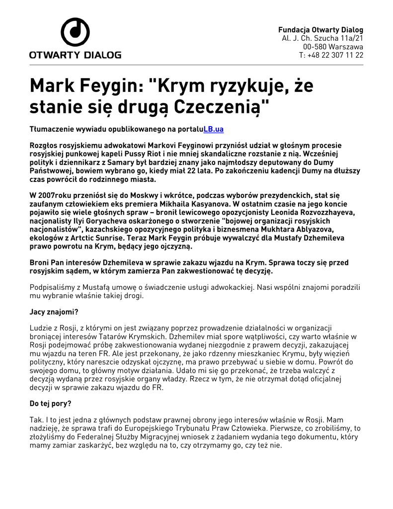 Fundacja Otwarty Dialog Al. J. Ch. Szucha 11a/21 00-580 Warszawa T: +48 22 307 11 22 Mark Feygin: "Krym ryzykuje, że stanie się drugą Czeczenią" Tłumaczenie wywiadu opublikowanego na portaluLB.ua Rozgłos rosyjskiemu adwokatowi Markovi Feyginowi przyniósł udział w głośnym procesie rosyjskiej punkowej kapeli Pussy Riot i nie mniej skandaliczne rozstanie z nią. Wcześniej polityk i dziennikarz z Samary był bardziej znany jako najmłodszy deputowany do Dumy Państwowej, bowiem wybrano go, kiedy miał 22 lata. Po zakończeniu kadencji Dumy na dłuższy czas powrócił do rodzinnego miasta. W 2007roku przeniósł się do Moskwy i wkrótce, podczas wyborów prezydenckich, stał się zaufanym człowiekiem eks premiera Mikhaila Kasyanova. W ostatnim czasie na jego koncie pojawiło się wiele głośnych spraw – bronił lewicowego opozycjonisty Leonida Rozvozzhayeva, nacjonalisty Ilyi Goryacheva oskarżonego o stworzenie "bojowej organizacji rosyjskich nacjonalistów", kazachskiego opozycyjnego polityka i biznesmena Mukhtara Ablyazova, ekologów z Artctic Sunrise. Teraz Mark Feygin próbuje wywalczyć dla Mustafy Dzhemileva prawo powrotu na Krym, będący jego ojczyzną. Broni Pan interesów Dzhemileva w sprawie zakazu wjazdu na Krym. Sprawa toczy się przed rosyjskim sądem, w którym zamierza Pan zakwestionować tę decyzję. Podpisaliśmy z Mustafą umowę o świadczenie usługi adwokackiej. Nasi wspólni znajomi poradzili mu wybranie właśnie takiej drogi. Jacy znajomi? Ludzie z Rosji, z którymi on jest związany poprzez prowadzenie działalności w organizacji broniącej interesów Tatarów Krymskich. Dzhemilev miał spore wątpliwości, czy warto właśnie w Rosji podejmować próbę zakwestionowania wydanej niezgodnie z prawem decyzji, zakazującej mu wjazdu na teren FR. Ale jest przekonany, że jako rdzenny mieszkaniec Krymu, były więzień polityczny, który nareszcie odzyskał ojczyznę, ma prawo przebywać u siebie w domu. Powrót do swojego domu, to główny motyw działania. Udało mi się go przekonać, że trzeba walczyć z decyzją wydaną przez rosyjskie organy władzy. Rzecz w tym, że nie otrzymał dotąd oficjalnej decyzji w sprawie zakazu wjazdu do FR. Do tej pory? Tak. I to jest jedna z głównych podstaw prawnej obrony jego interesów właśnie w Rosji. Mam nadzieję, że sprawa trafi do Europejskiego Trybunału Praw Człowieka. Pierwsze, co zrobiliśmy, to złożyliśmy do Federalnej Służby Migracyjnej wniosek z żądaniem wydania tego dokumentu, który mamy zamiar zaskarżyć, bez względu na to, czy otrzymamy go, czy też nie. Jak dawno został złożony wniosek? Na początku czerwca. Odpowiedzi należy się spodziewać na początku lipca. Ale sytuacja w Rosji jest taka, że brak odpowiedzi, to też jest pewien sygnał dla prowadzenia dalszych działań. Dalej będzie złożenie pozwu cywilnego. Żeby móc złożyć pozew do ETPC trzeba przejść dwa etapy– rozpatrzenie pozwu pod względem merytorycznym i złożenie skargi. Tak wygląda ściśle prawny aspekt tej sprawy. Równolegle sam Mustafa Dzhemilev czyni starania – zarówno na Ukrainie, jak i w różnych instancjach europejskich – z różnym powodzeniem. Dlatego że niezwykle trudno jest wpływać na Rosję. Ale jest jeszcze polityczna strona sprawy. Ma się rozumieć. Jego sprawą zajmuje się bezpośrednio FSB. Ja znam tamtejsze nastawienie, oni pod żadnym pozorem nie mają zamiaru wypuścić Dzhemileva na Krym. Zamierzają też podjąć działania represyjne w stosunku do aktywistów krymskotatarskich, żeby zdławić wszelki opór z ich strony. Sprawa Dzhemileva, to sygnał dla całego narodu krymskotatarskiego? Bez wątpienia. Z politycznego punktu widzenia, oni pokazują, jak będą działali wobec "niepokornych". FSB obawia się trochę aktywności krymskotatarskich aktywistów, wzrostu wpływu islamskich organizacji. W ich rozumieniu wszelki sprzeciw prowadzi do terroryzmu. Nienawidzą Dzhemileva jeszcze od czasów radzieckich, choć on jest bardziej humanistą. Oprócz tego jest ważne, aby rozumieć, że jeśli Putin wybierze sobie za cel osobistego wroga, to będzie działać długo i do końca. On rozmawiał z Dzhemilevem, próbował go przekonać, żeby stał się lojalny wobec nowej władzy na Krymie. Ale Mustafa mu odmówił. A Putin bardzo łatwo się obraża, dla niego to osobiste wyzwanie. Czy można liczyć na pozytywne rozwiązanie tej sprawy? W Rosji w ogóle nie ma niezawisłego sadu, dlatego poszukujemy publicznych sposobów obrony, które w istocie apelują nie do sądu, a do opinii społecznej, międzynarodowych instancji, w tym sądowych. Dzięki dużemu społecznemu naciskowi, który ma miejsce, nie wykluczam szansy na uzyskanie kompromisu. Nie wykluczałbym, że Kreml puści Dzhemileva na Krym, dlatego że we właściwy sposób ocenia ryzyko międzynarodowych nacisków, których jednak się obawia. Jak rosyjskie społeczeństwo odnosi się do Dzhemileva i Krymskich Tatarów? Propaganda zrobiła swoje. Na przykład w sieciach społecznościowych, w rosyjskiej prasie, rozchodzą się okropne opowieści na temat Krymskich Tatarów, samego Dzhemileva. Mówi się, że on zbyt długo siedział. Ale nikt się nie zastanawia, że 16 lat przesiedział na podstawie politycznych zarzutów. W Rosji jest postrzegany jako zwykły przestępca. Dlatego oczywiście, zasadniczo ta opinia jest negatywna. Jak na dziś przedstawia się sytuacja Krymskich Tatarów na terenie zaanektowanego Krymu? Uważam, że ich sytuacja jest na granicy rozpoczęcia prześladowań na wielką skalę. Przecież większość nie popiera przyłączenia Krymu do Rosji. Służby specjalne działają według sprawdzonego schematu, próbując kupić lojalność Krymskich Tatarów. Trwa kupowanie elit, a nie stwarza się narodowi możliwości do rozwoju pod względem socjalnym, gospodarczym i politycznym. Toczy się odwrotny proces, i Krym ryzykuje, że stanie się drugą Czeczenią. Czy myśli Pan, że Tatar